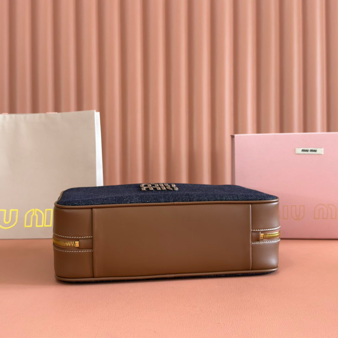 MIUMIU 25S BEAU DENIM BAG 34 IN DARK BLUE DENIM AND BROWN CALFSKIN
