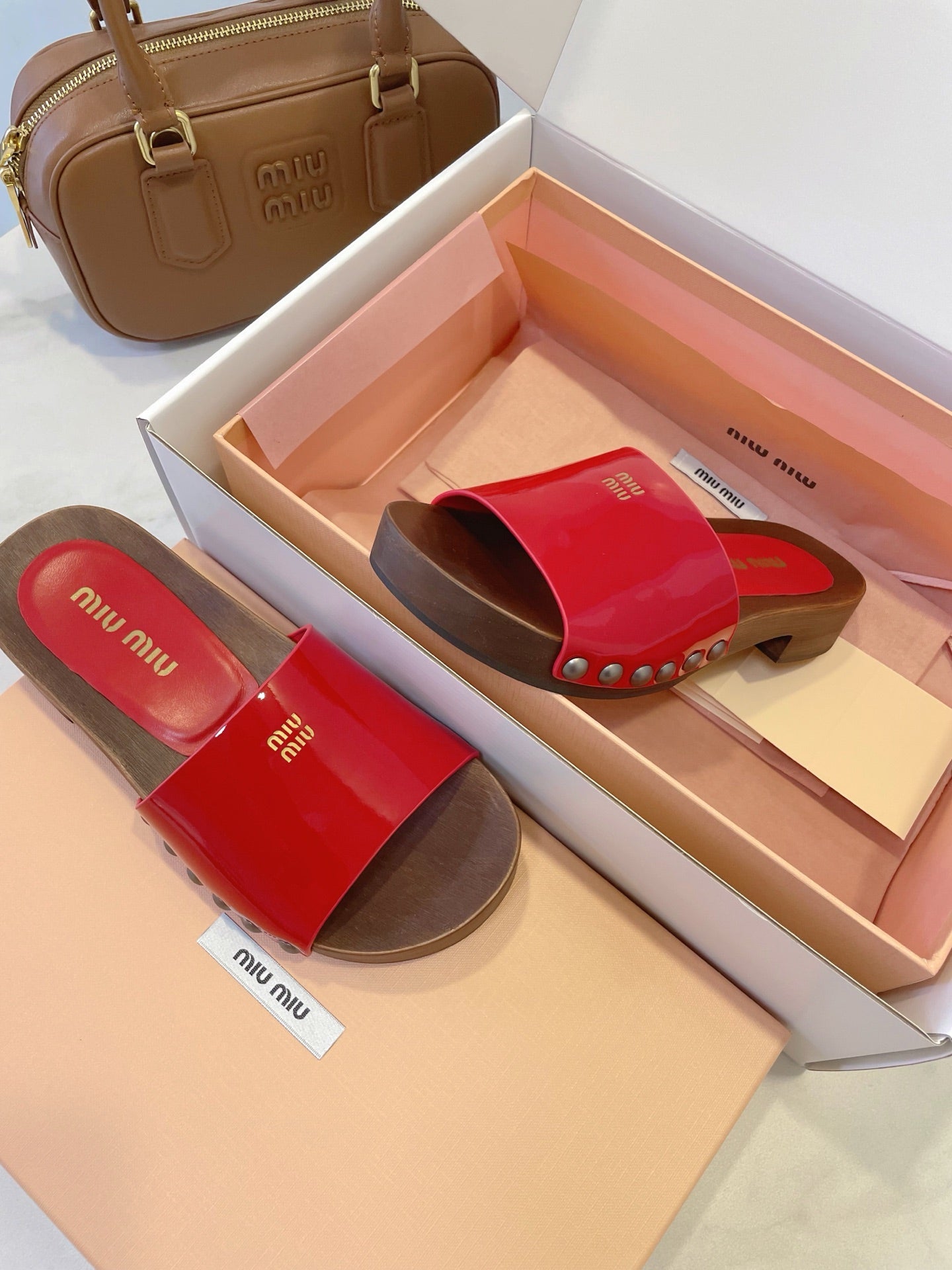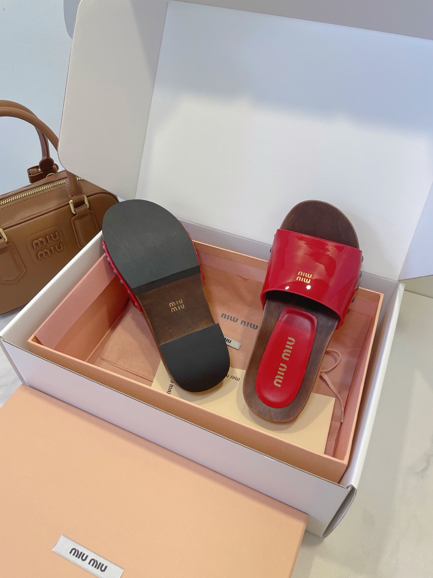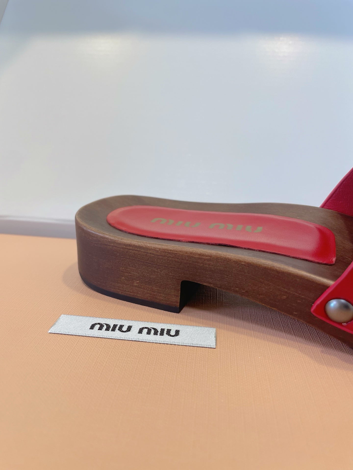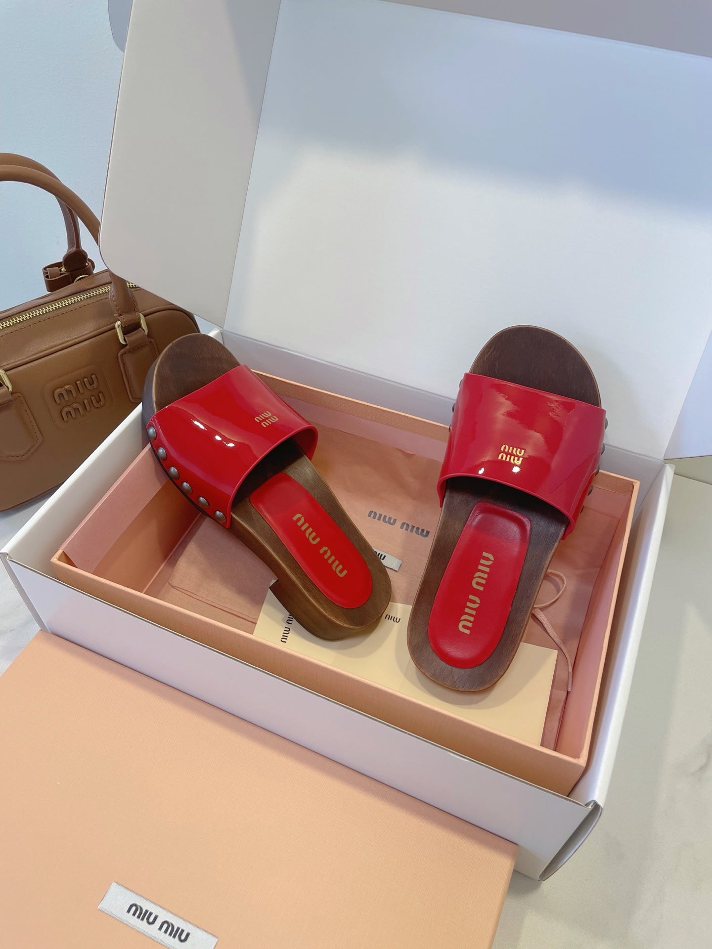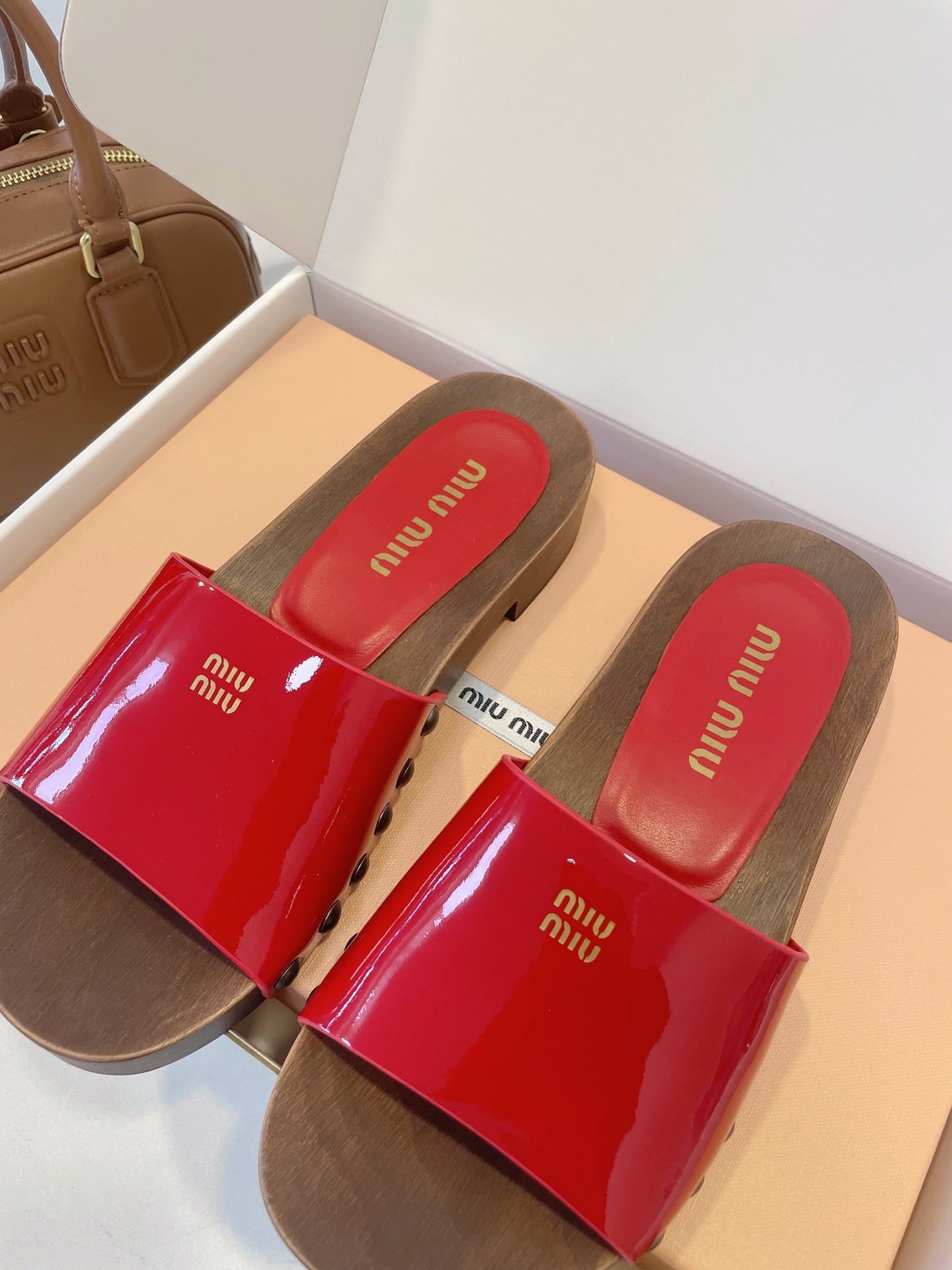 MM STUDDED SANDALS IN RED PATENT CALFSKIN AND WOOD