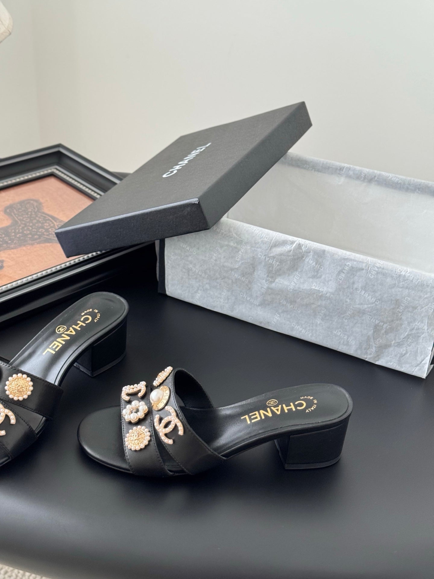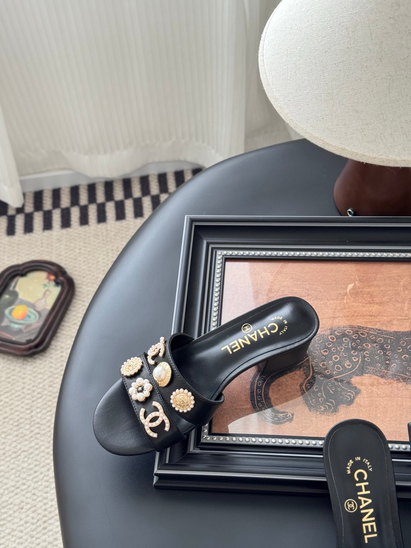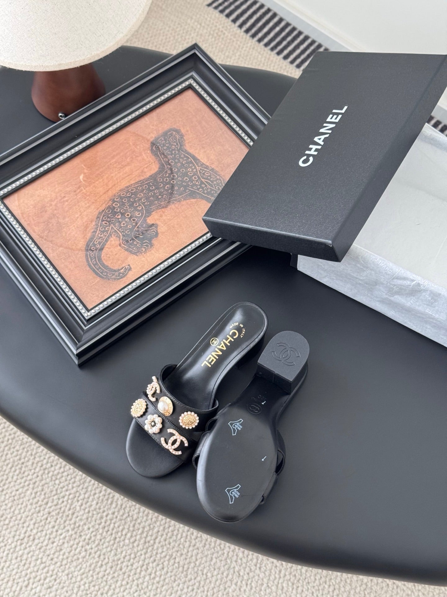 MULE SLIDE SANDALS IN BLACK LAMBSKIN WITH LOGO STICKER DETAIL