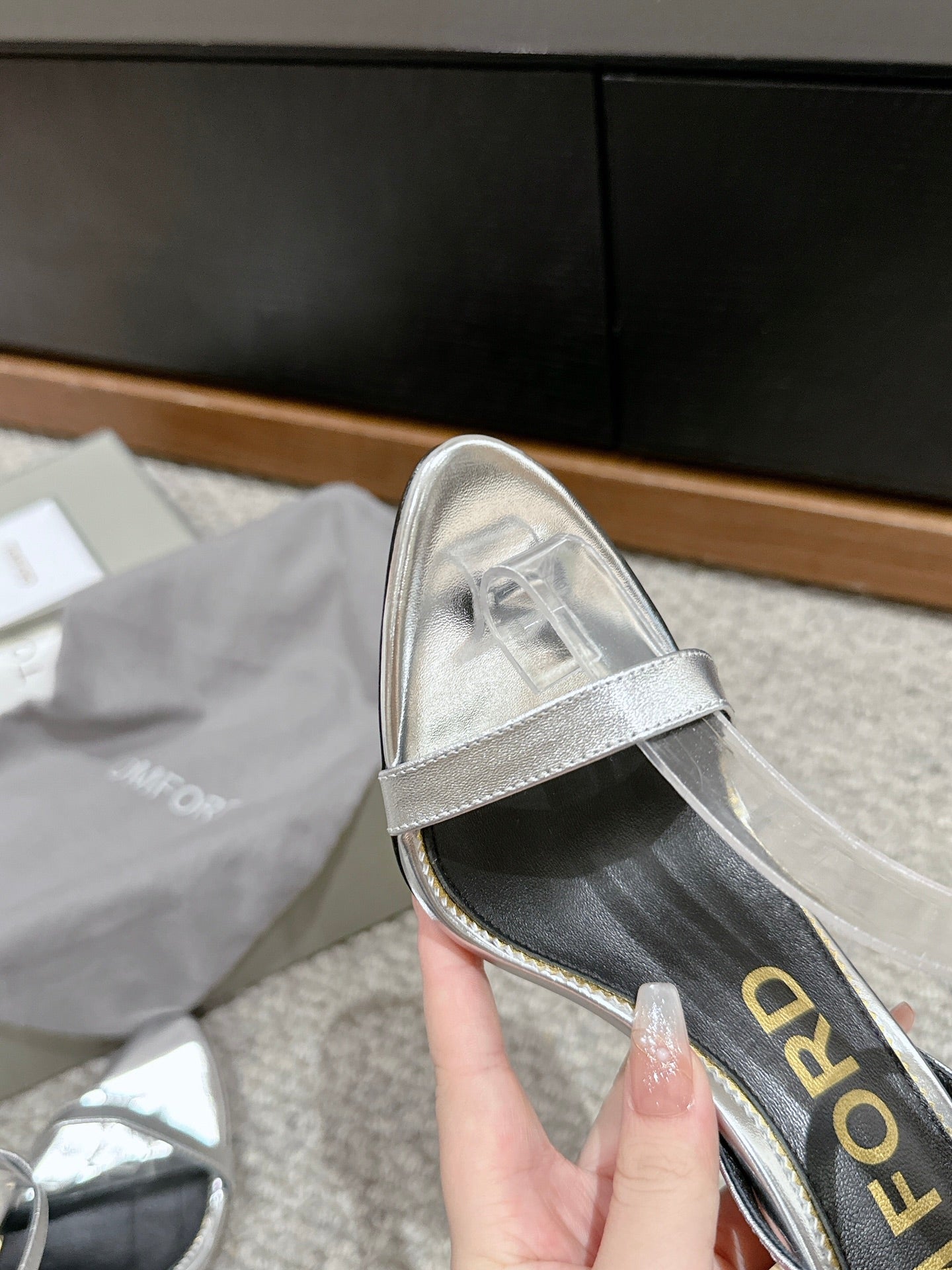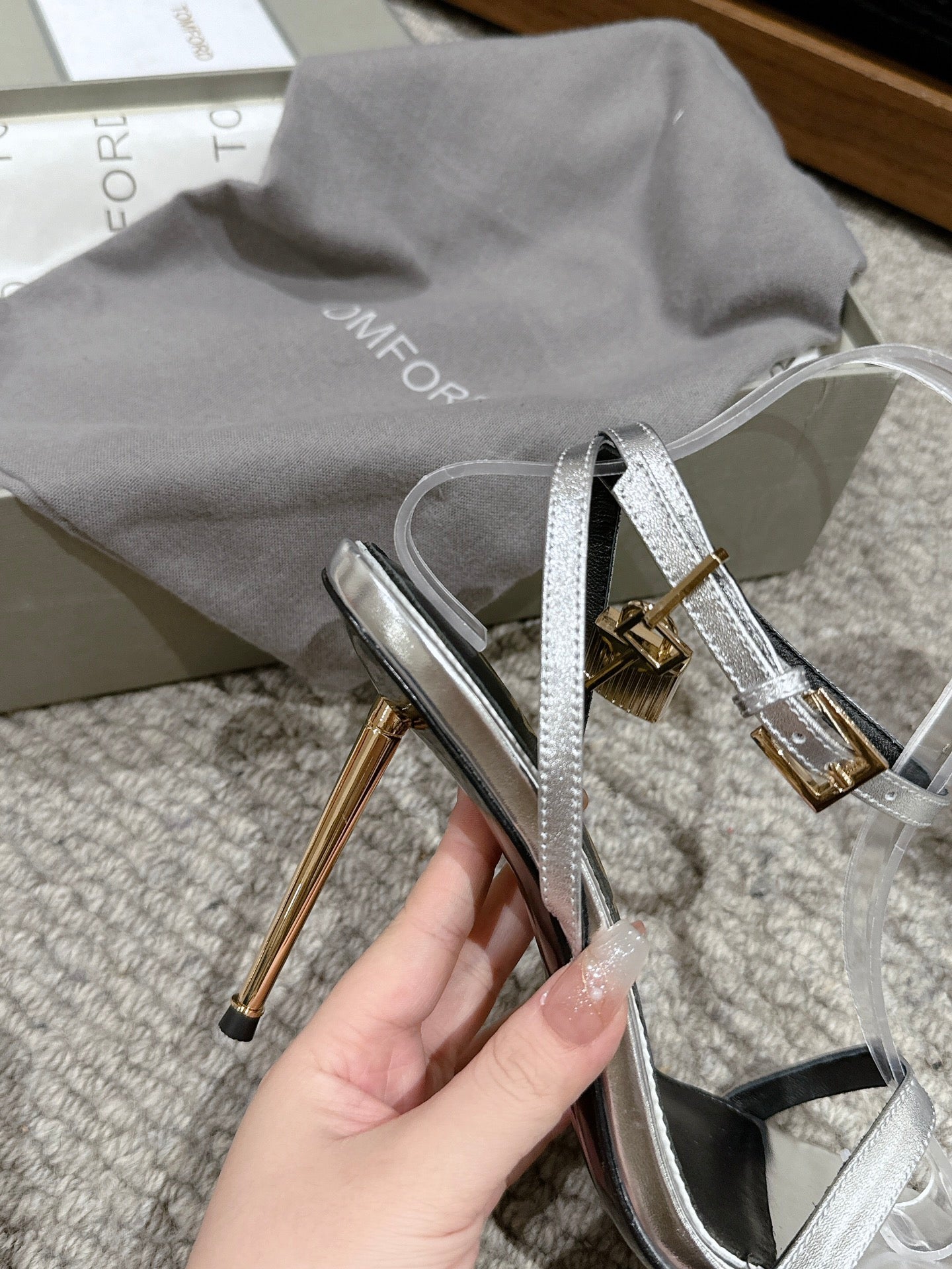 PADLOCK POINTY NAKED SANDAL 85 MM IN SILVER CALFSKIN