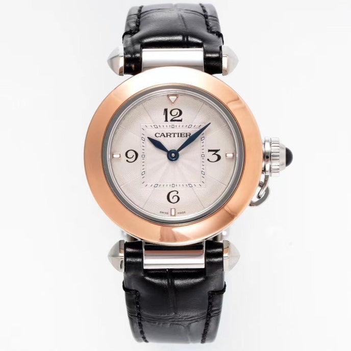 PASHA DE CARTIER WATCH ROSE GOLD AND SILVER CASE AND BLACK LEATHER STRAP