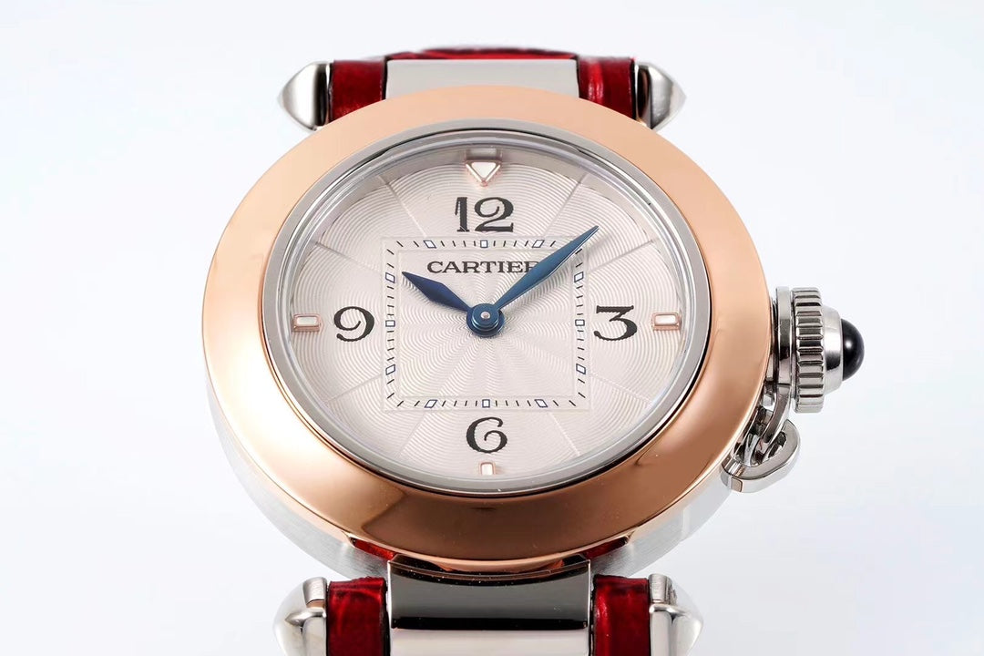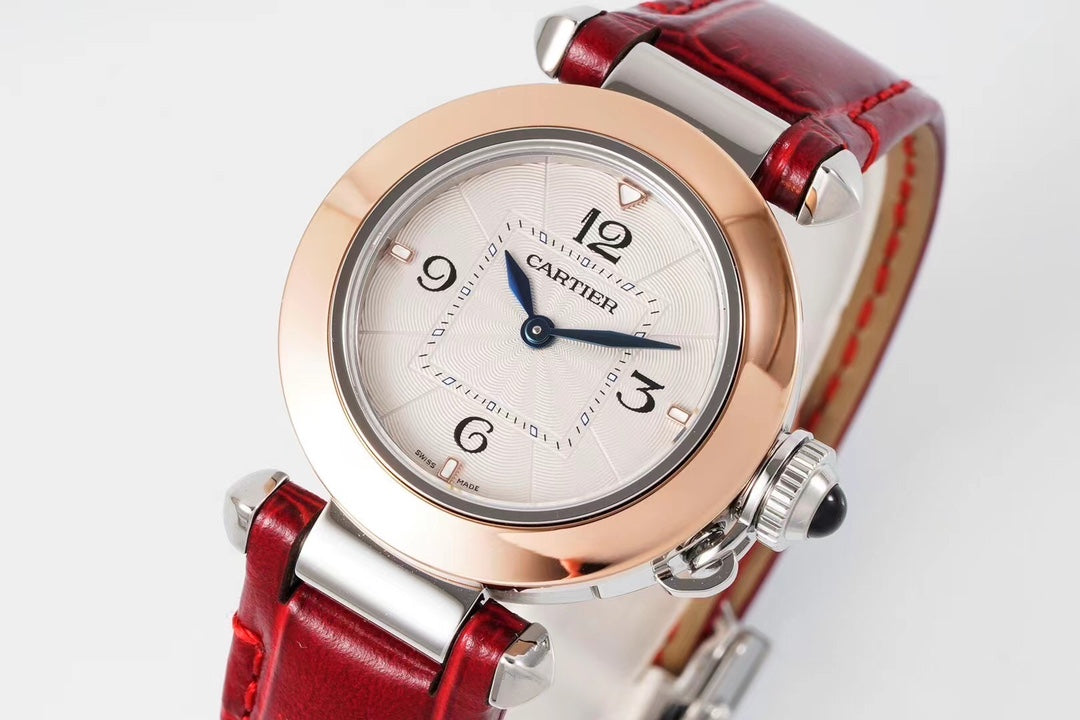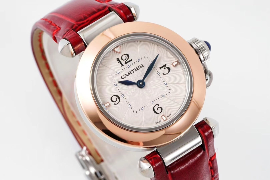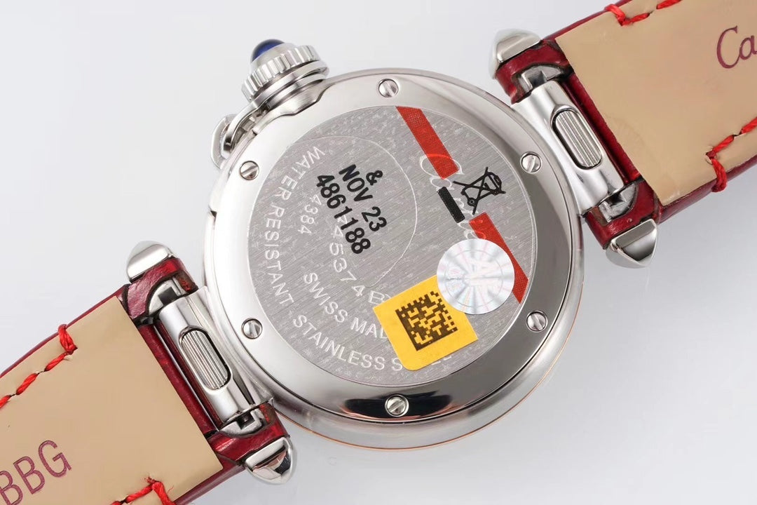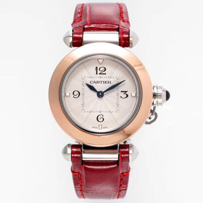 PASHA DE CARTIER WATCH ROSE GOLD AND SILVER CASE AND CRIMSON RED LEATHER STRAP