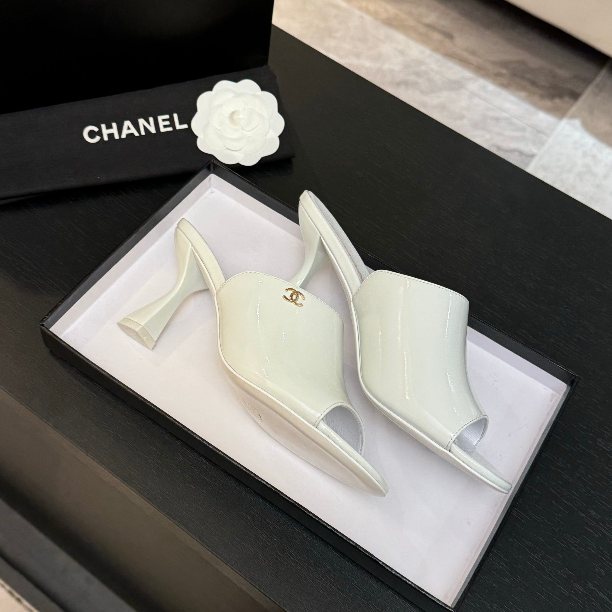 PEEP TOE MULE 85MM IN WHITE PATENT CALFSKIN