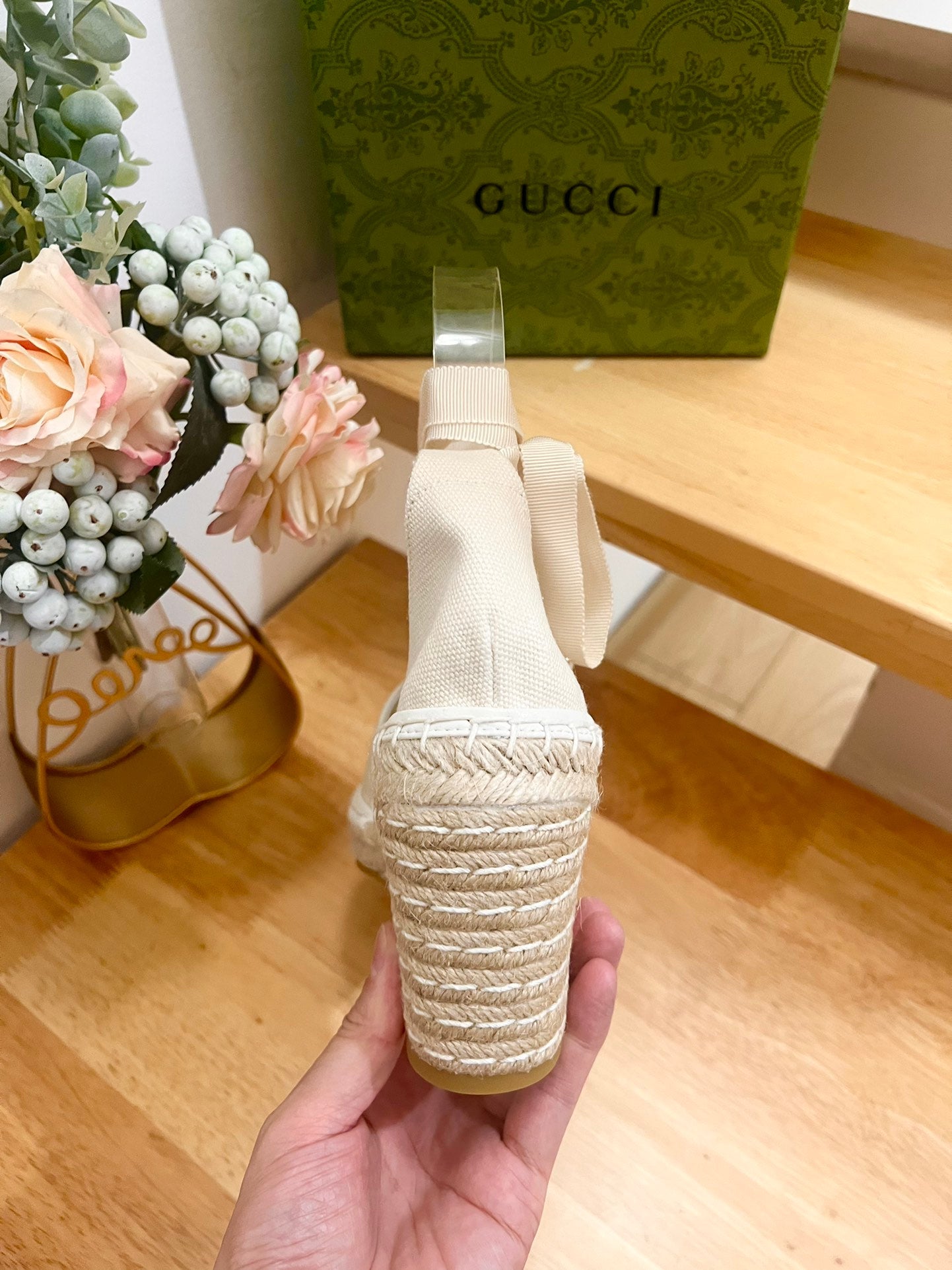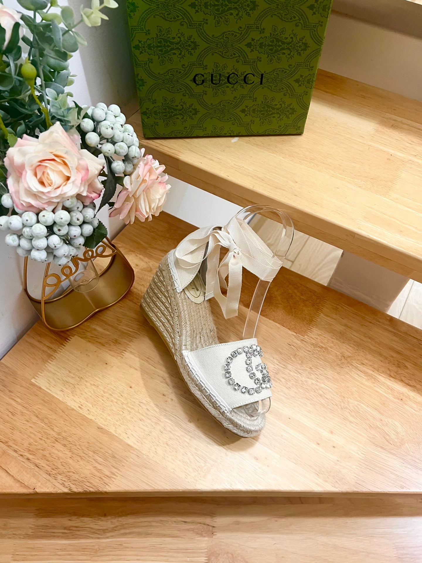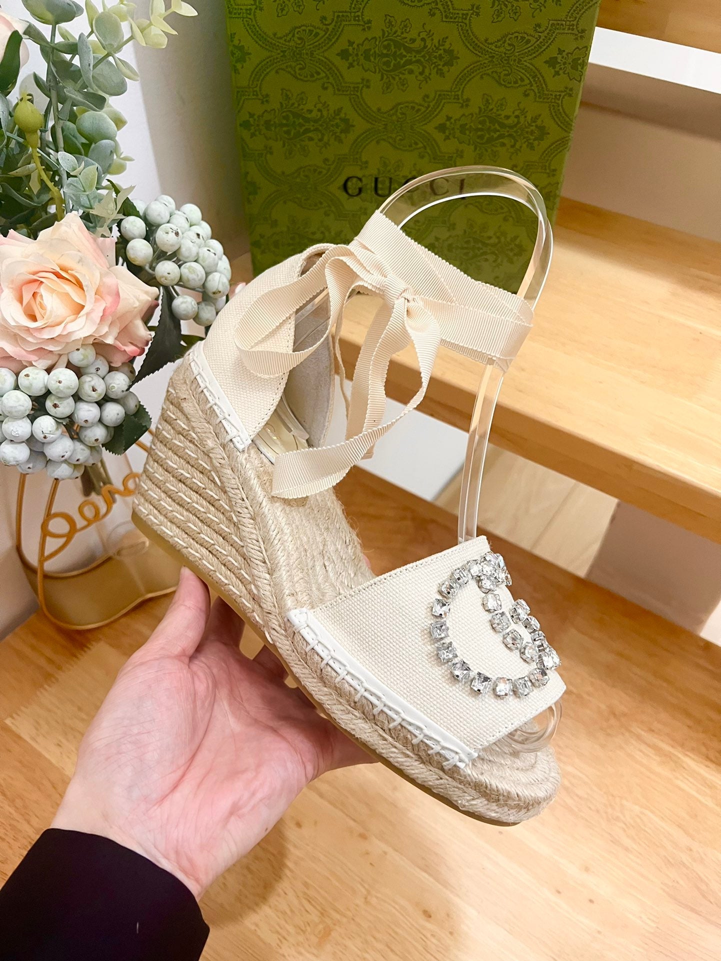 PLATFORM WITH RHINESTONE LOGO IN CREAM BEIGE CANVAS AND STRAW LINING