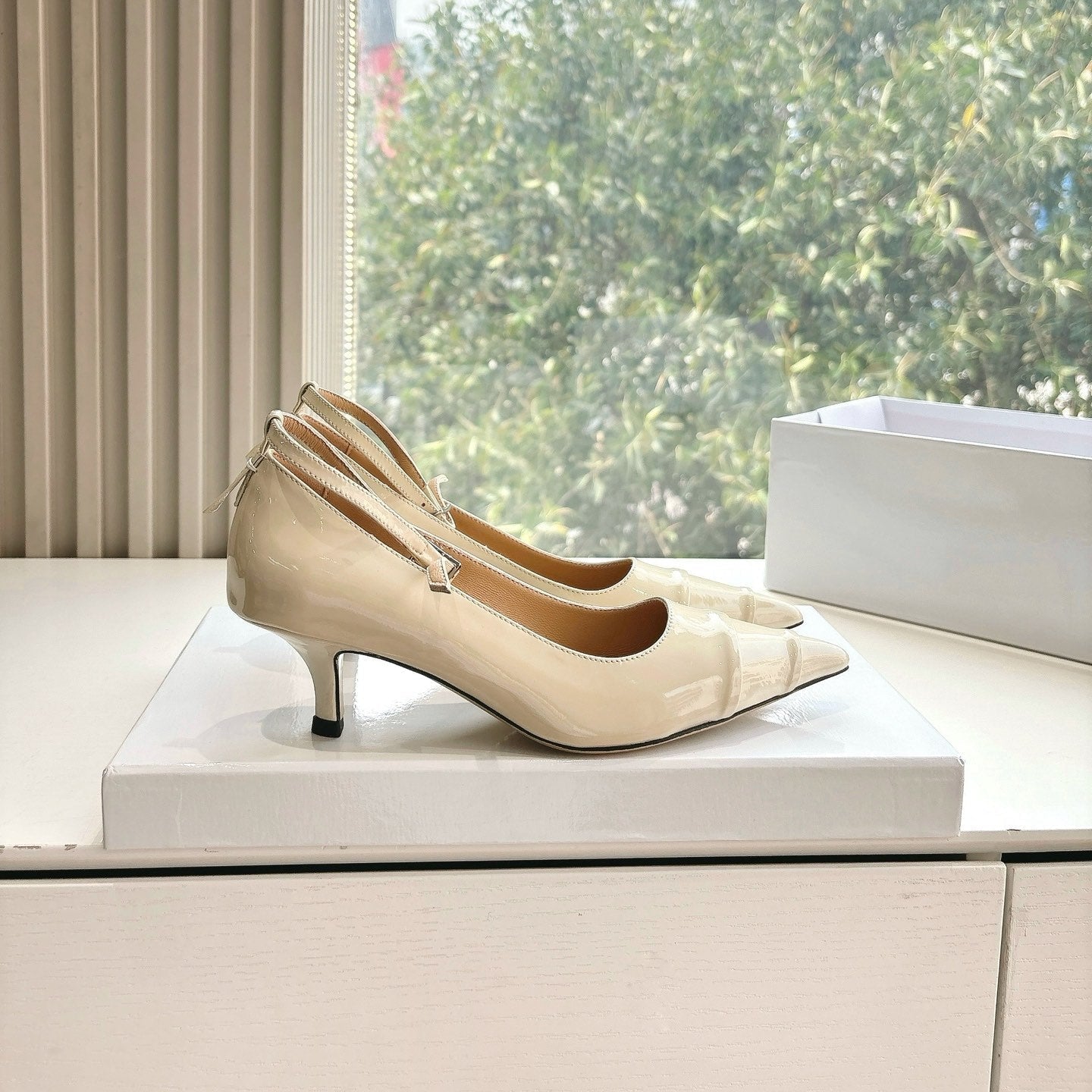 POINTED-TOE ANKLE STRAP PUMPS IN BEIGE PATENT CALFSKIN