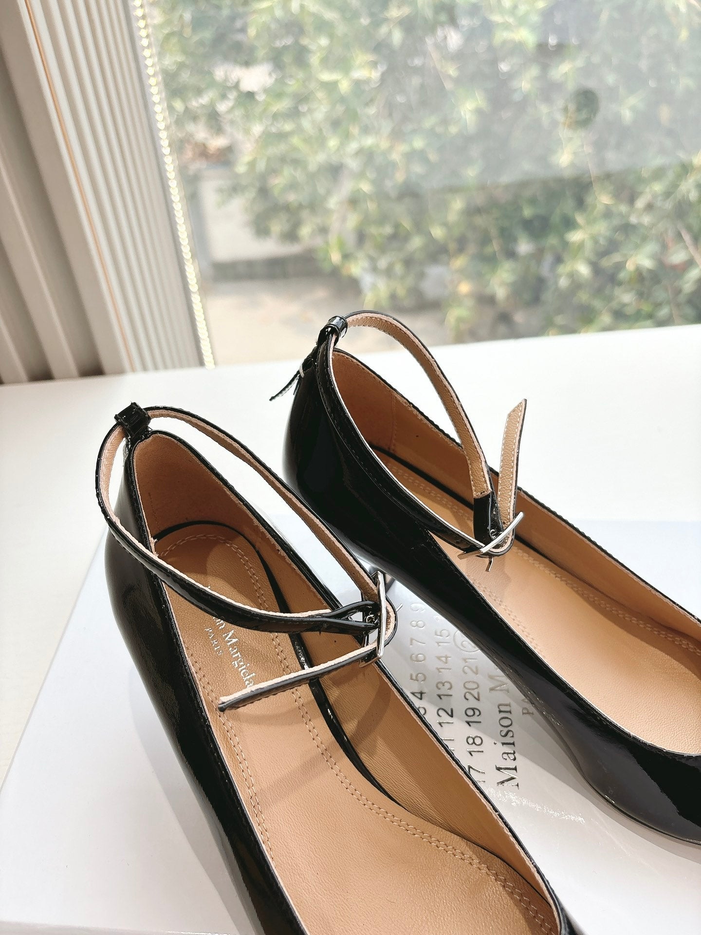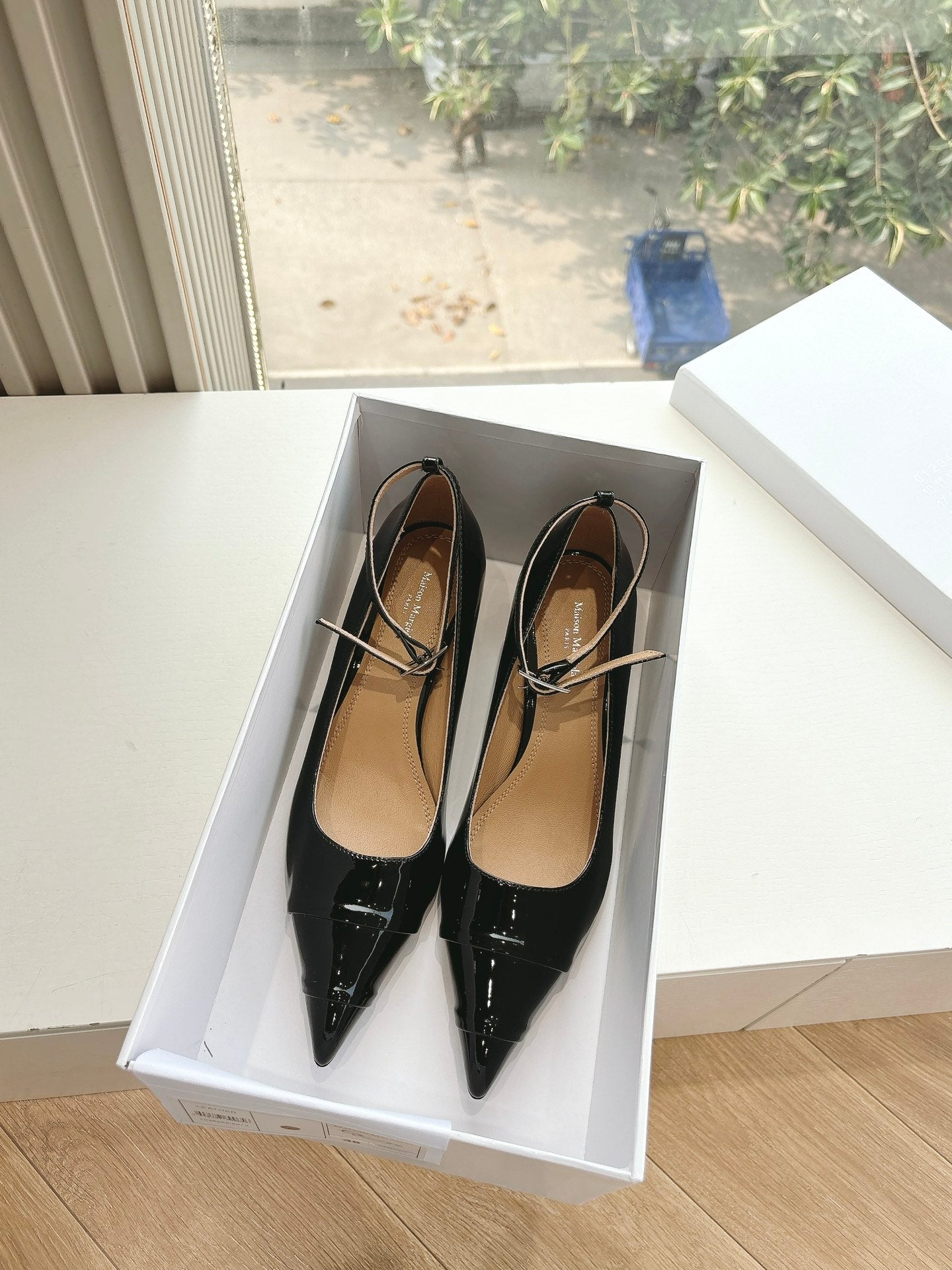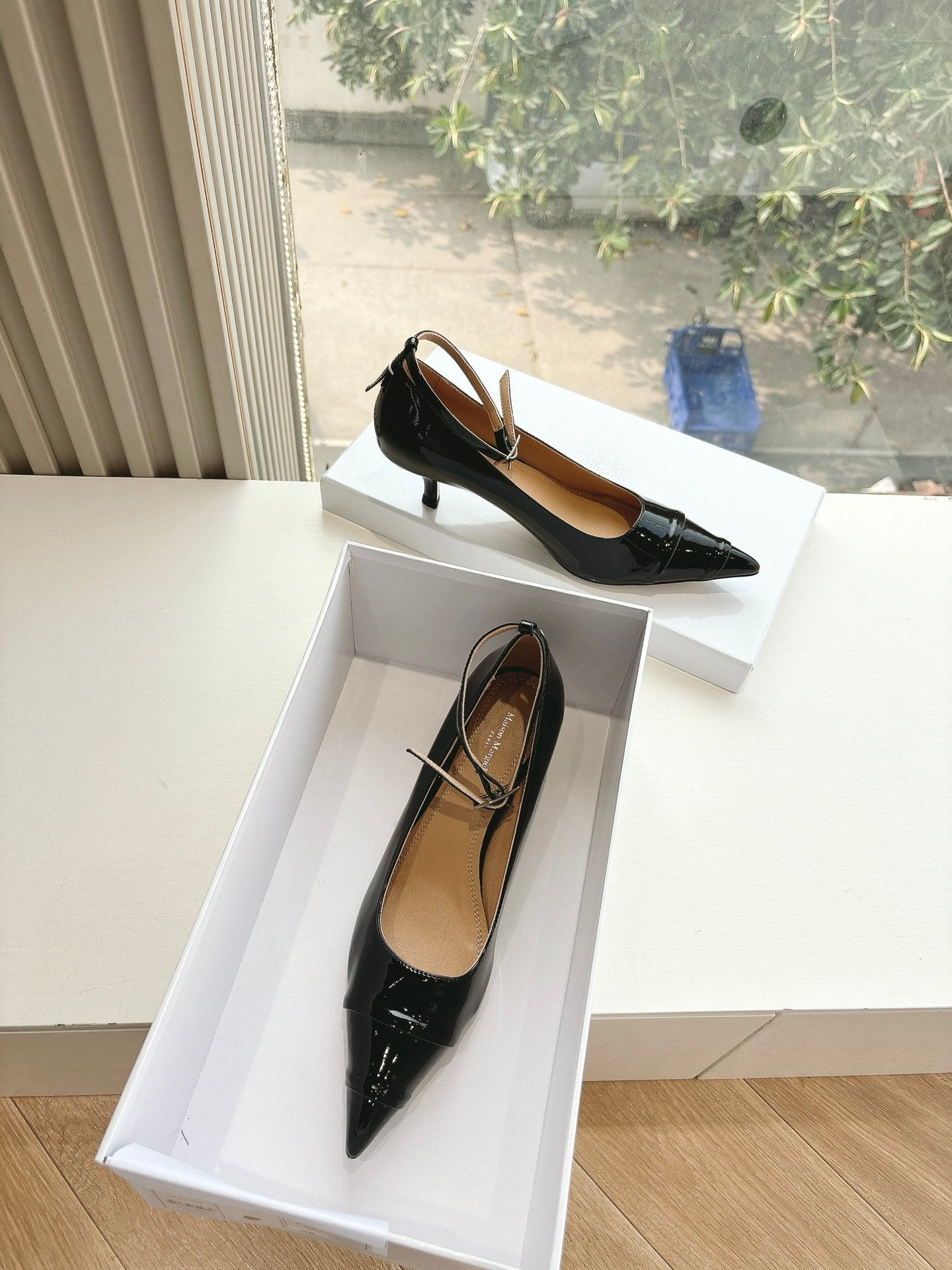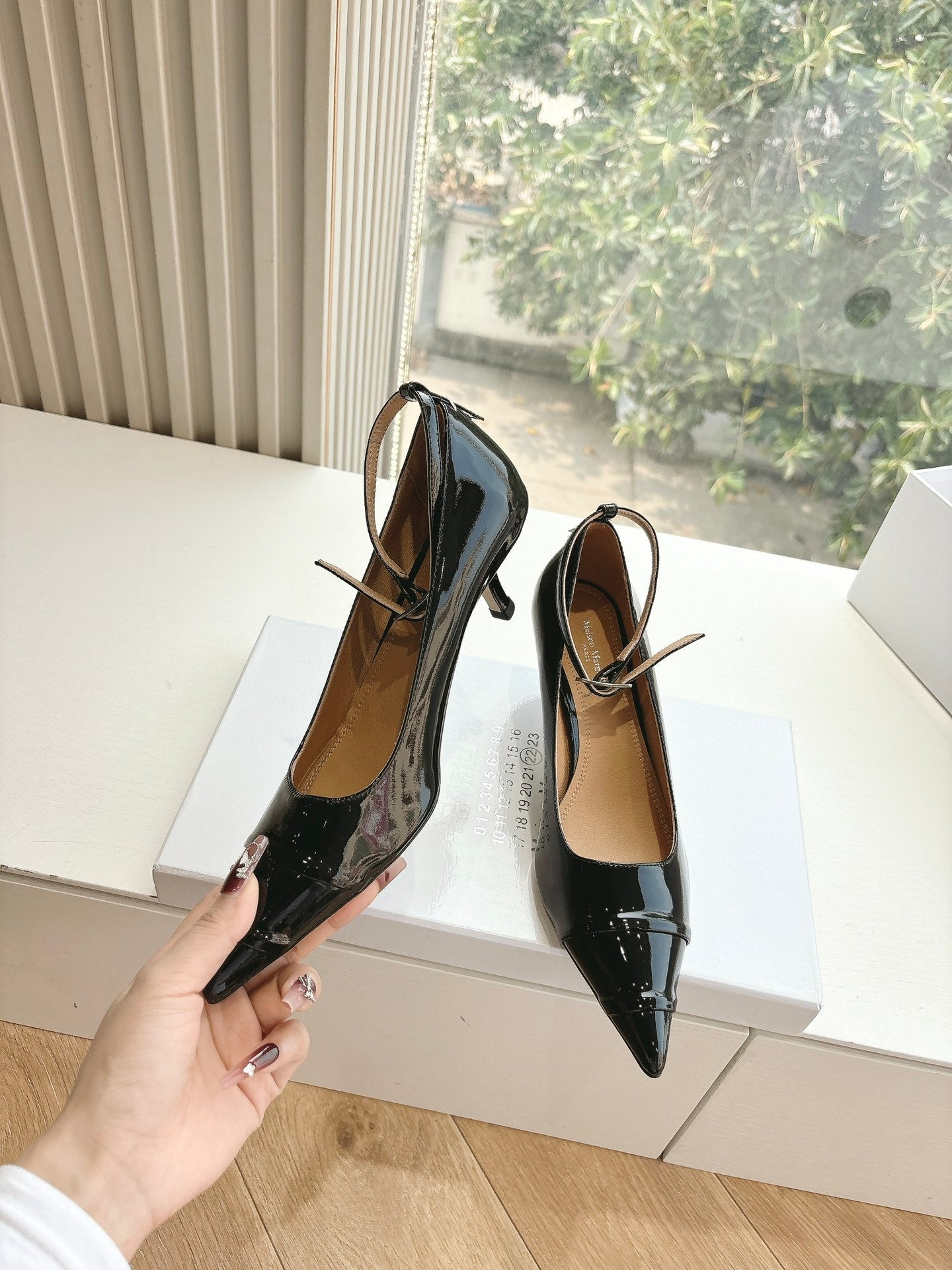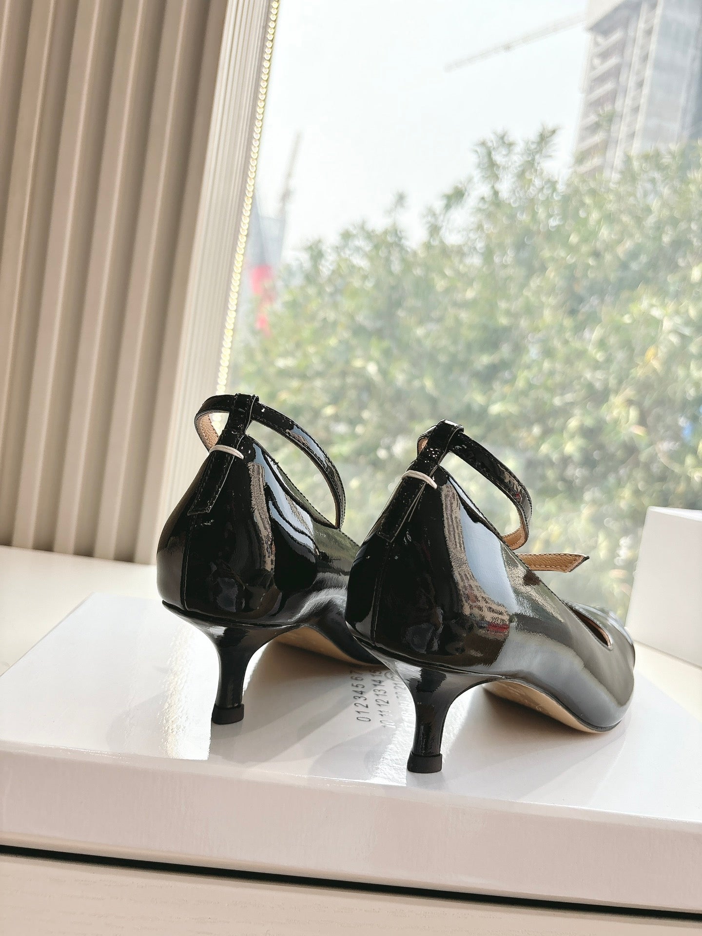 POINTED-TOE ANKLE STRAP PUMPS IN BLACK PATENT CALFSKIN