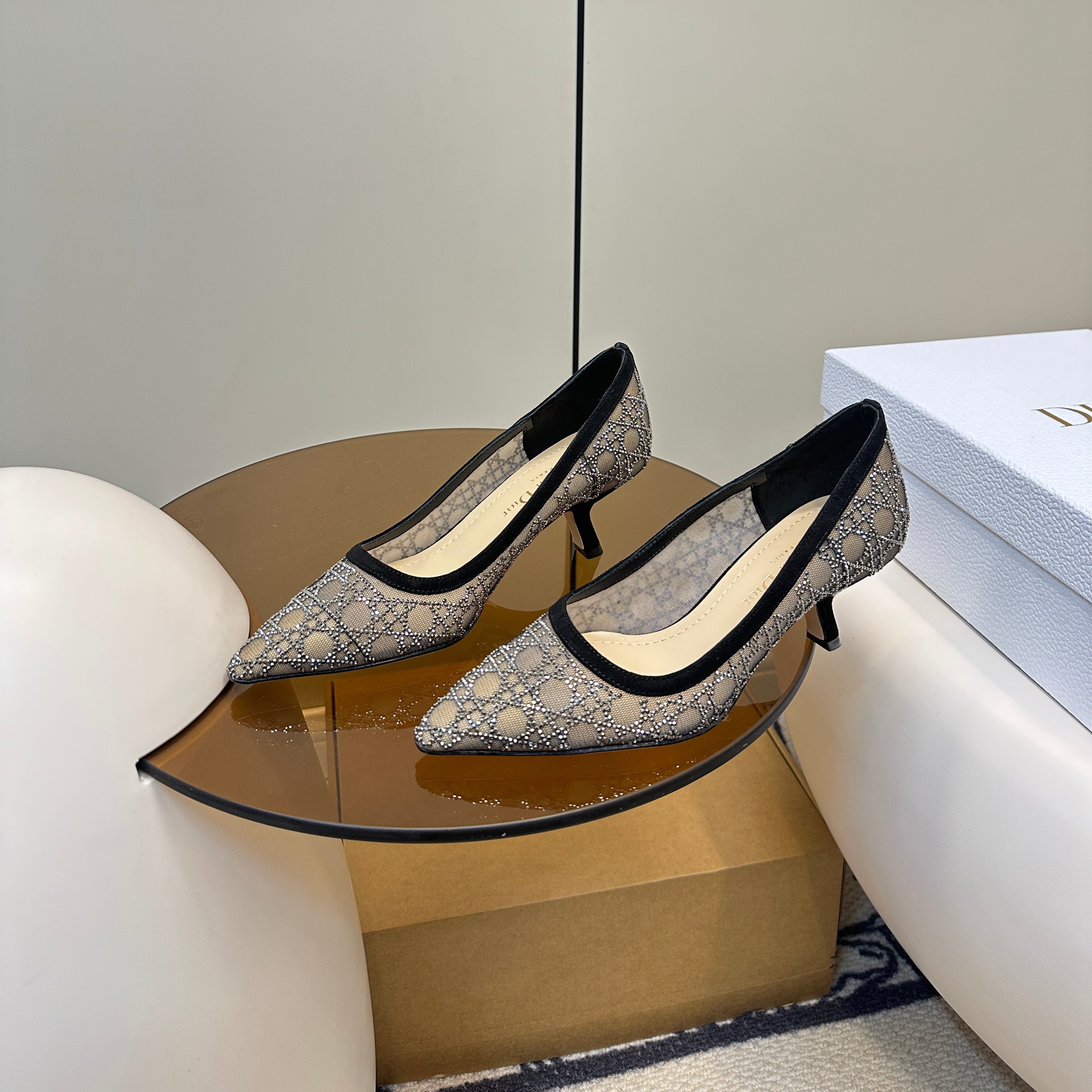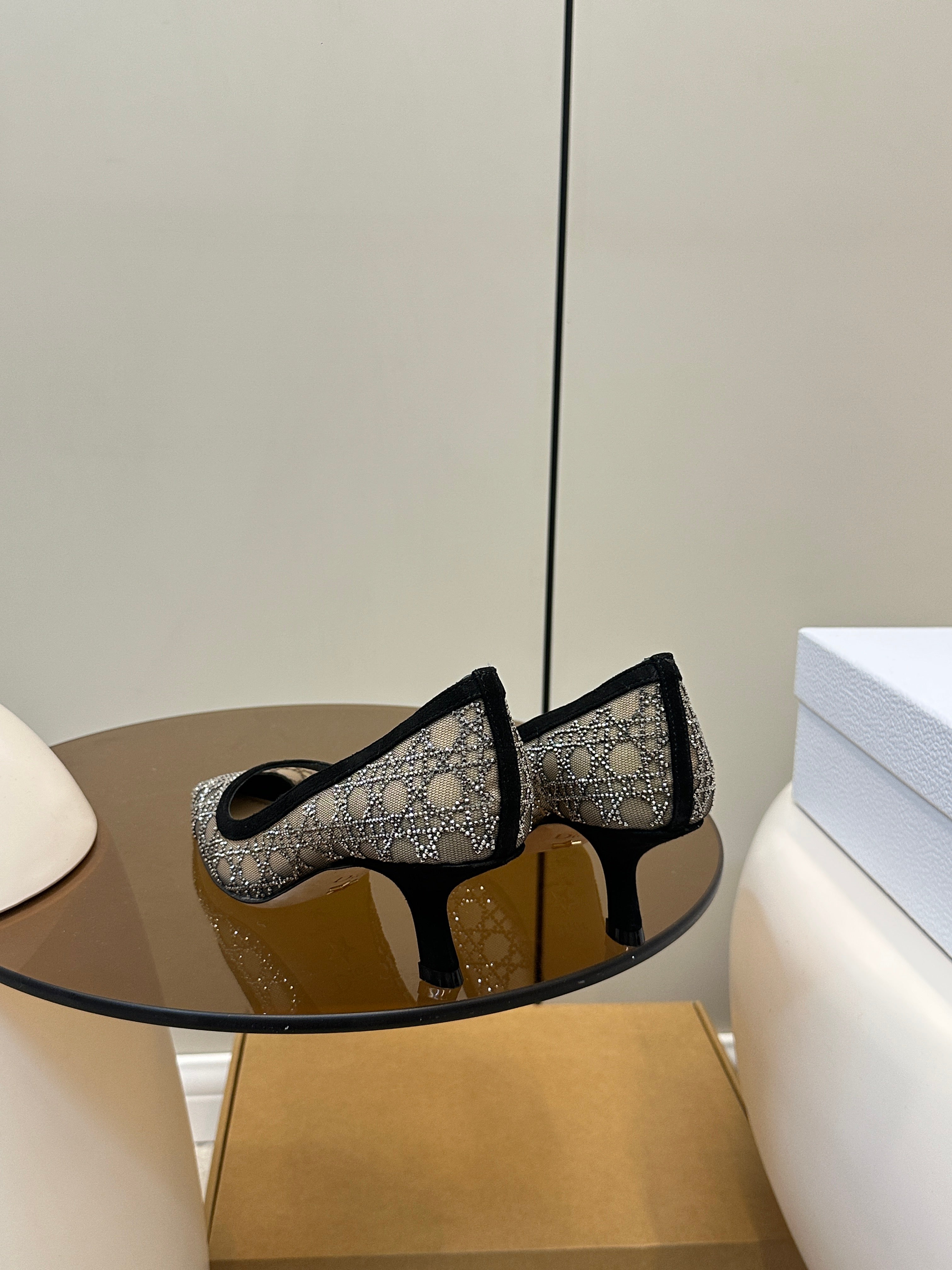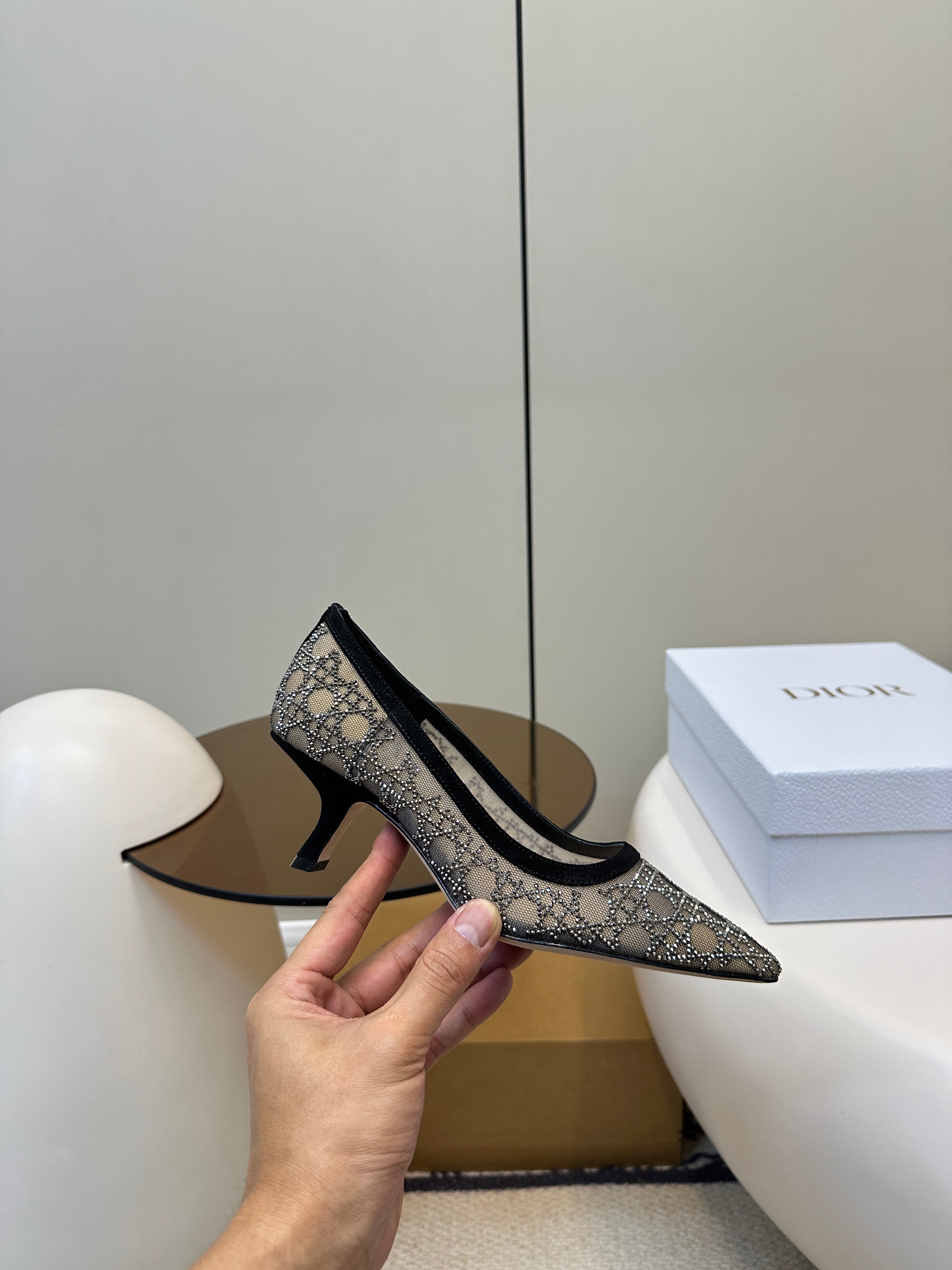POINTED TOE HEELS 55MM IN BLACK MESH WITH RHINESTONES