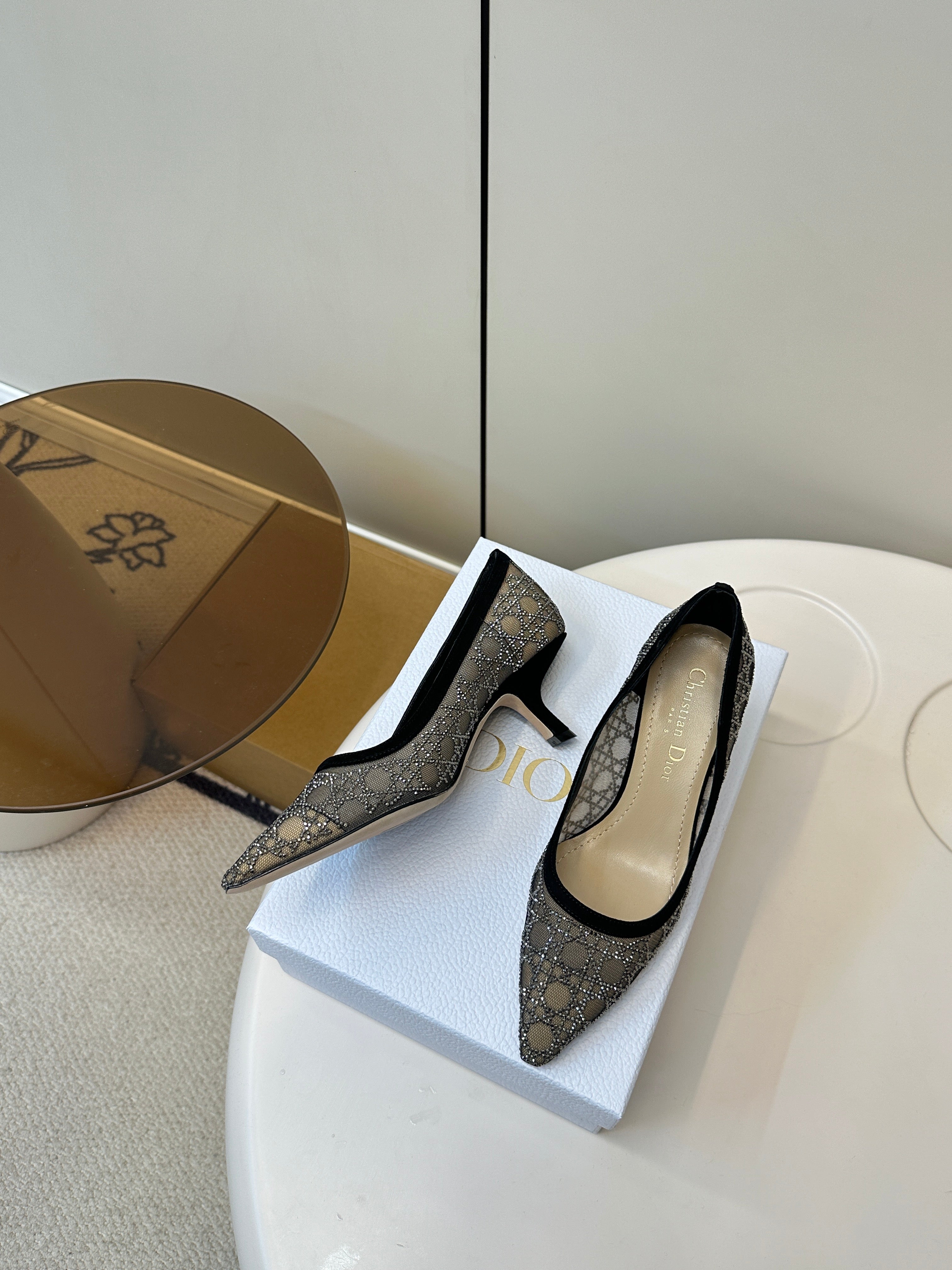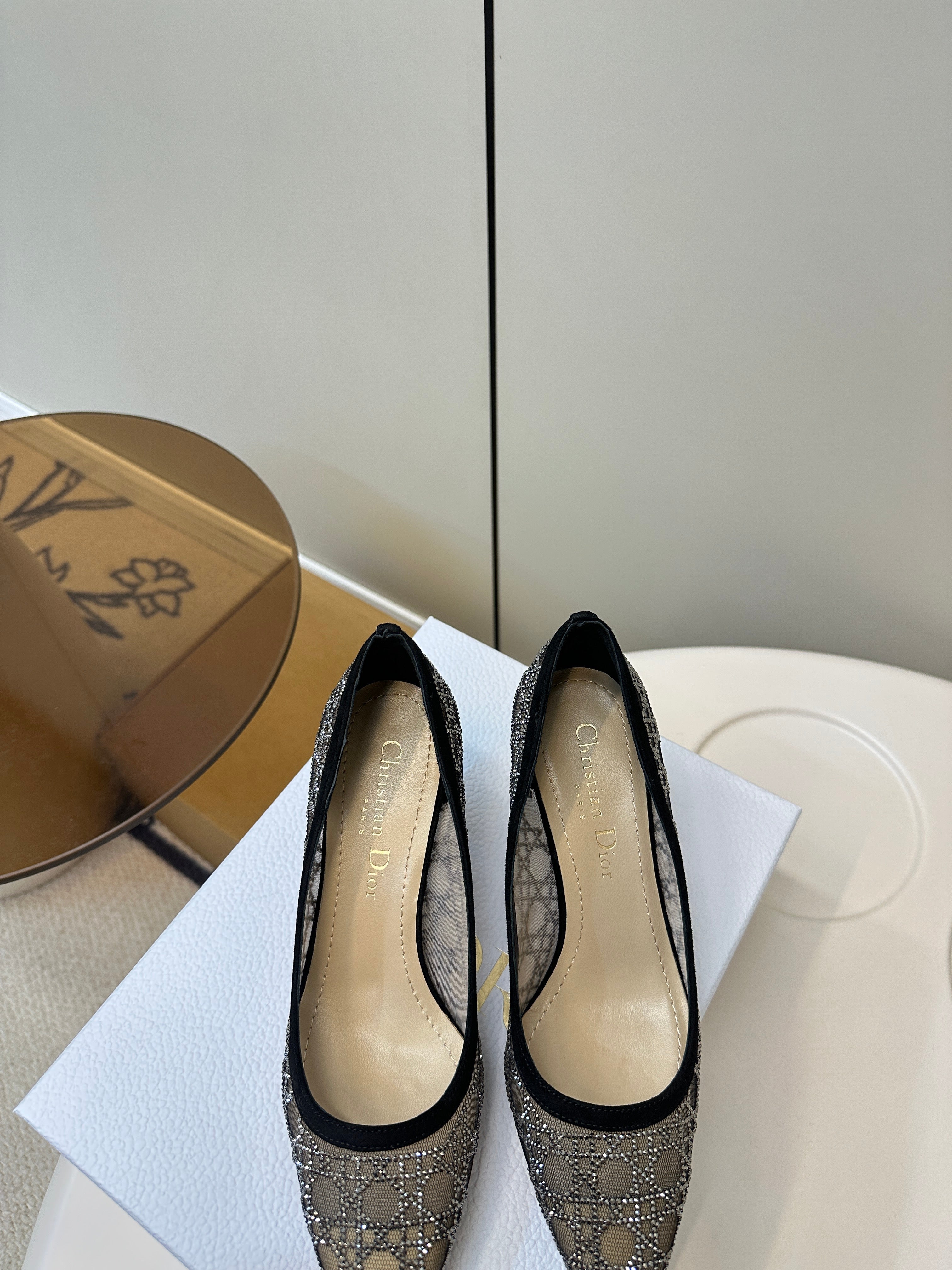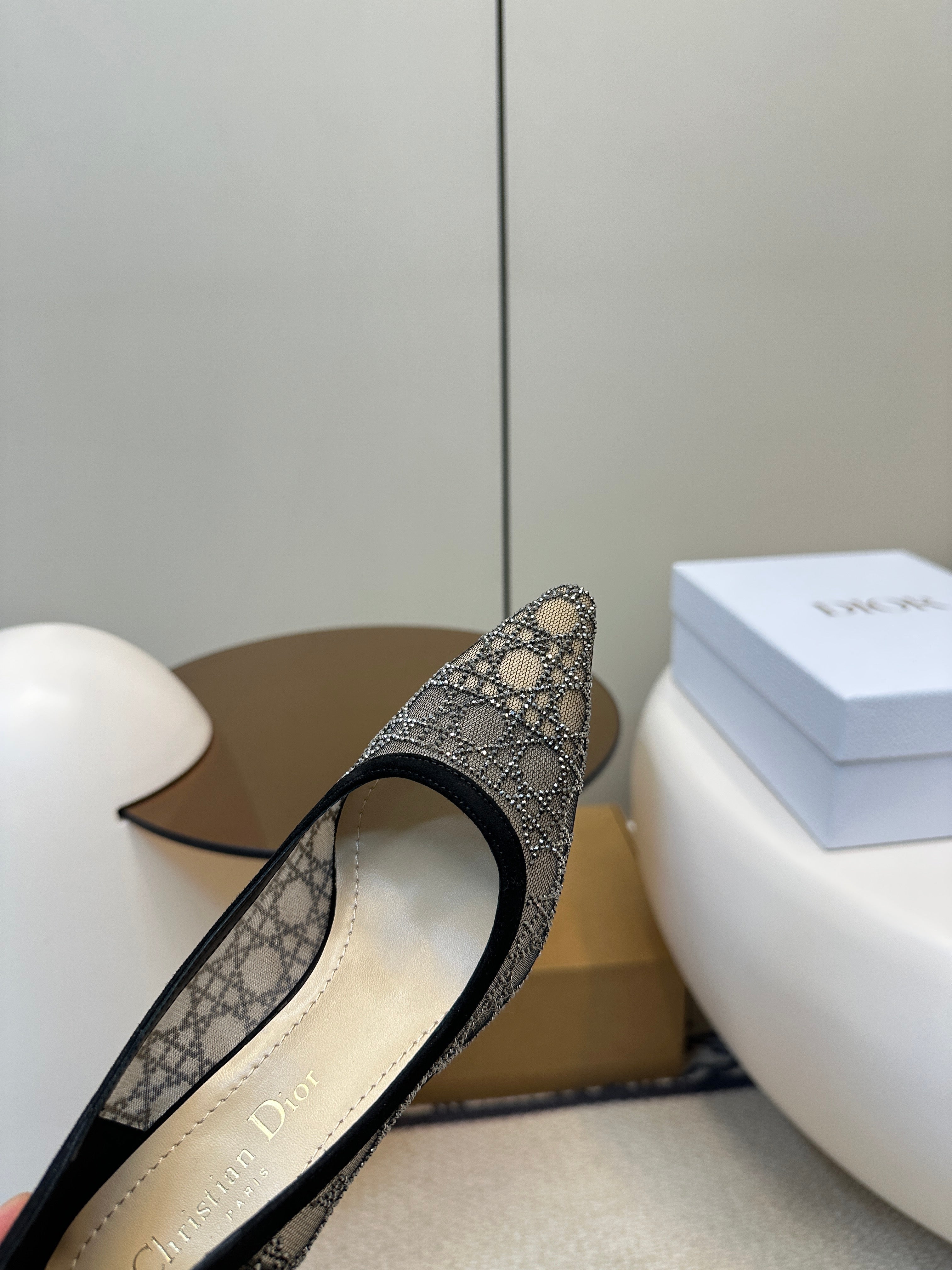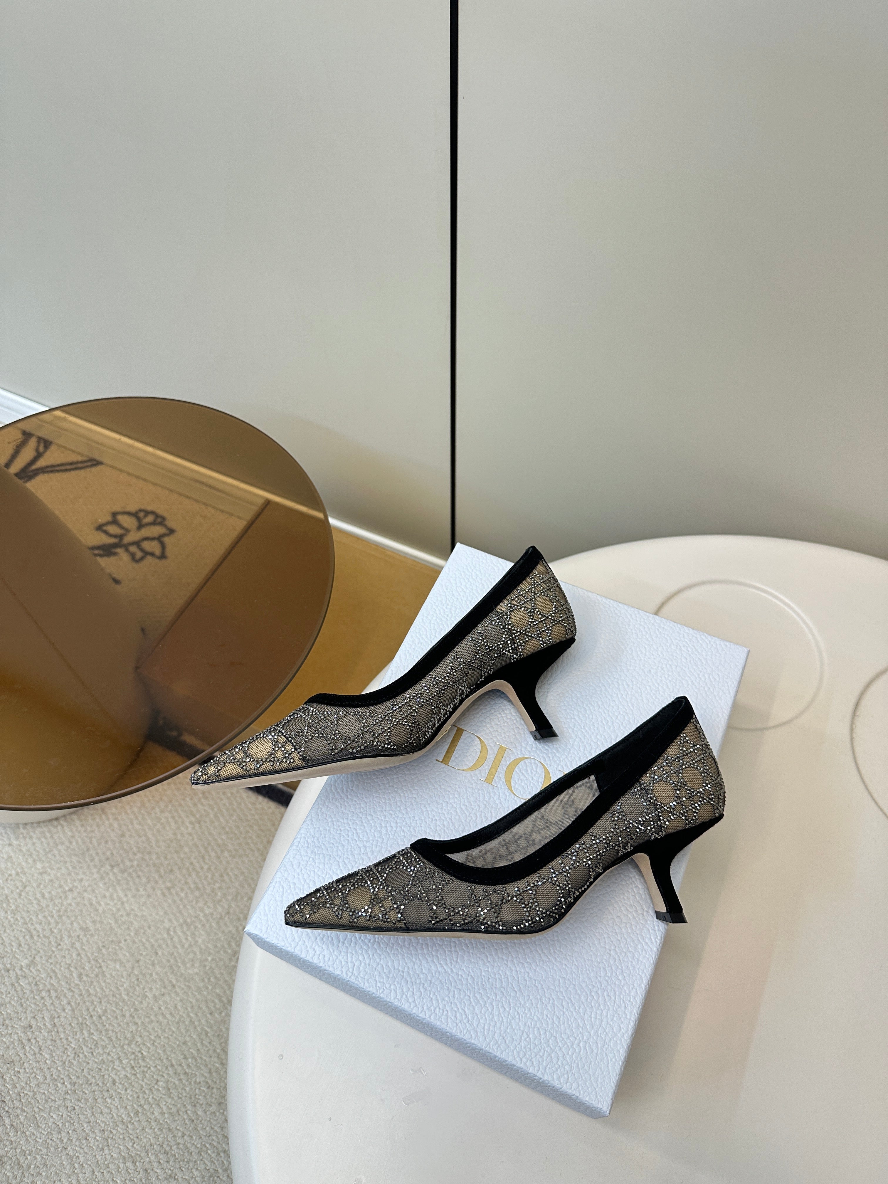 POINTED TOE HEELS 55MM IN BLACK MESH WITH RHINESTONES
