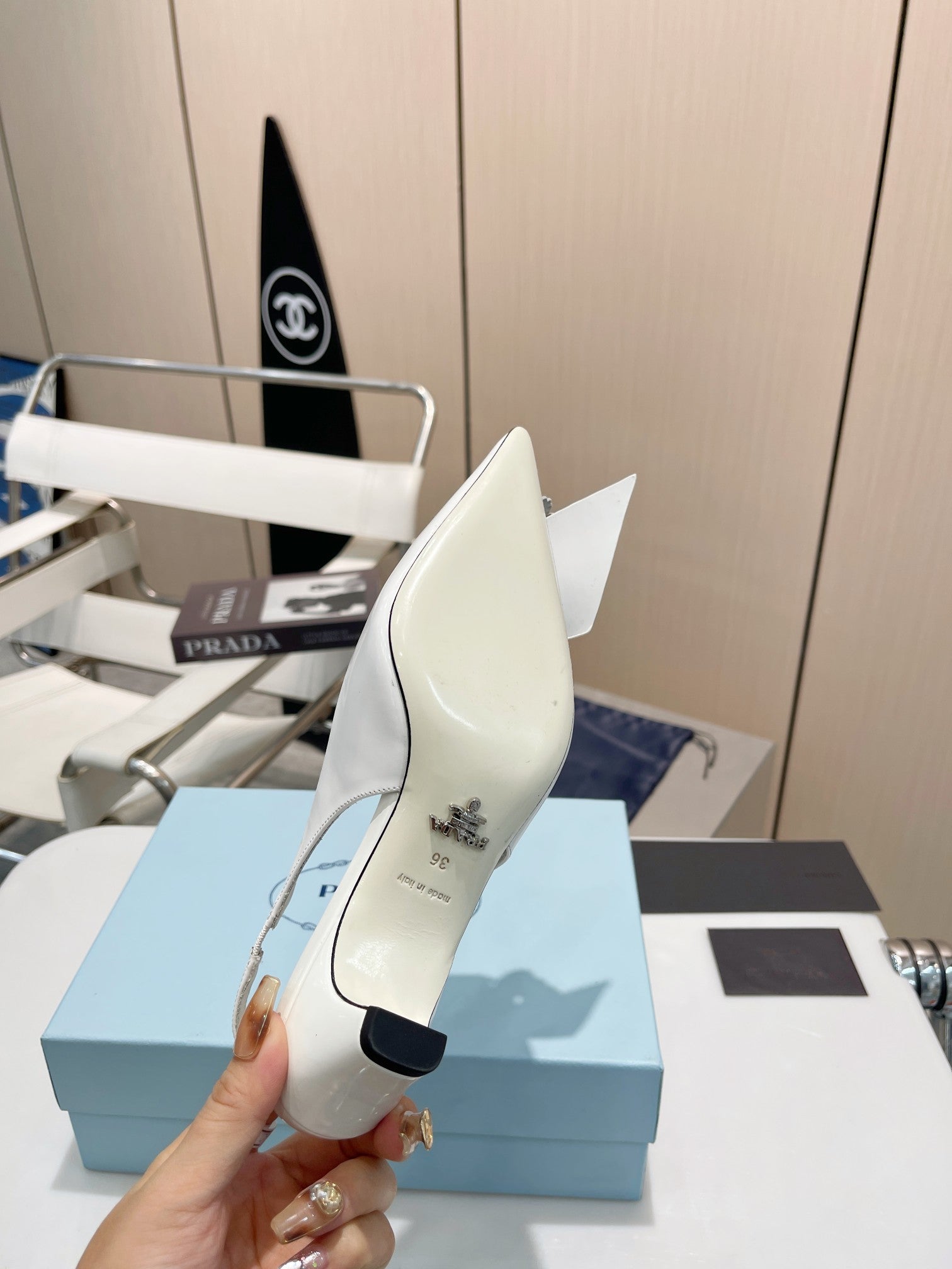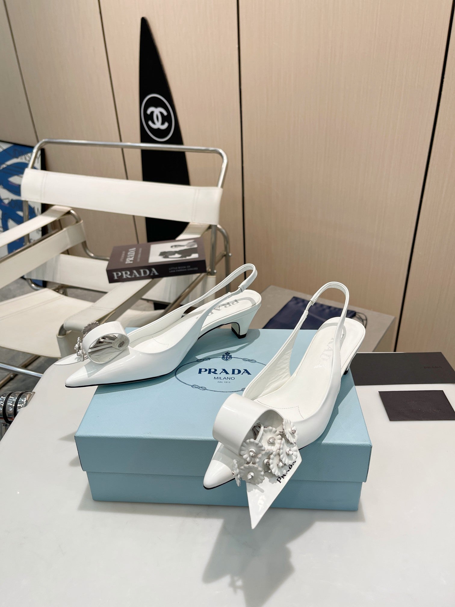 POINTED TOE SLINGBACK KITTEN HEEL WITH FLOWER BOW IN WHITE GLOSSY LAMBSKIN