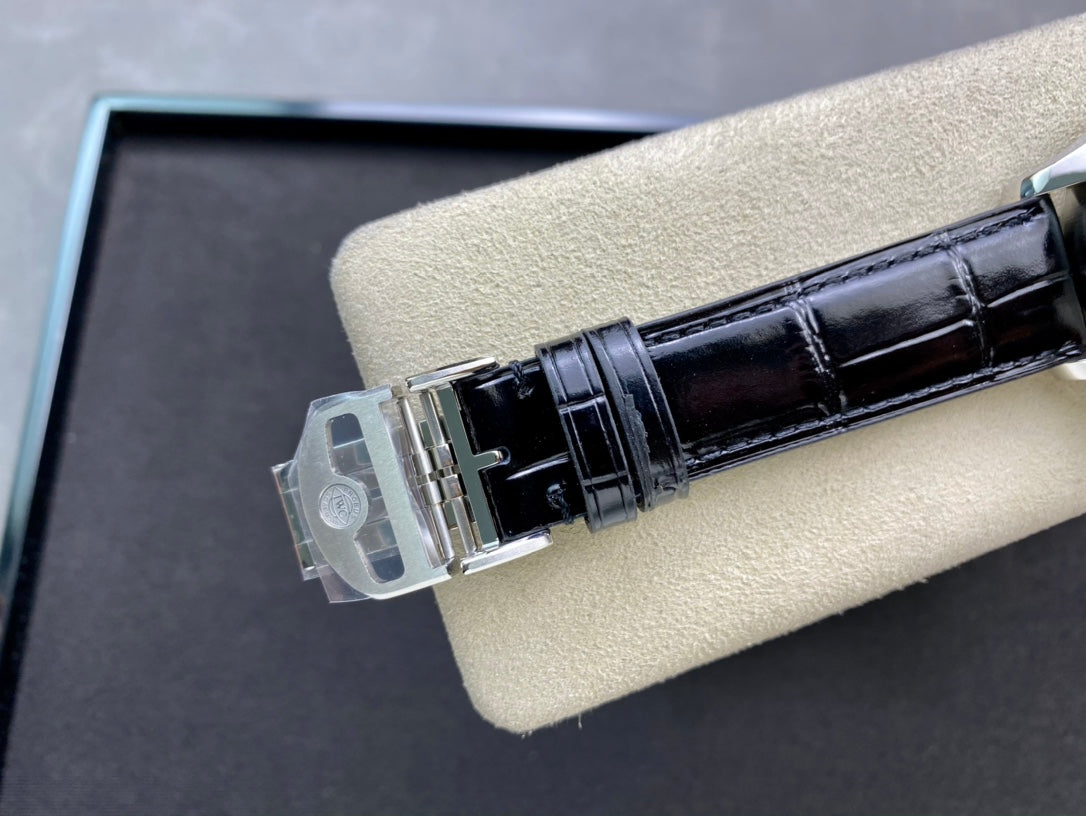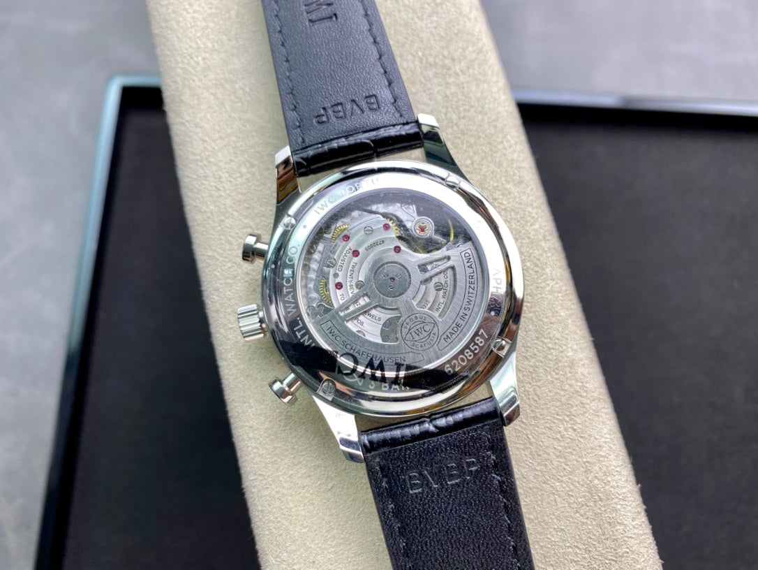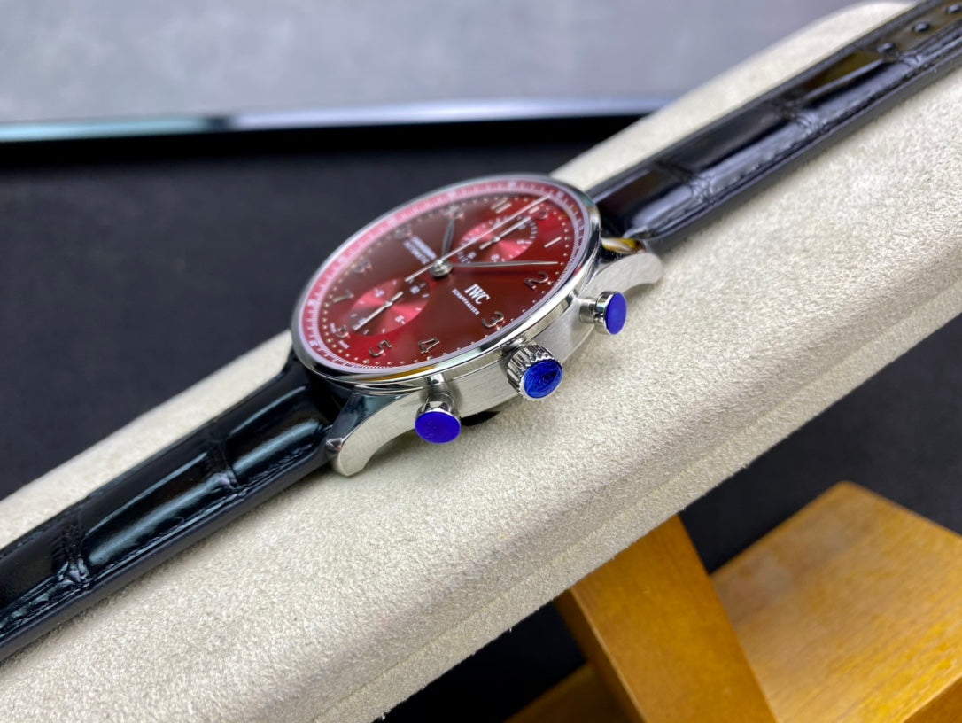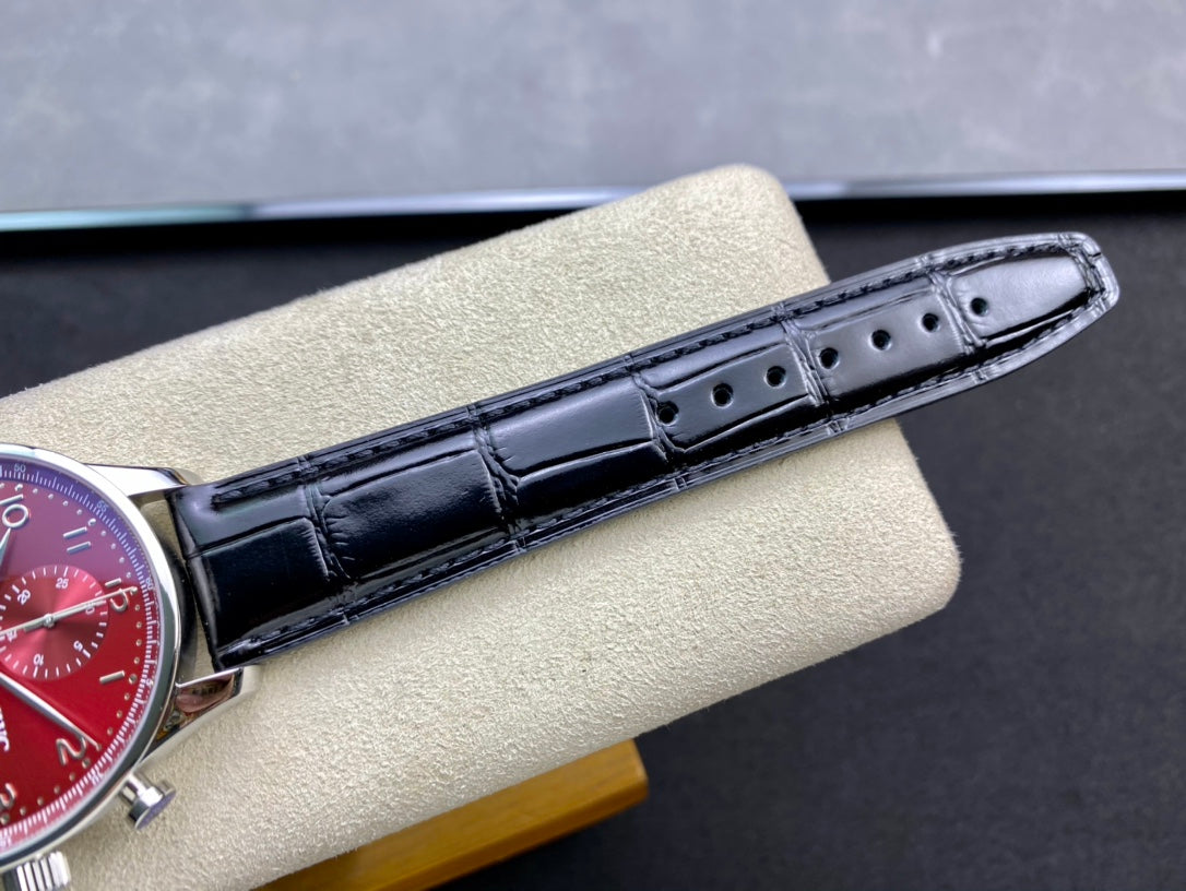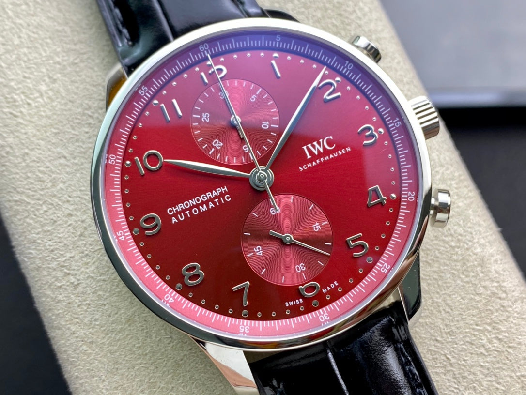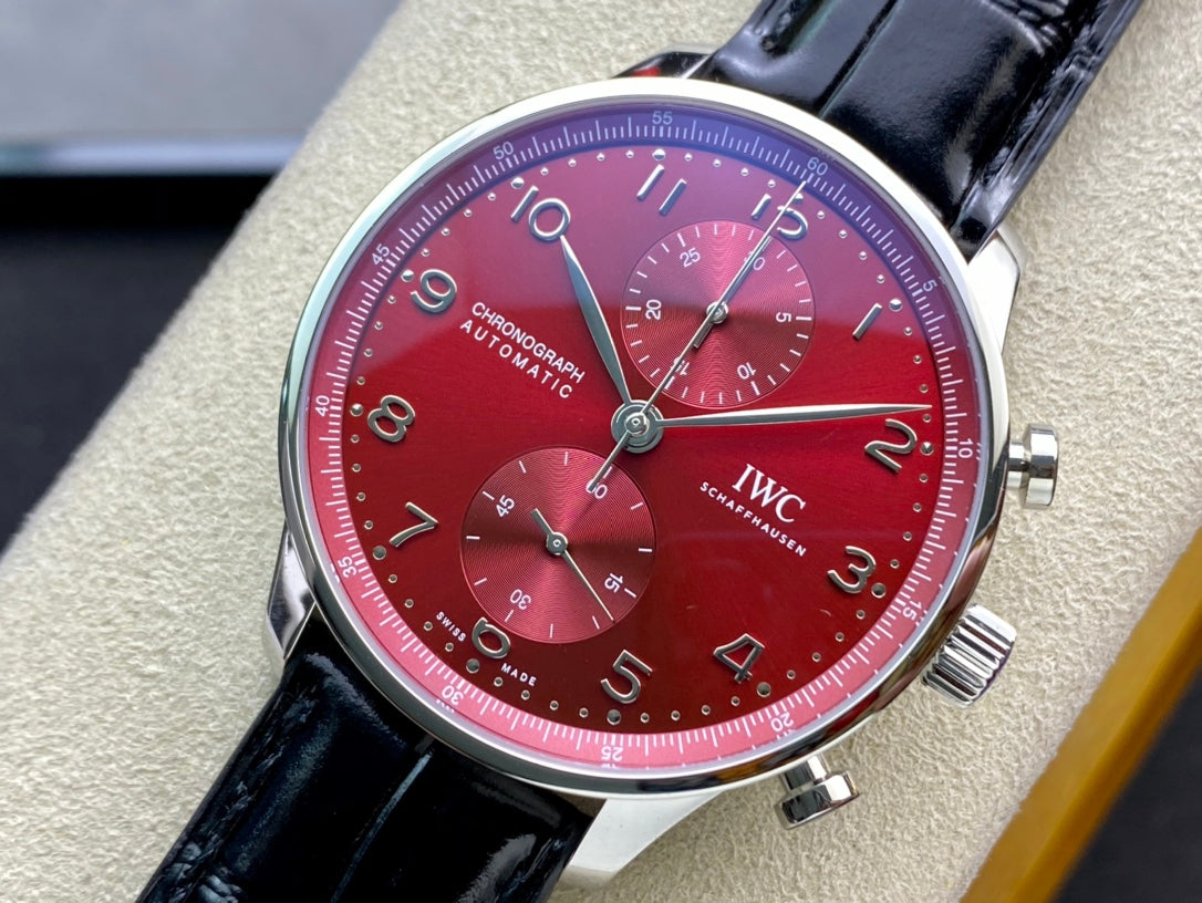 PORTUGIESER AUTOMATIC 40 MM WATCH SILVER CASE WITH BLACK LEATHER STRAP AND CHERRY RED DIAL