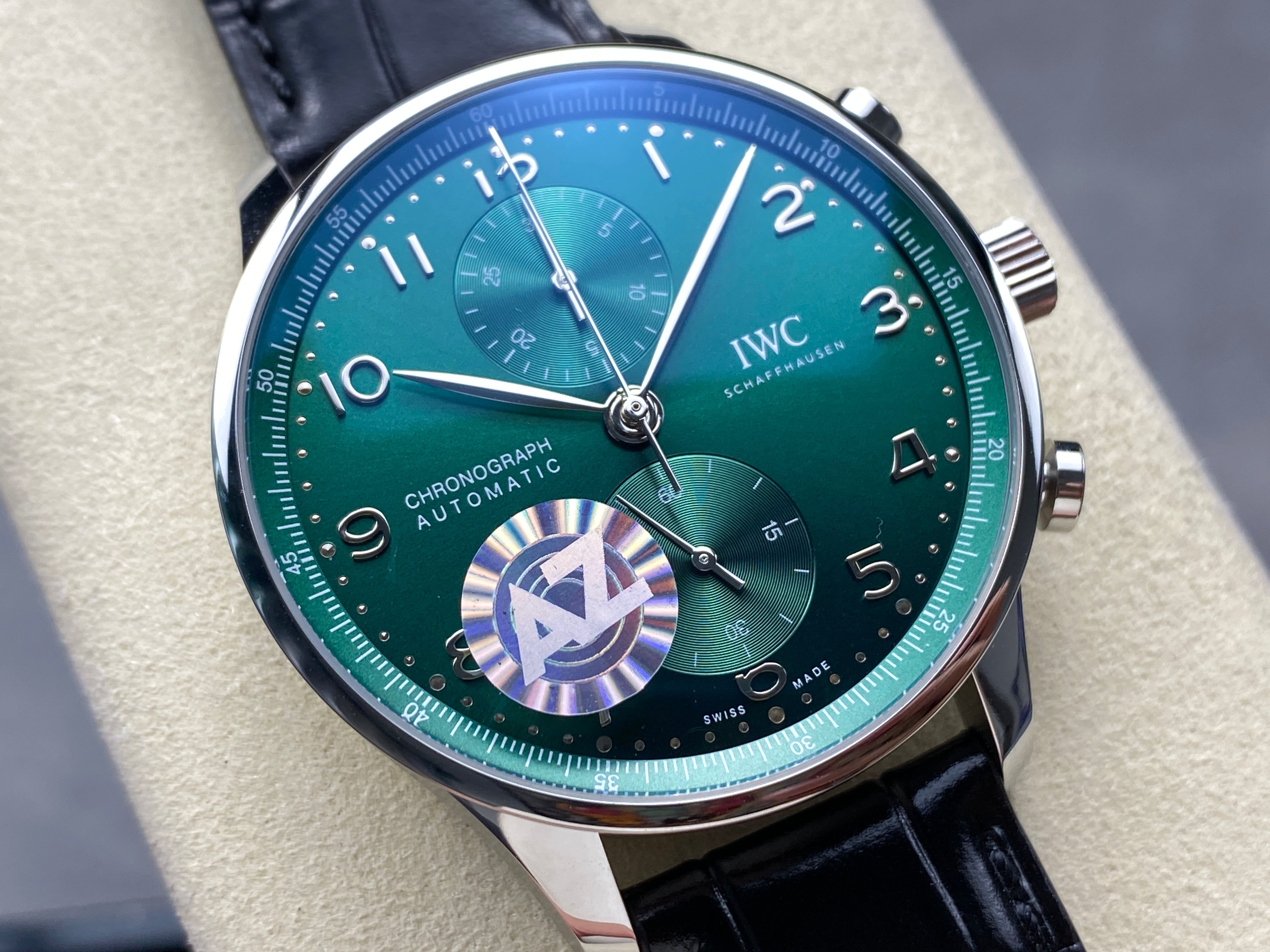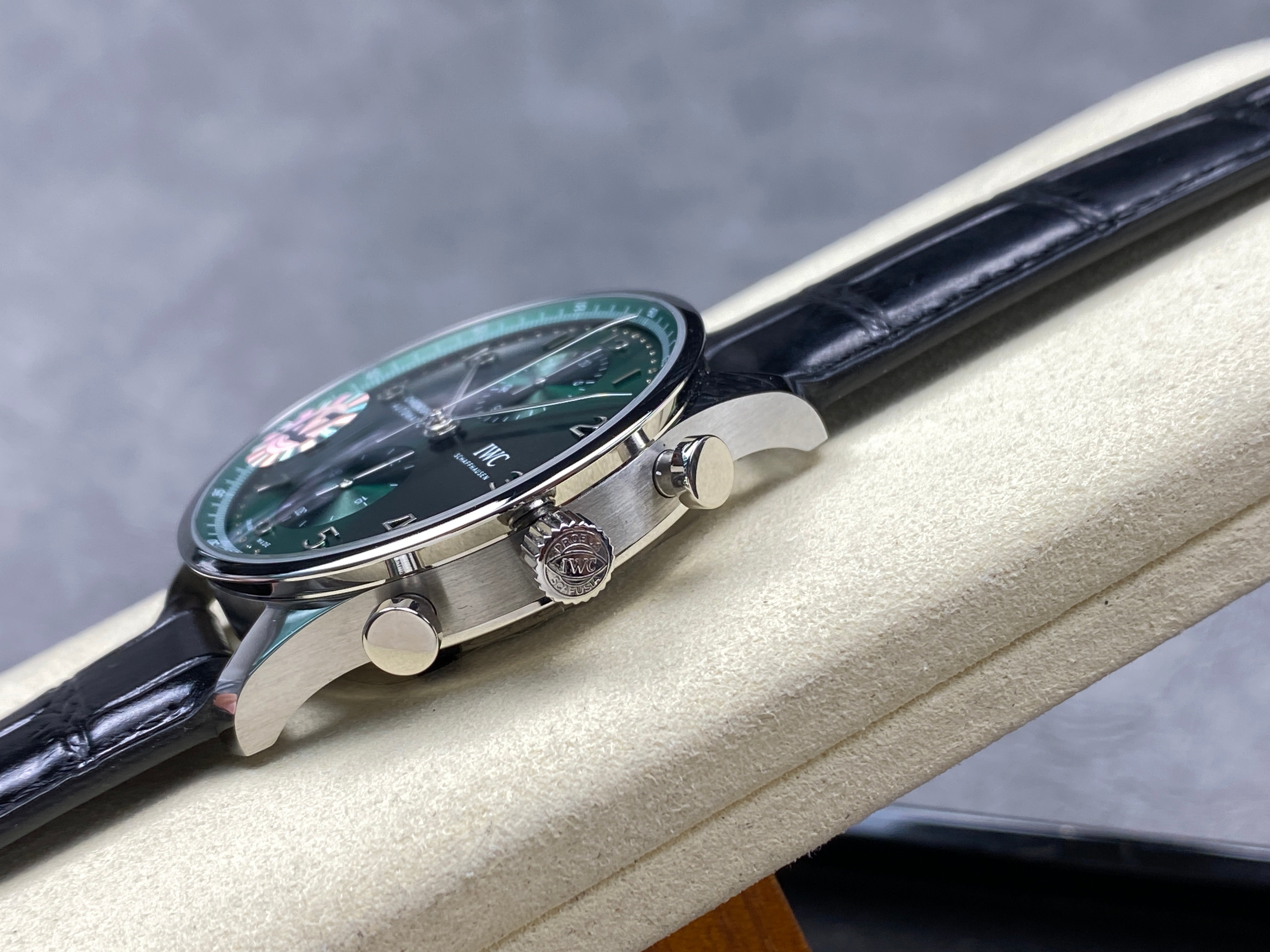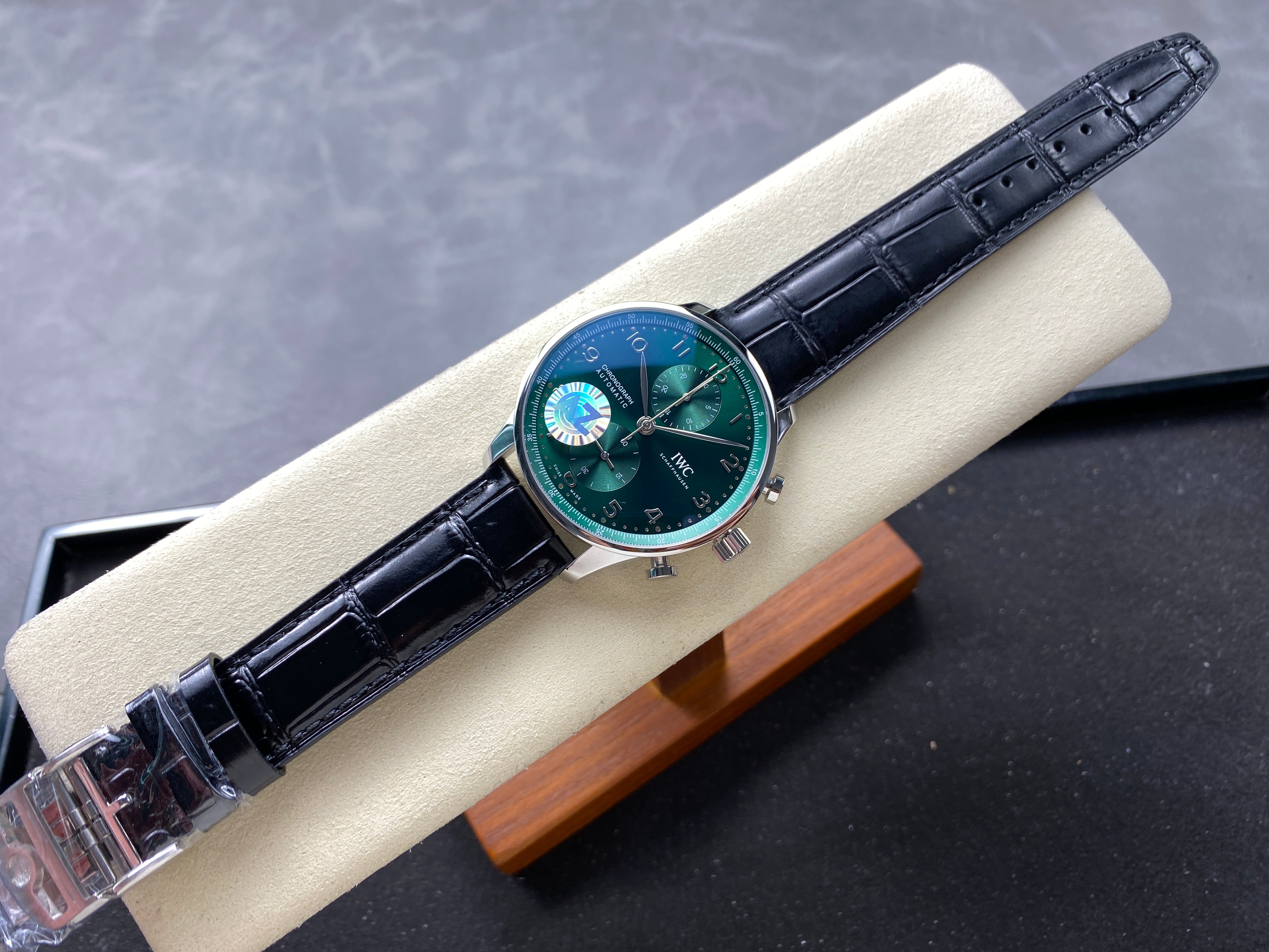 PORTUGIESER AUTOMATIC 40 MM WATCH SILVER CASE WITH BLACK LEATHER STRAP AND GREEN FOREST DIAL