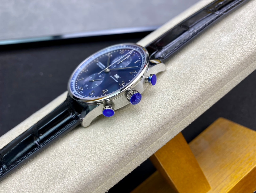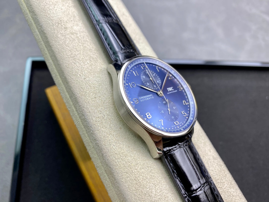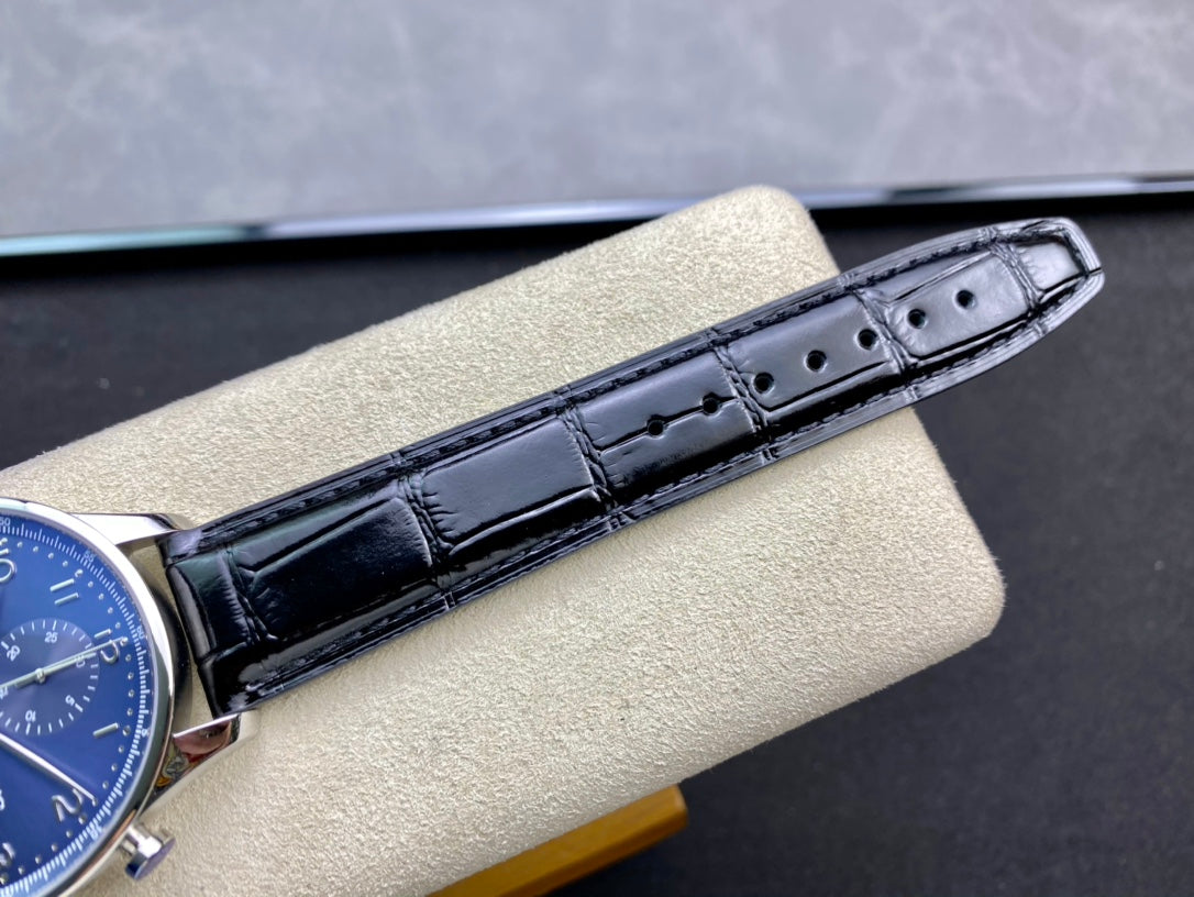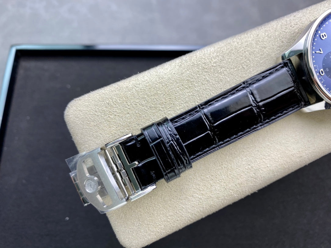 PORTUGIESER AUTOMATIC 40 MM WATCH SILVER CASE WITH BLACK LEATHER STRAP AND NAVY BLUE DIAL