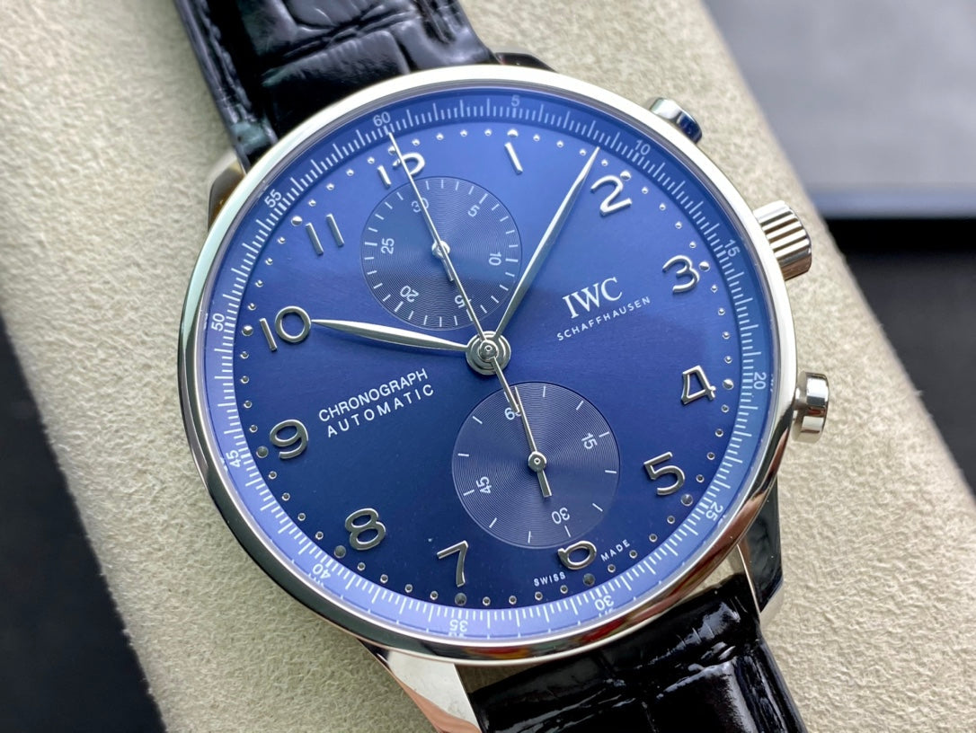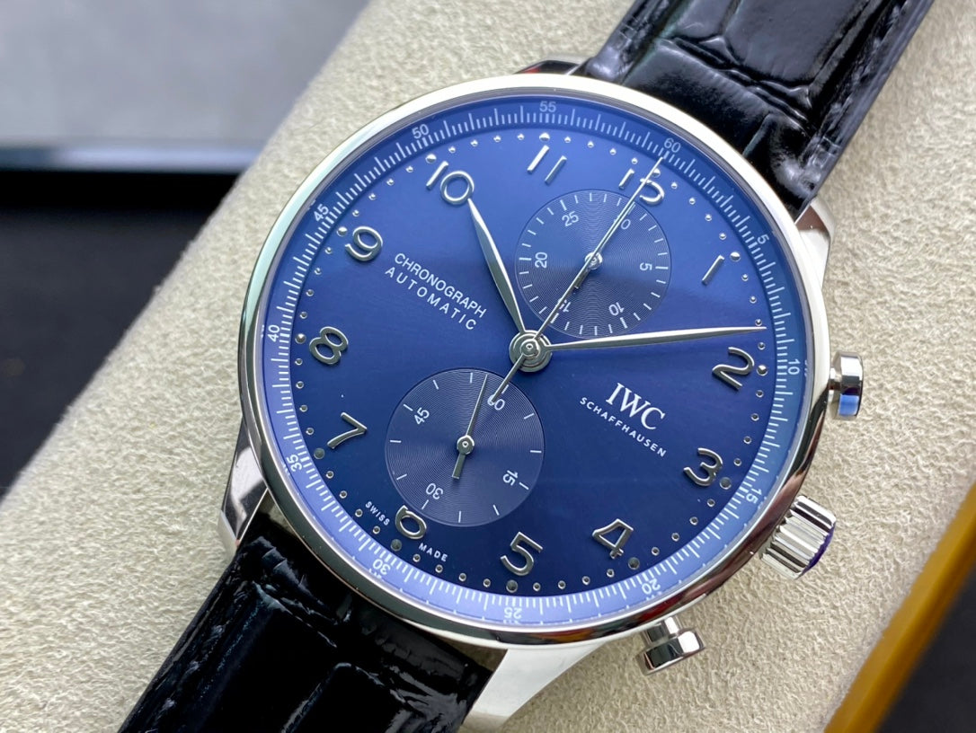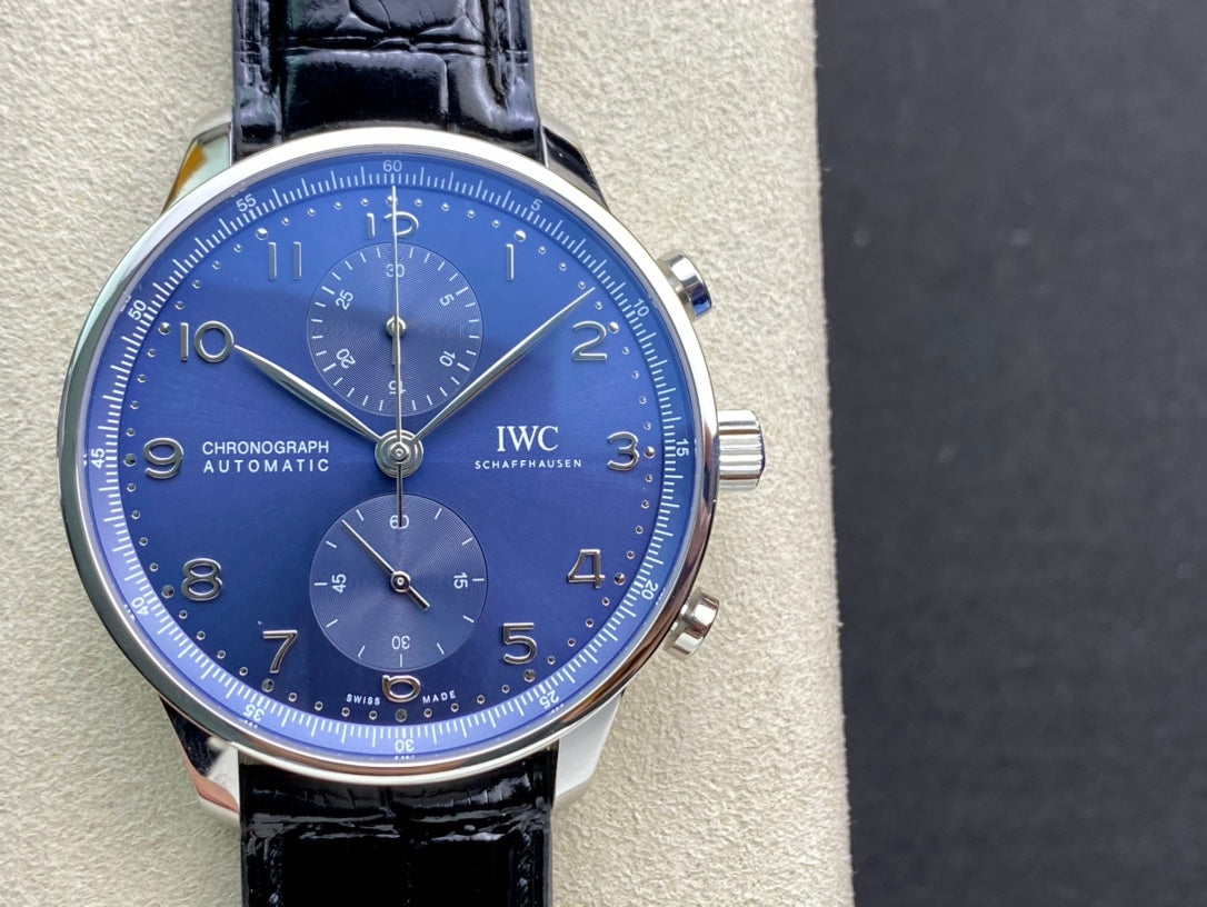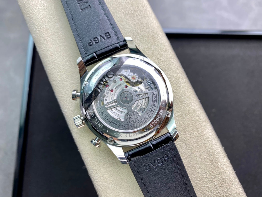 PORTUGIESER AUTOMATIC 40 MM WATCH SILVER CASE WITH BLACK LEATHER STRAP AND NAVY BLUE DIAL