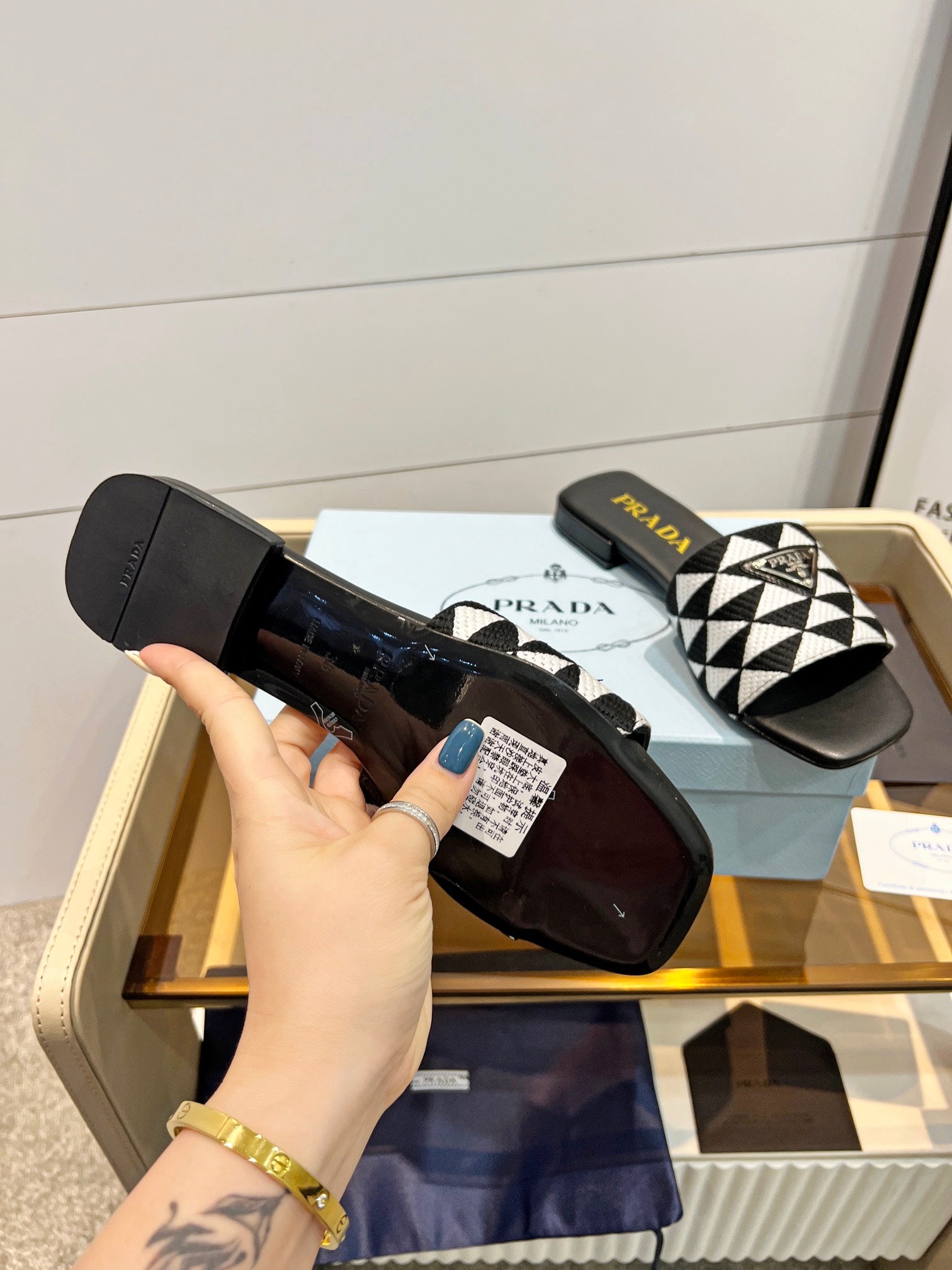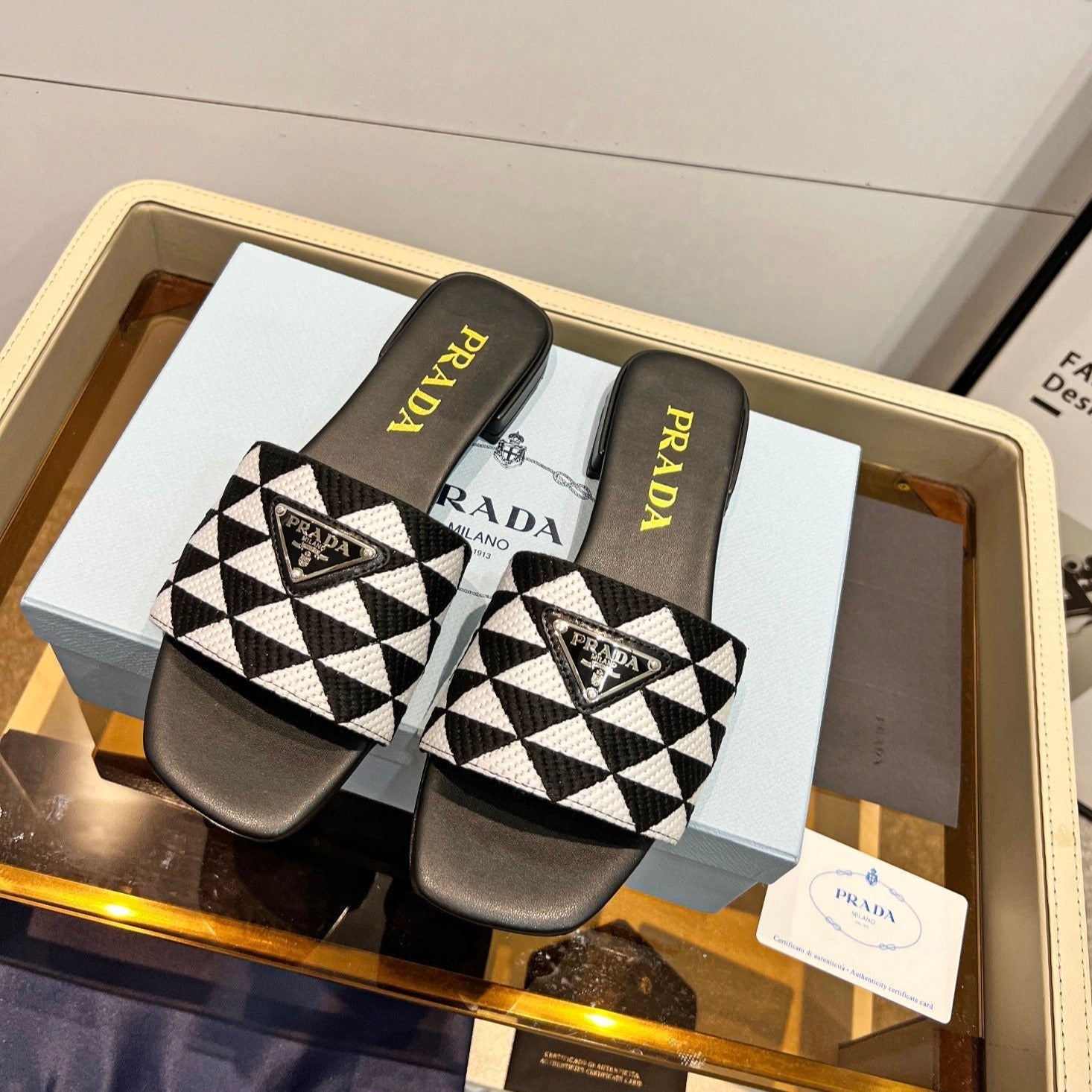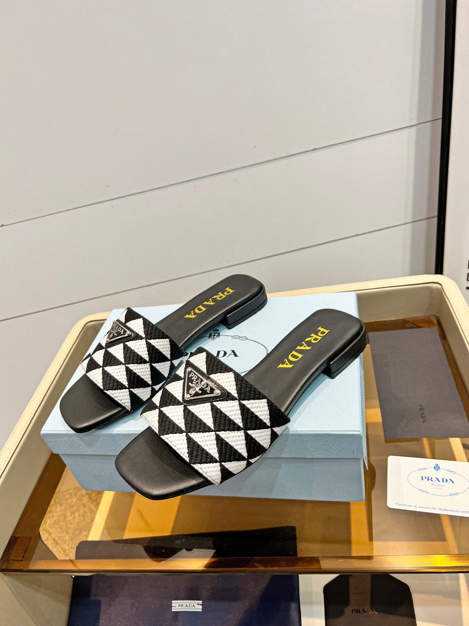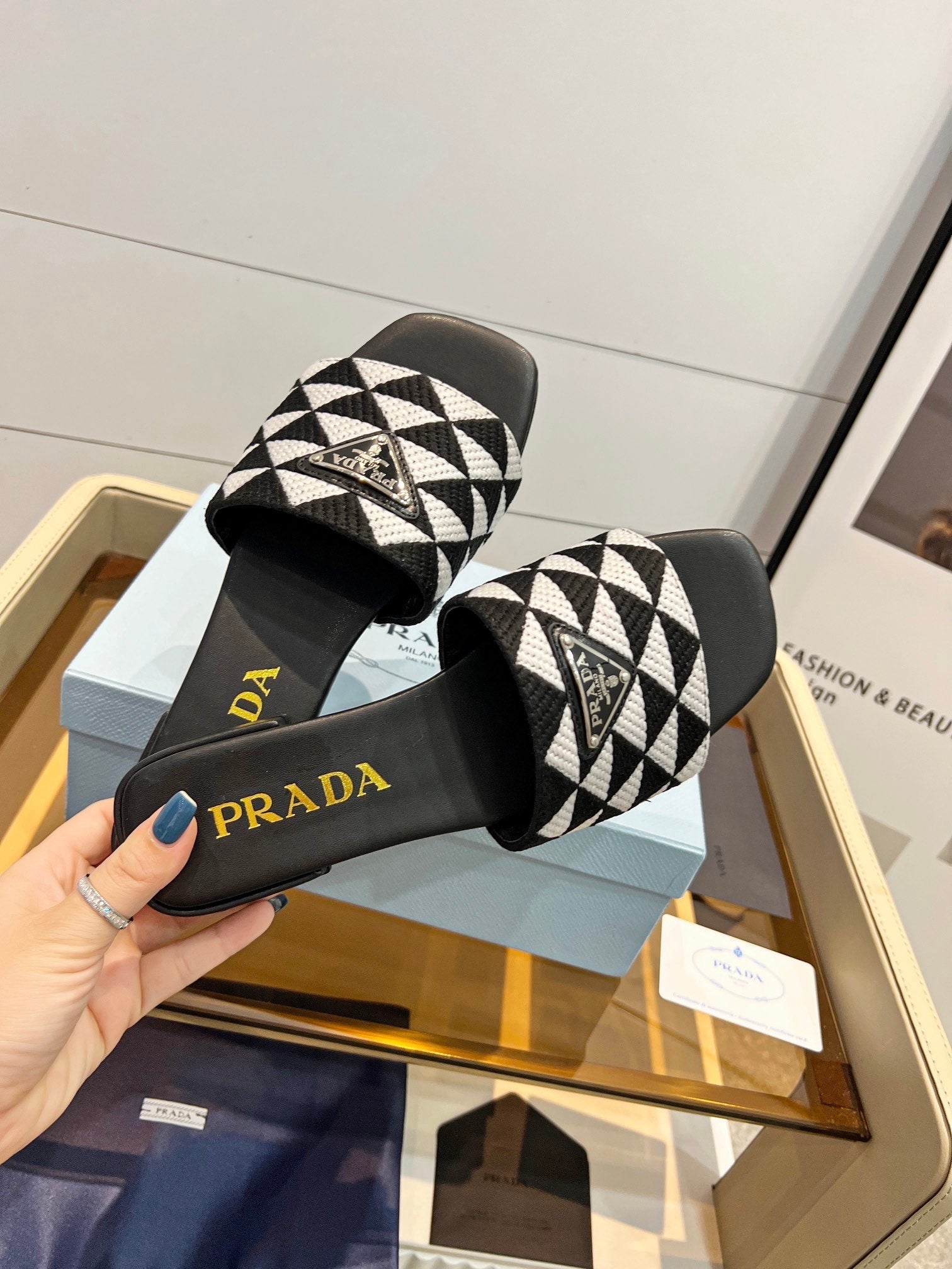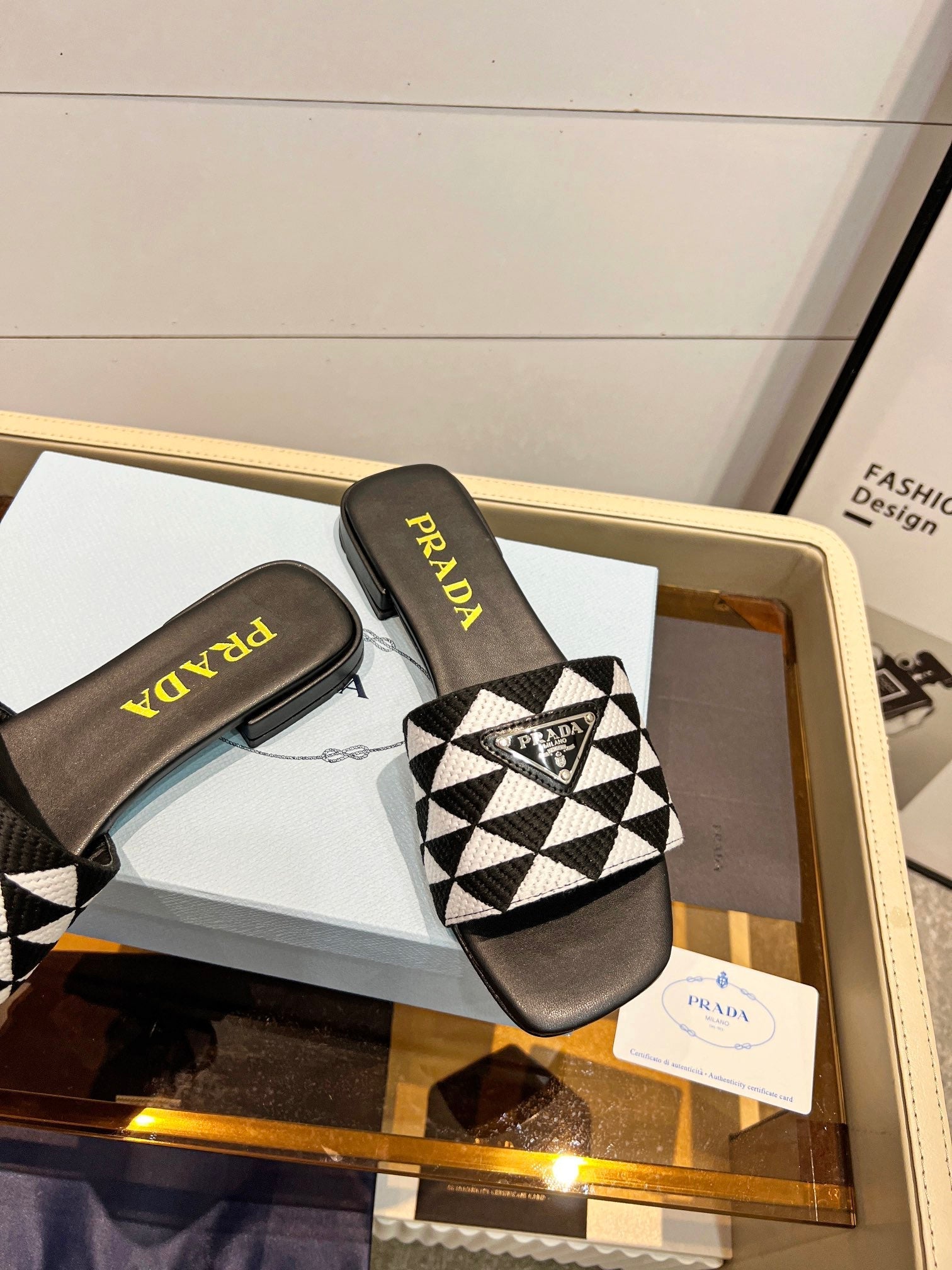 PRA EMBROIDERED SLIDES FLAT BLACK AND WHITE FABRIC