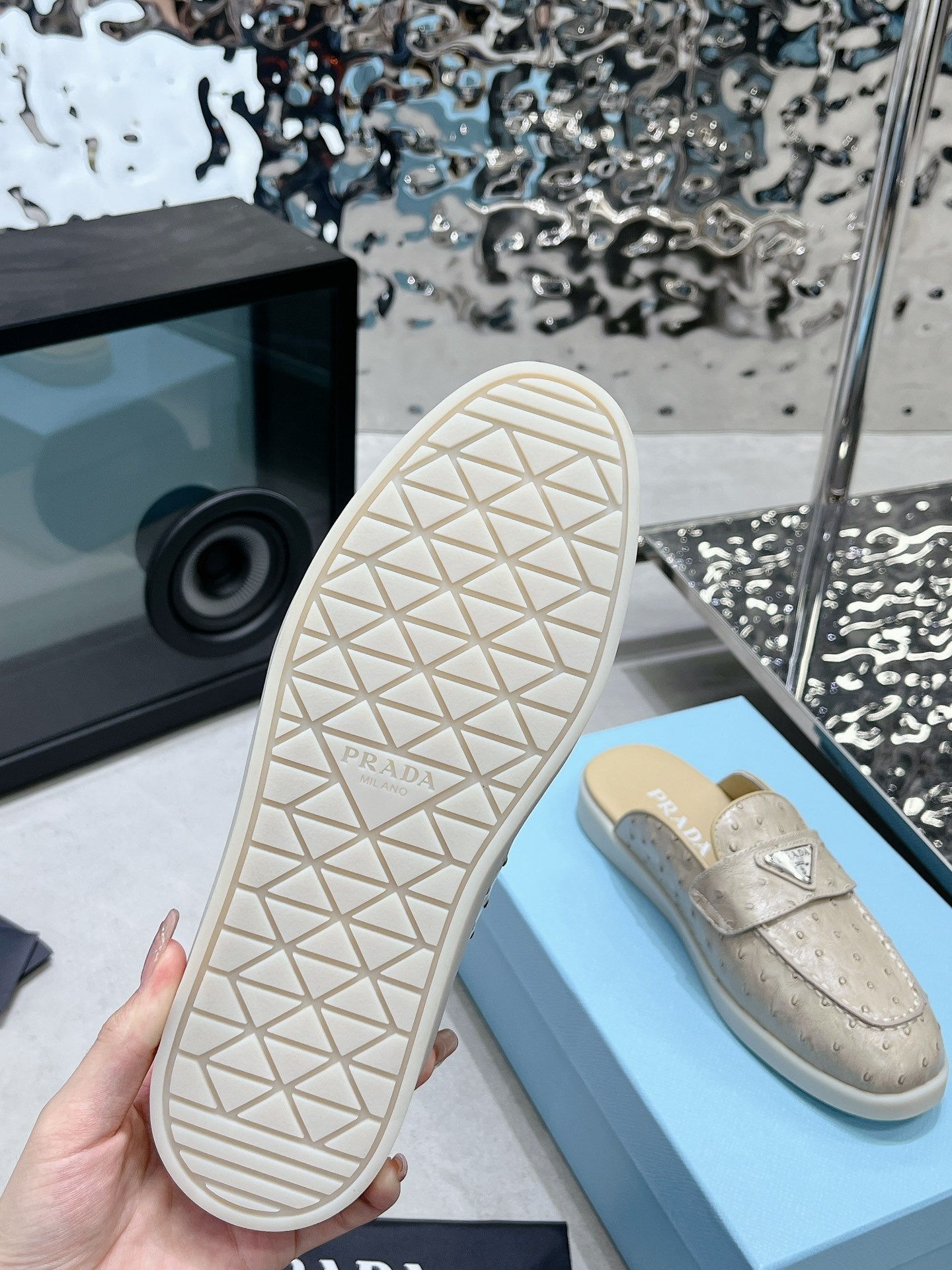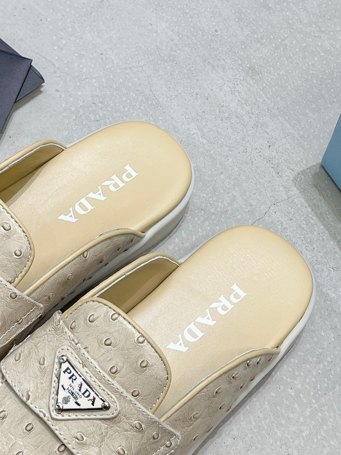 PRA OSTRICH PATTERN MULES CREAMY WHITE CALFSKIN