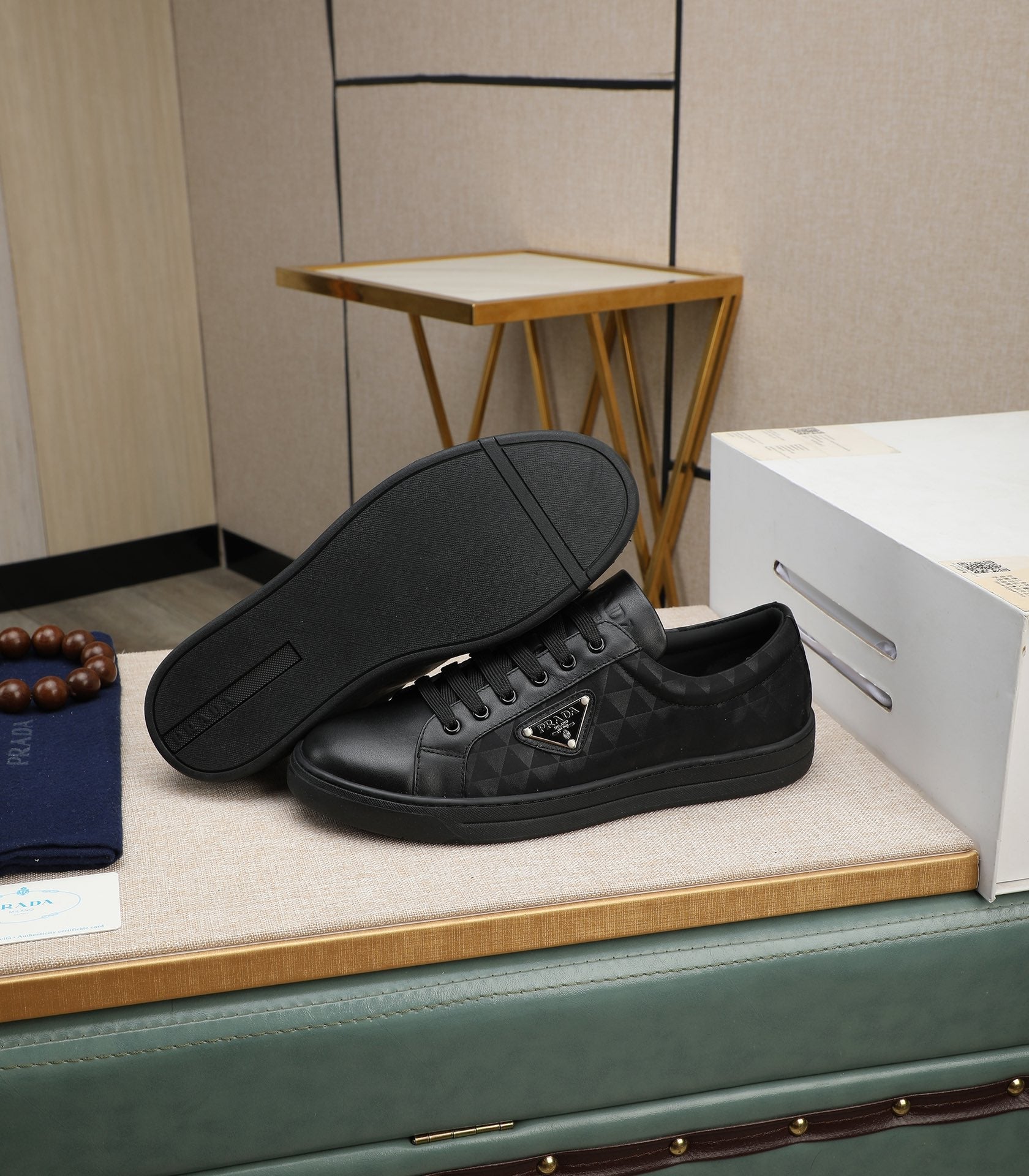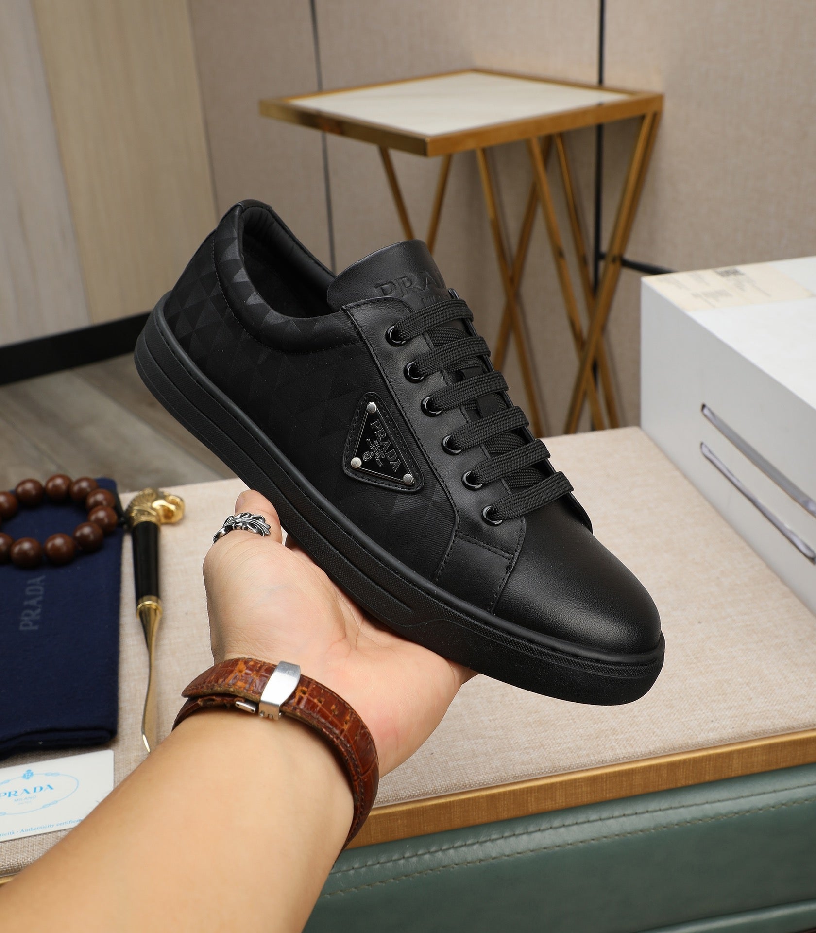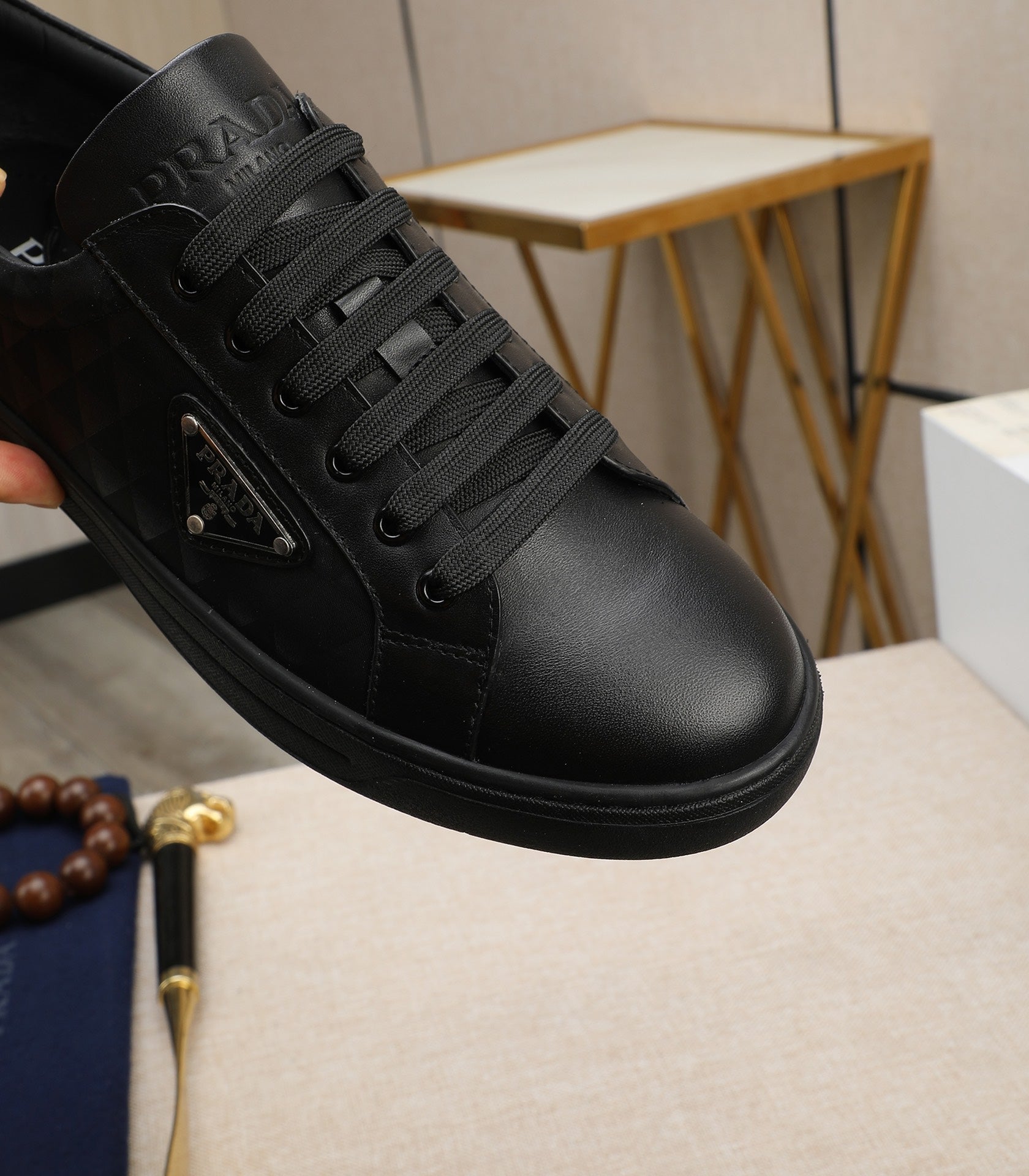 PRA RE-NYLON SNEAKERS IN BLACK LEATHER AND FABRIC