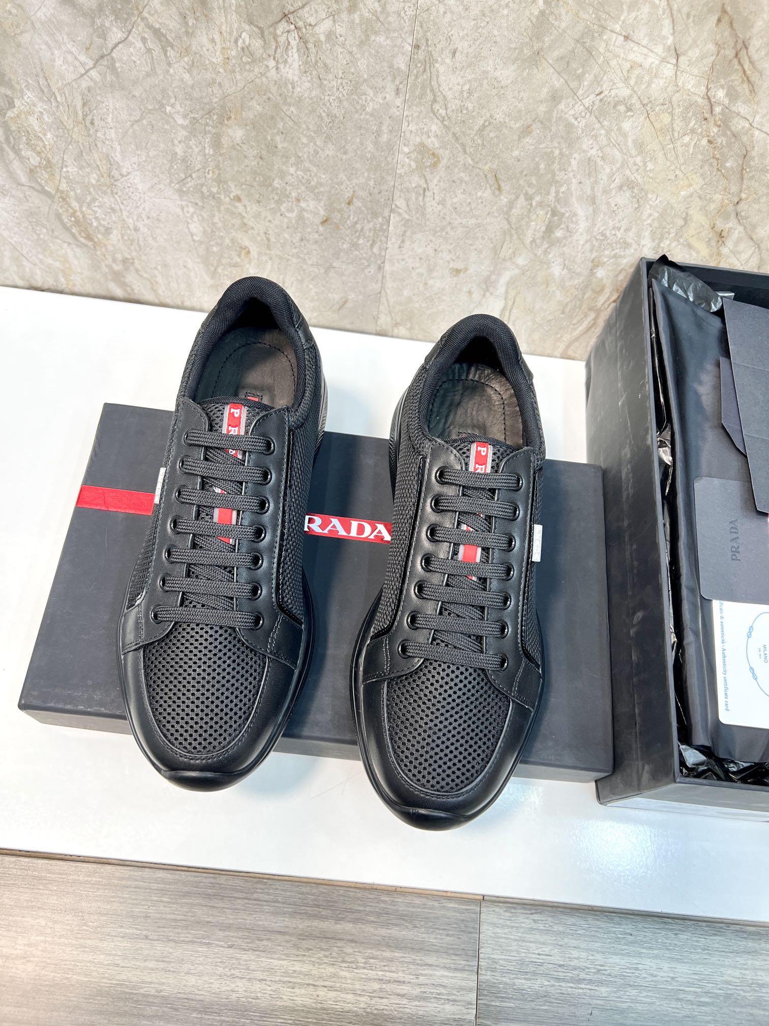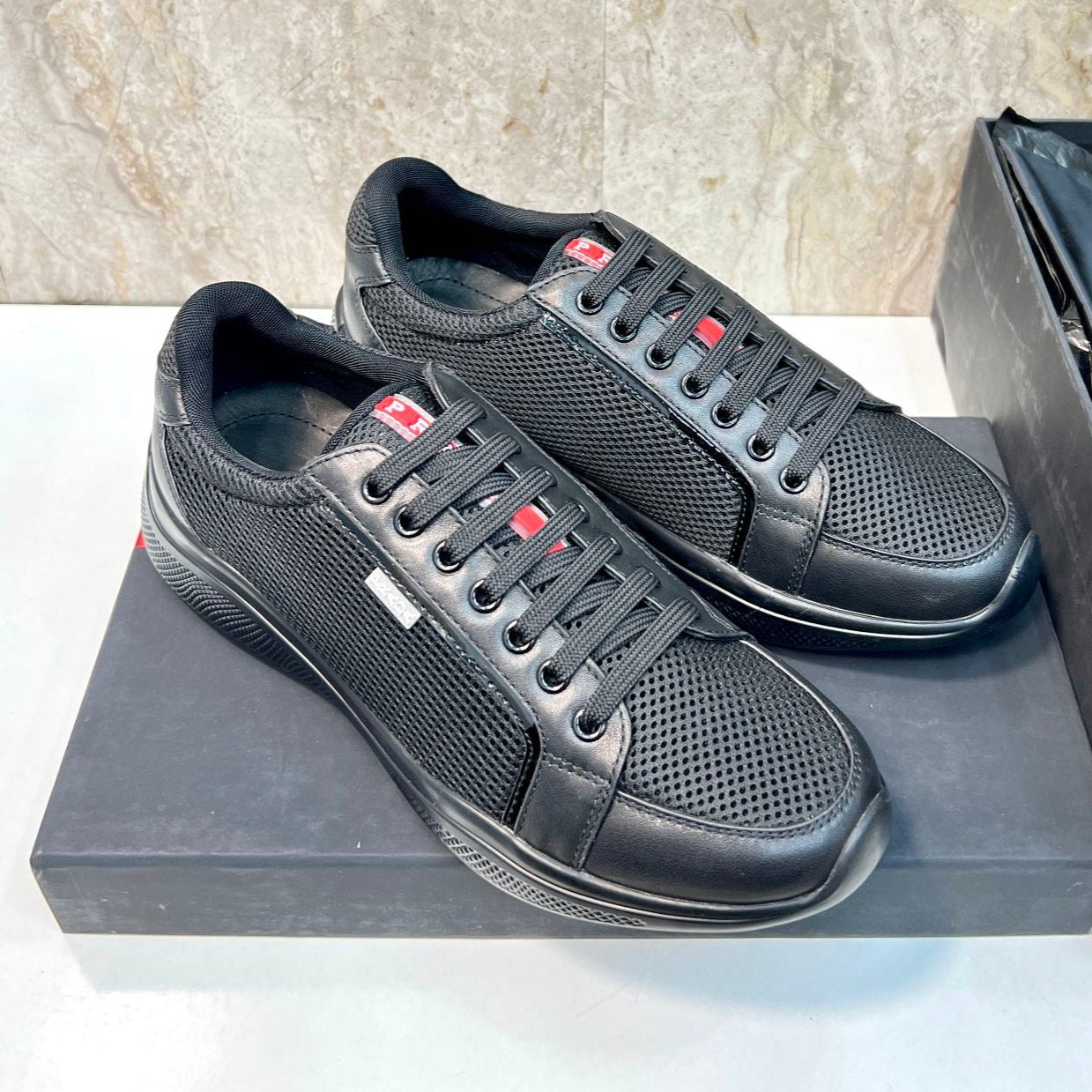 PRA SNEAKER BLACK CALFSKIN AND MESH FABRIC