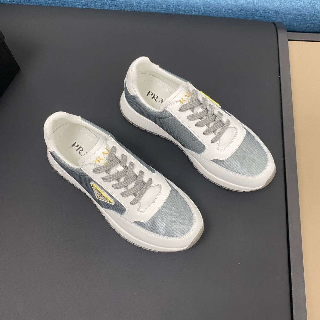PRA SNEAKER IN WHITE CALFSKIN AND SILVER FABRIC WITH GOLDEN LOGO