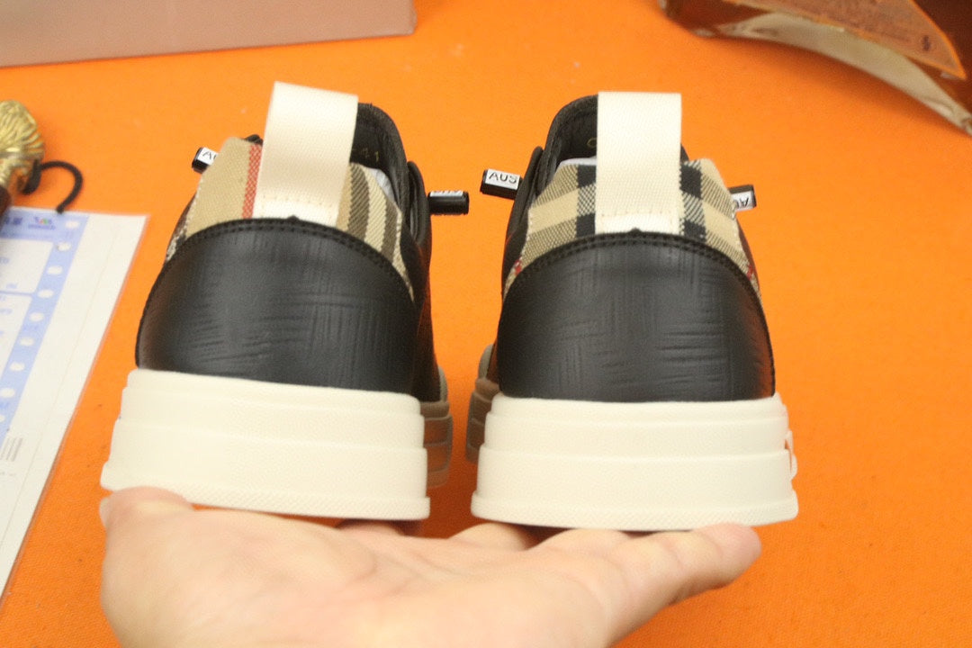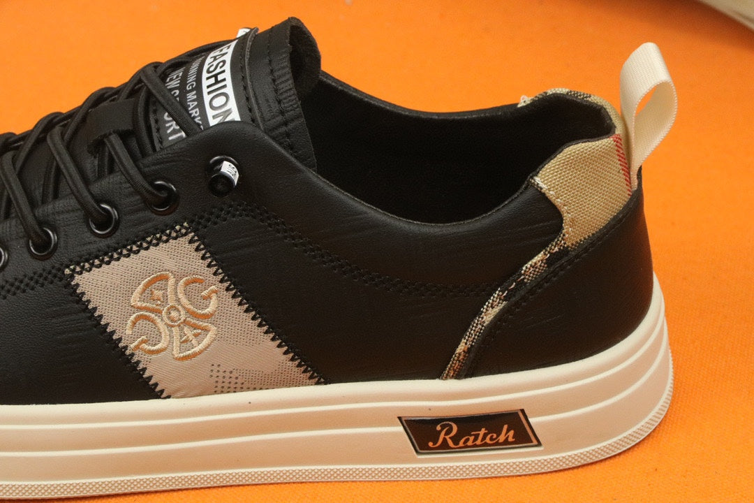 PRA TRAINER IN BLACK CALFSKIN AND TAN EMBROIDERED FABRIC