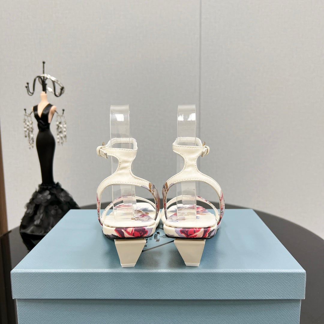 PRA TRIANGLE HEEL FLOWER MOTIF SATIN SANDALS WHITE