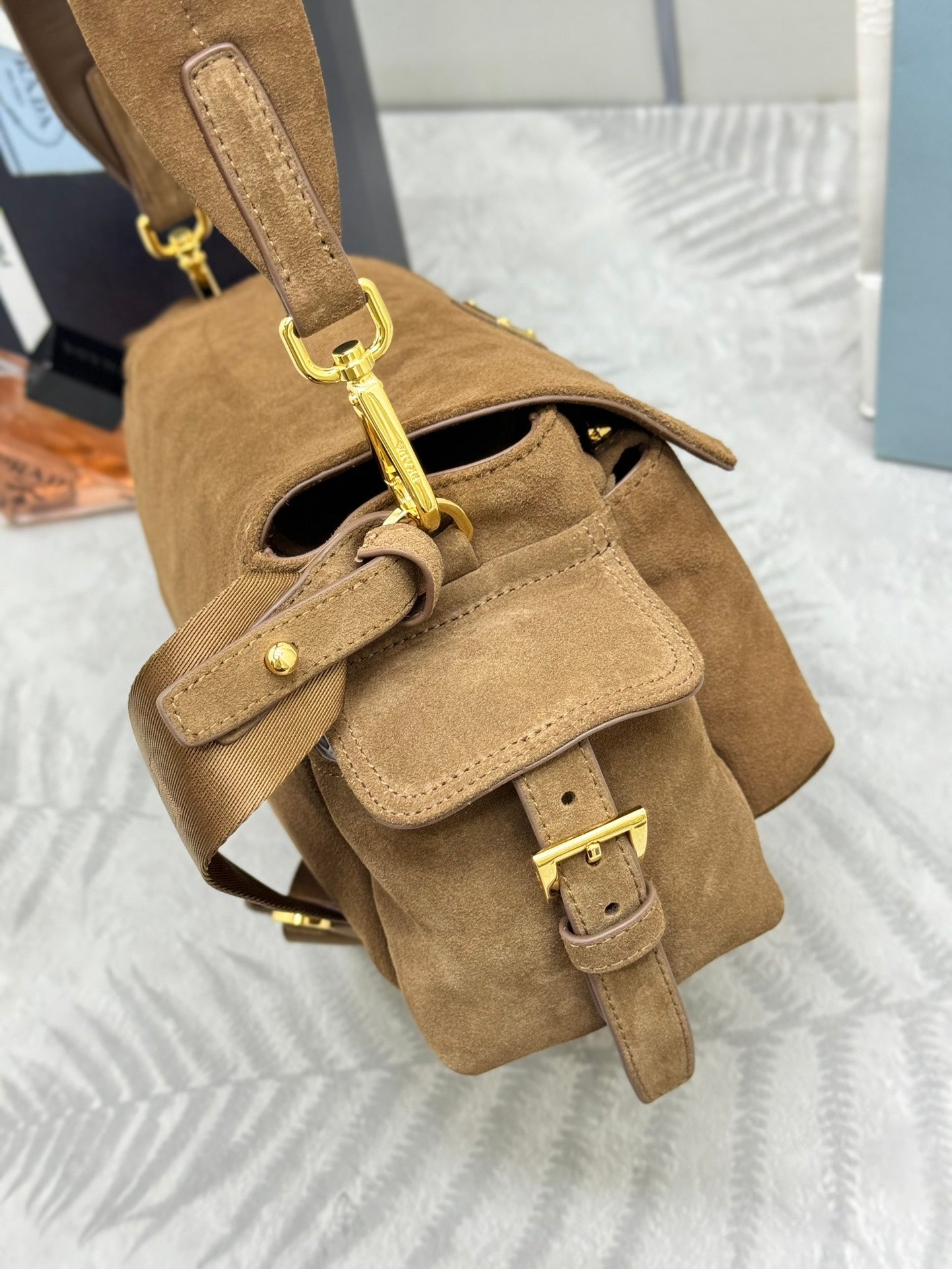 PRADA 25S EXPLORE MEDIUM SHOULDER BAG 30 IN CINNAMON SUEDE WITH FLAP