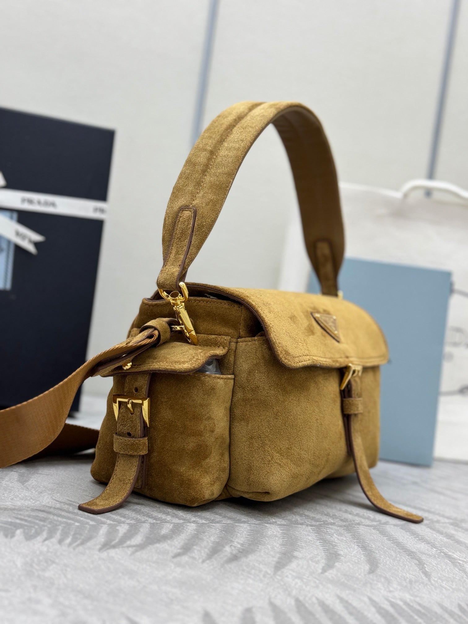 PRADA 25S EXPLORE MEDIUM SHOULDER BAG 30 IN DARK GOLDEN BROWN SUEDE WITH FLAP
