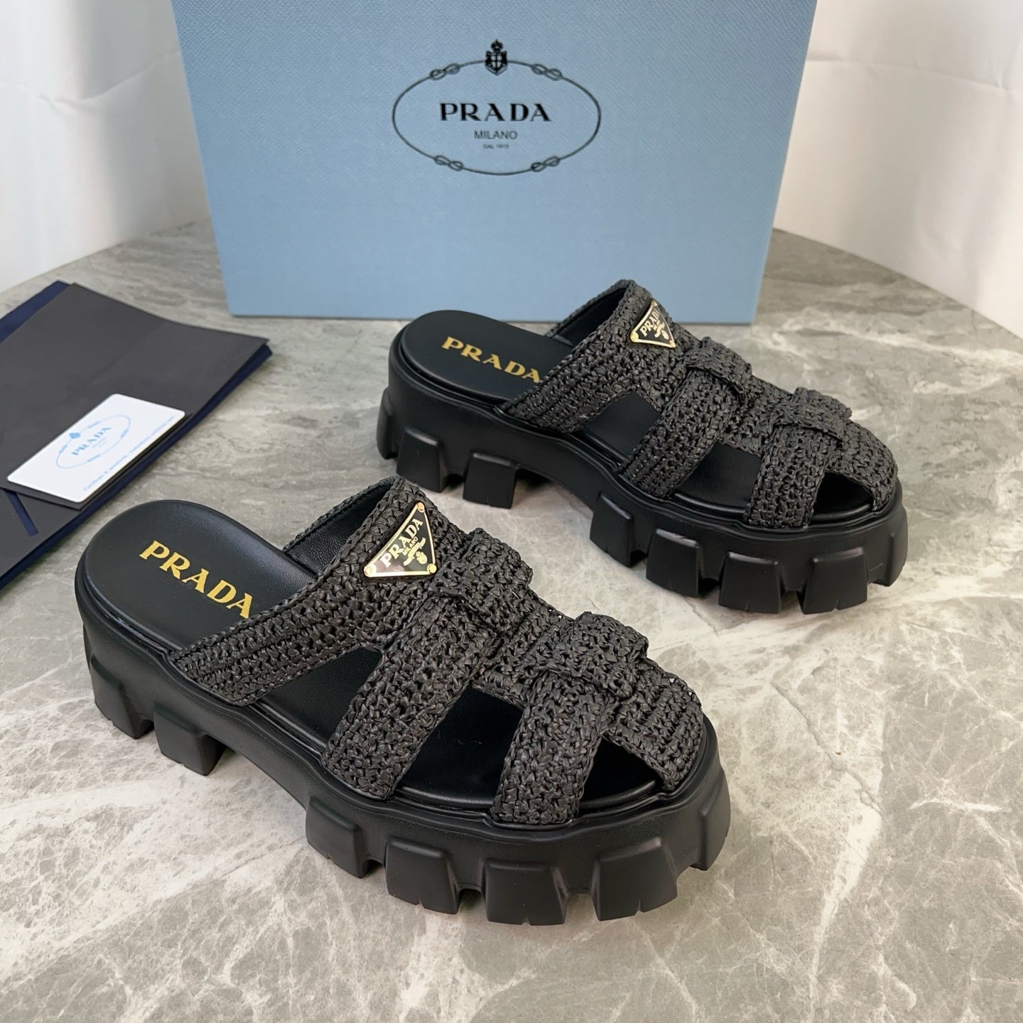 PRADA 25S MONOLITH RUBBER MULES IN BLACK RAFFIA AND LAMBSKIN