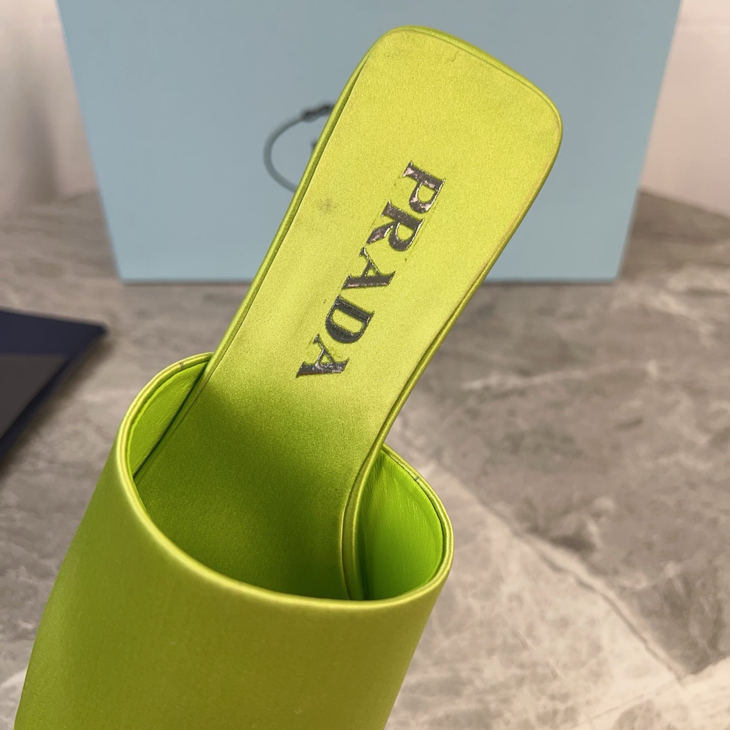 PRADA 25S TRIANGLE HEEL SANDALS 35MM IN LIME YELLOW SATIN