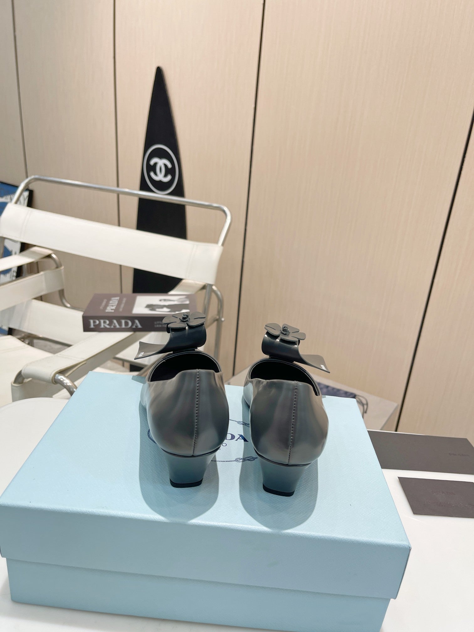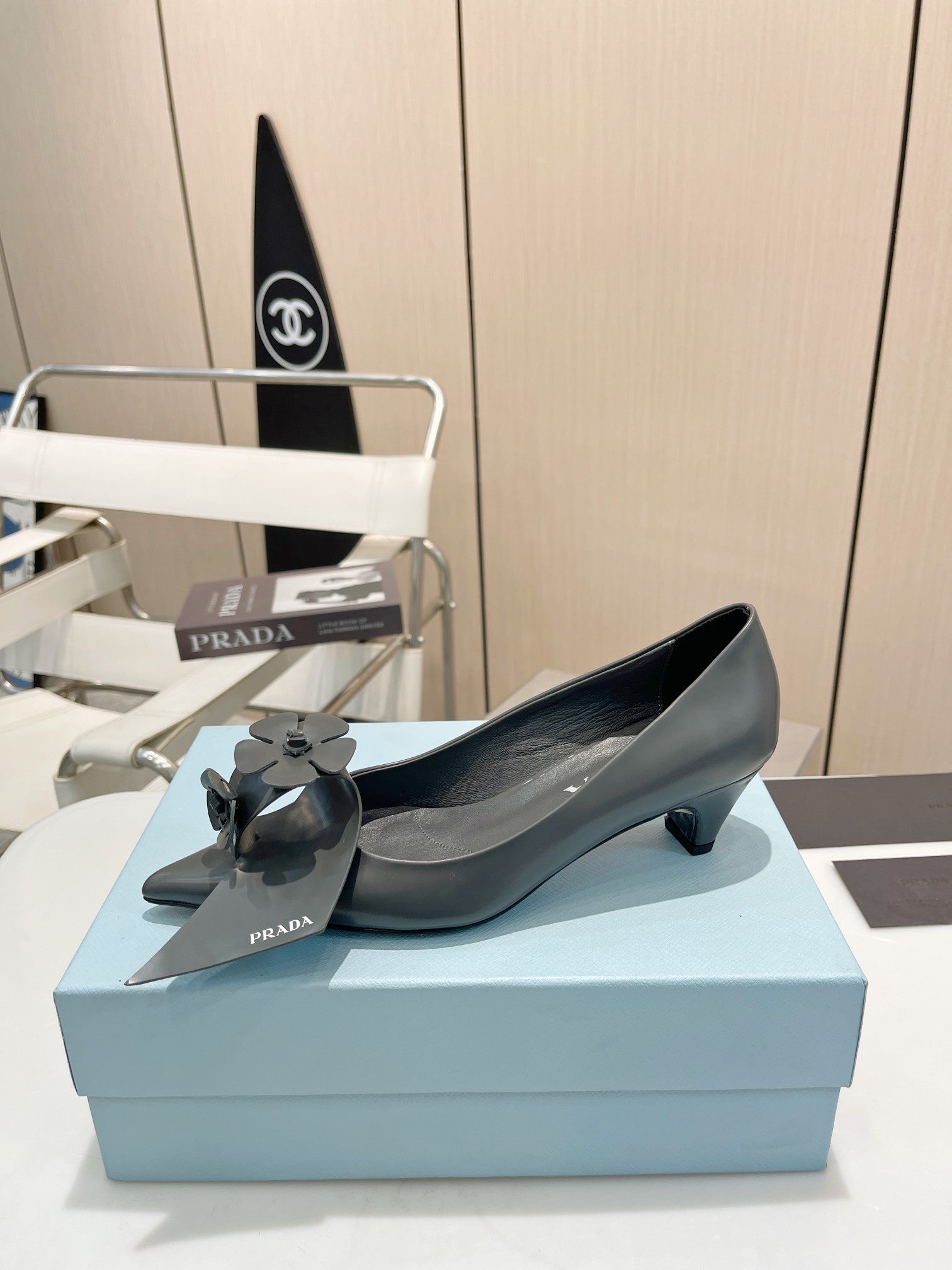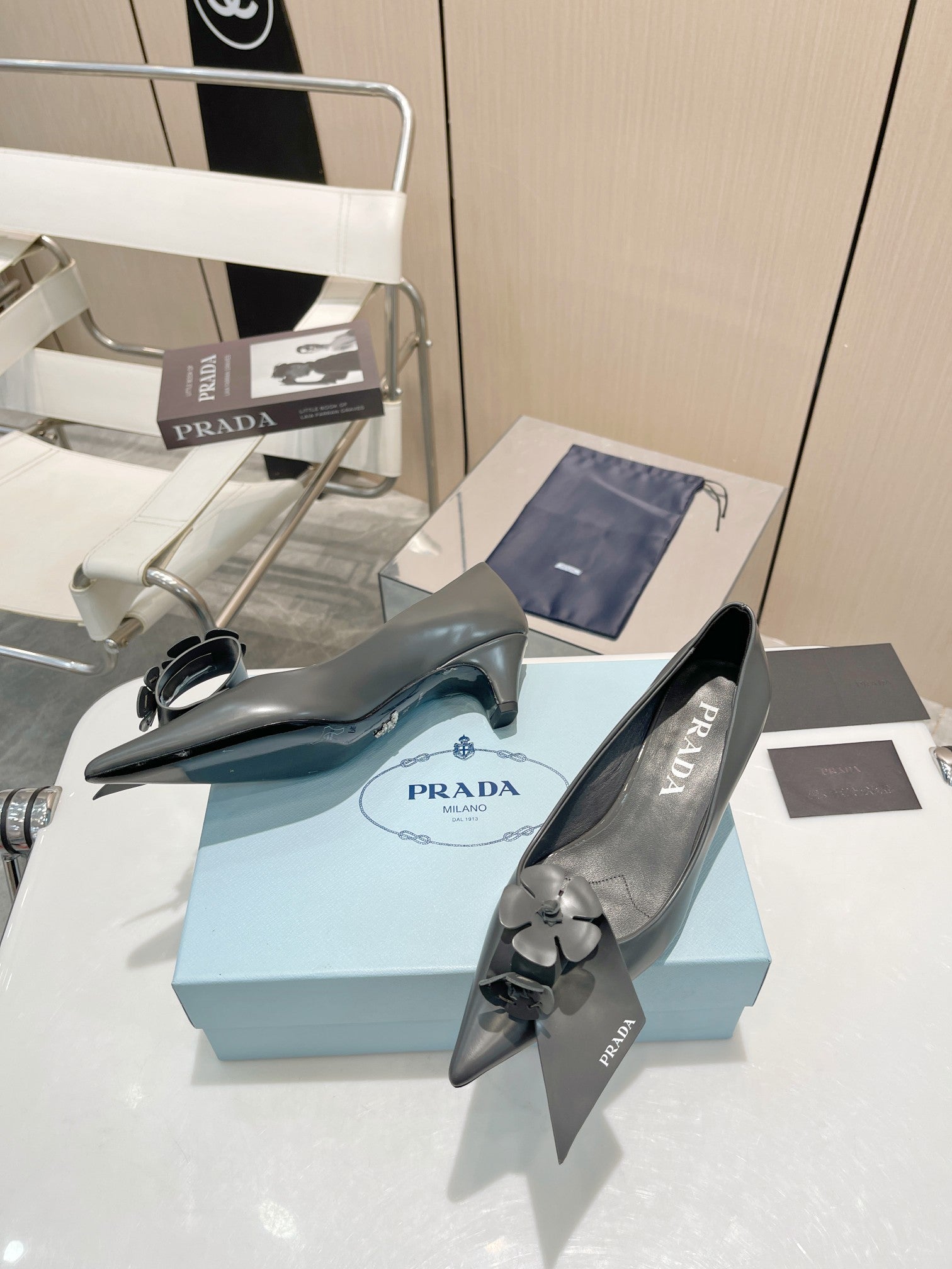 PUMPS KITTEN HEEL IN GRAY SHINY CALFSKIN ATTACHED FLOWERS