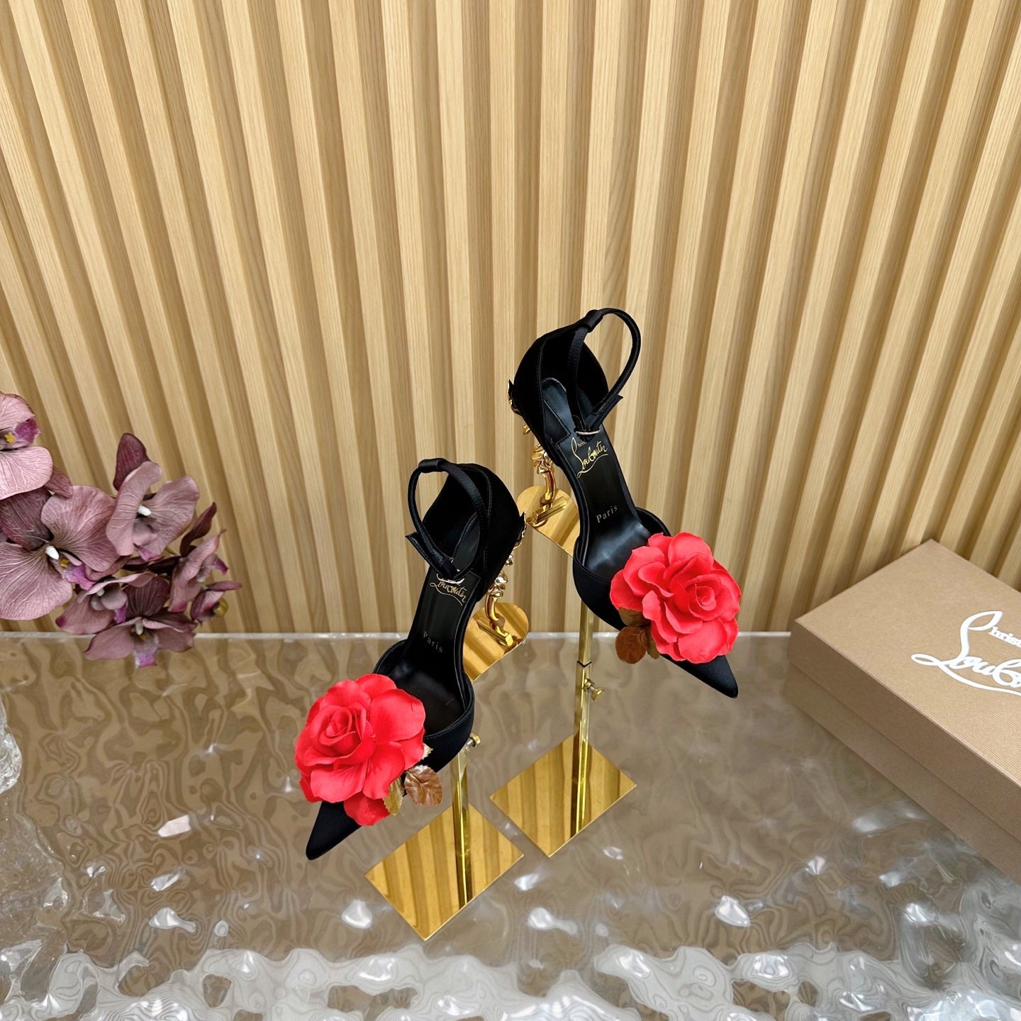 RED BELLAROSE STRAP PUMPS 110MM IN BLACK CREPE SATIN