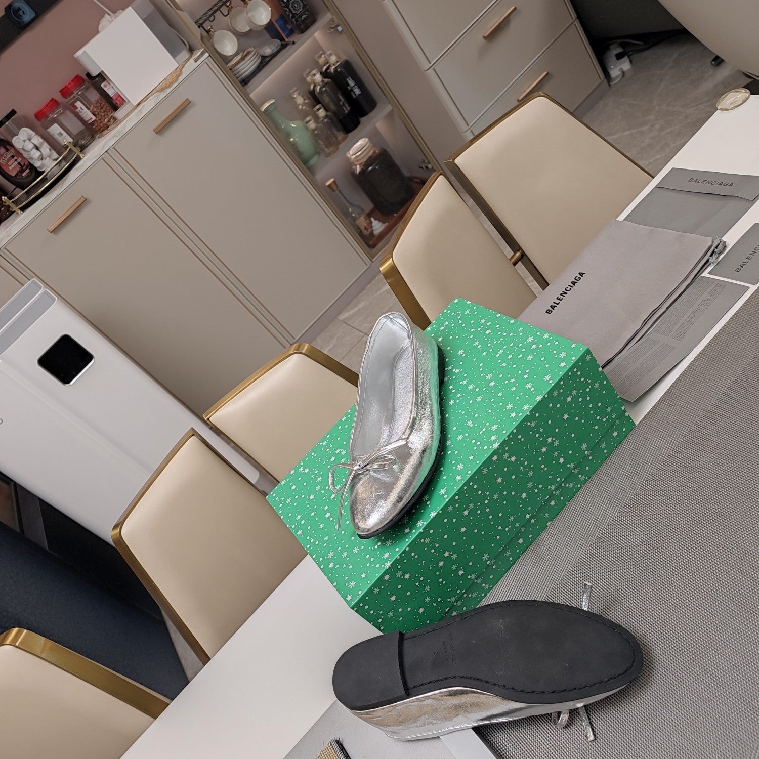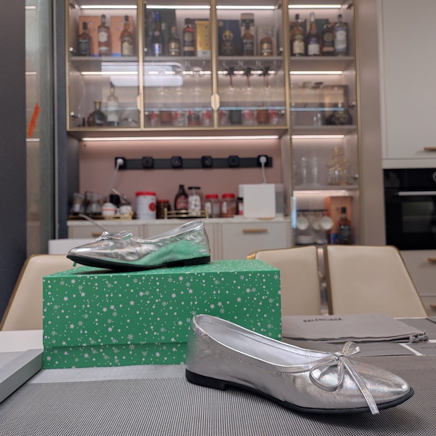 RHINESTONE BALLET FLATS WITH BOW IN SILVER WAX-OIL SHEEPSKIN