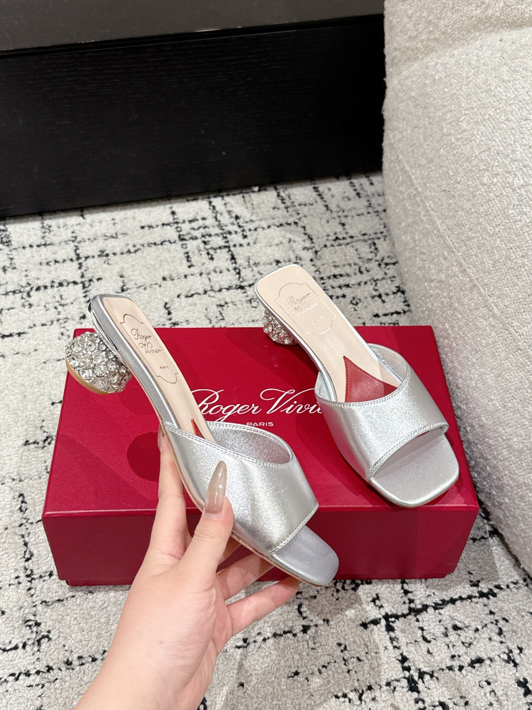 ROGER VIVIER 25S CRYSTAL HEEL MULE IN SILVER CALFSKIN