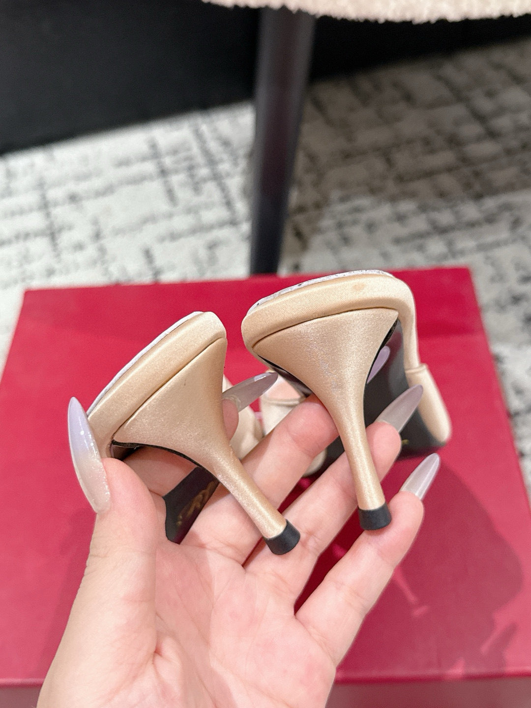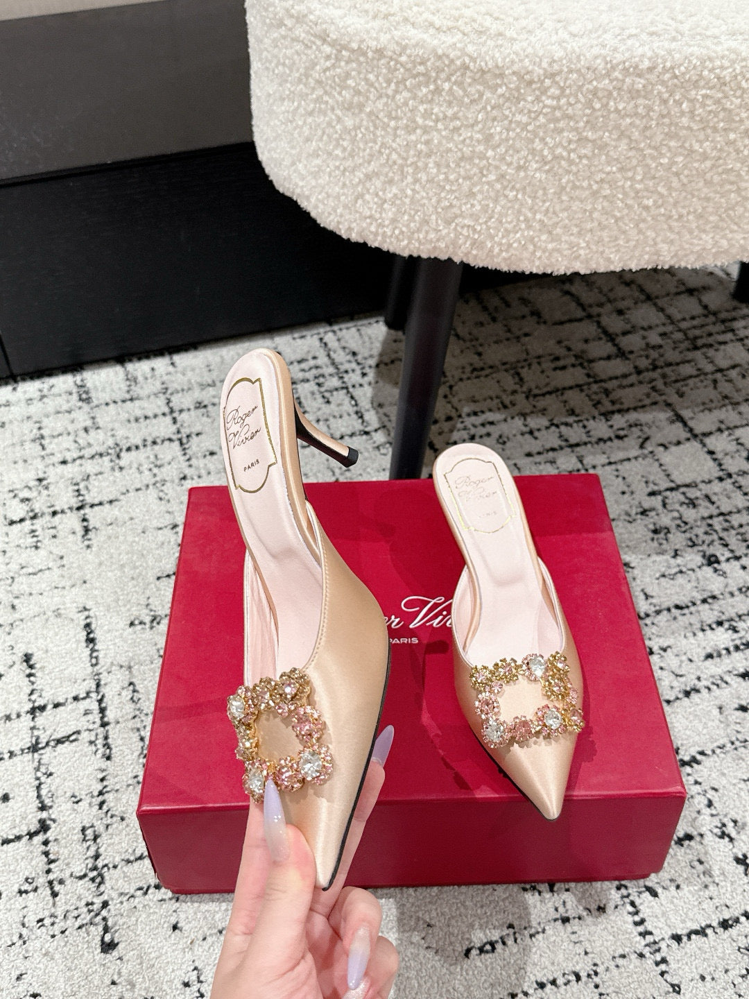 ROGER VIVIER 25S EFFLORESCENCE MULES 65MM IN GOLD SATIN EMBELLISHED CRYSTALS