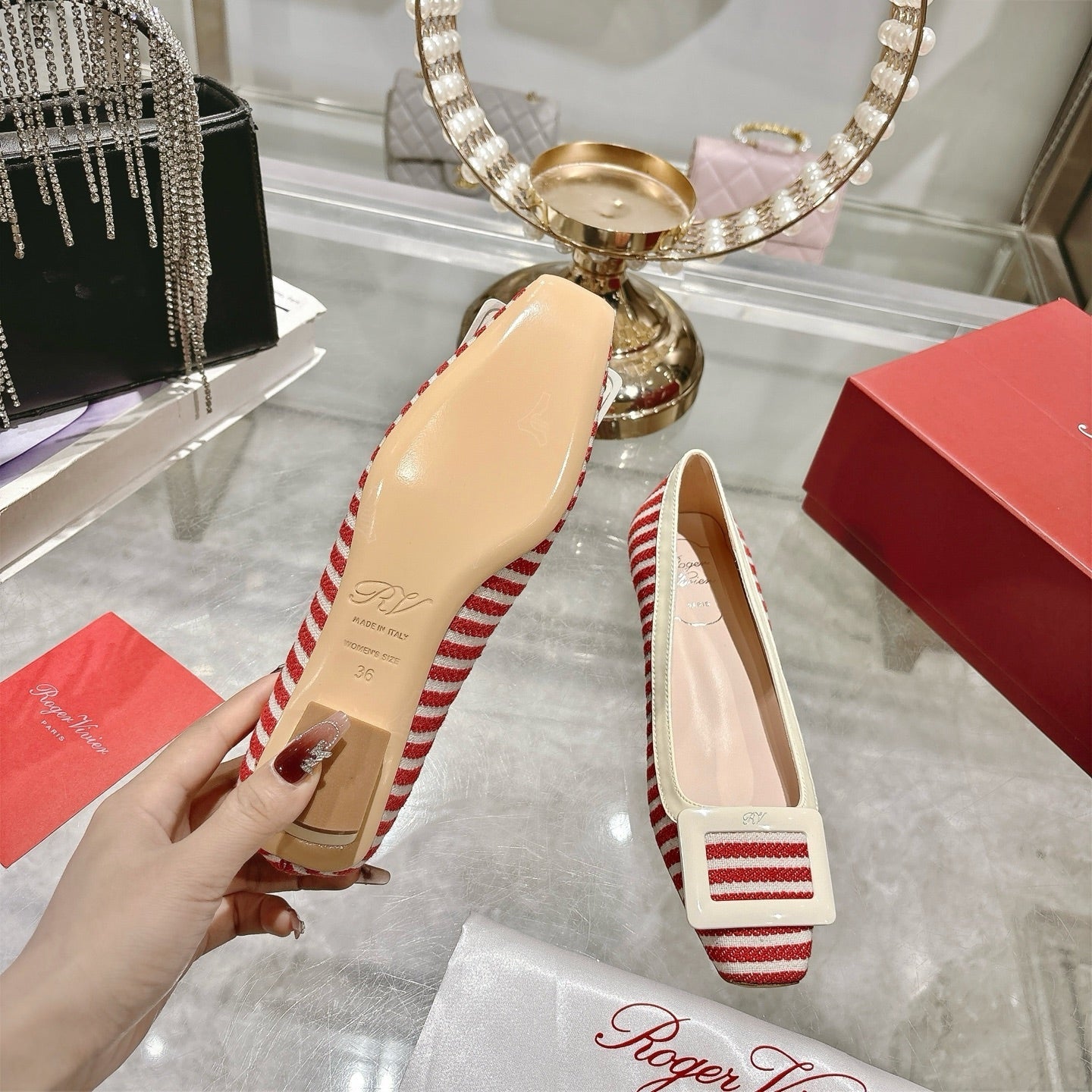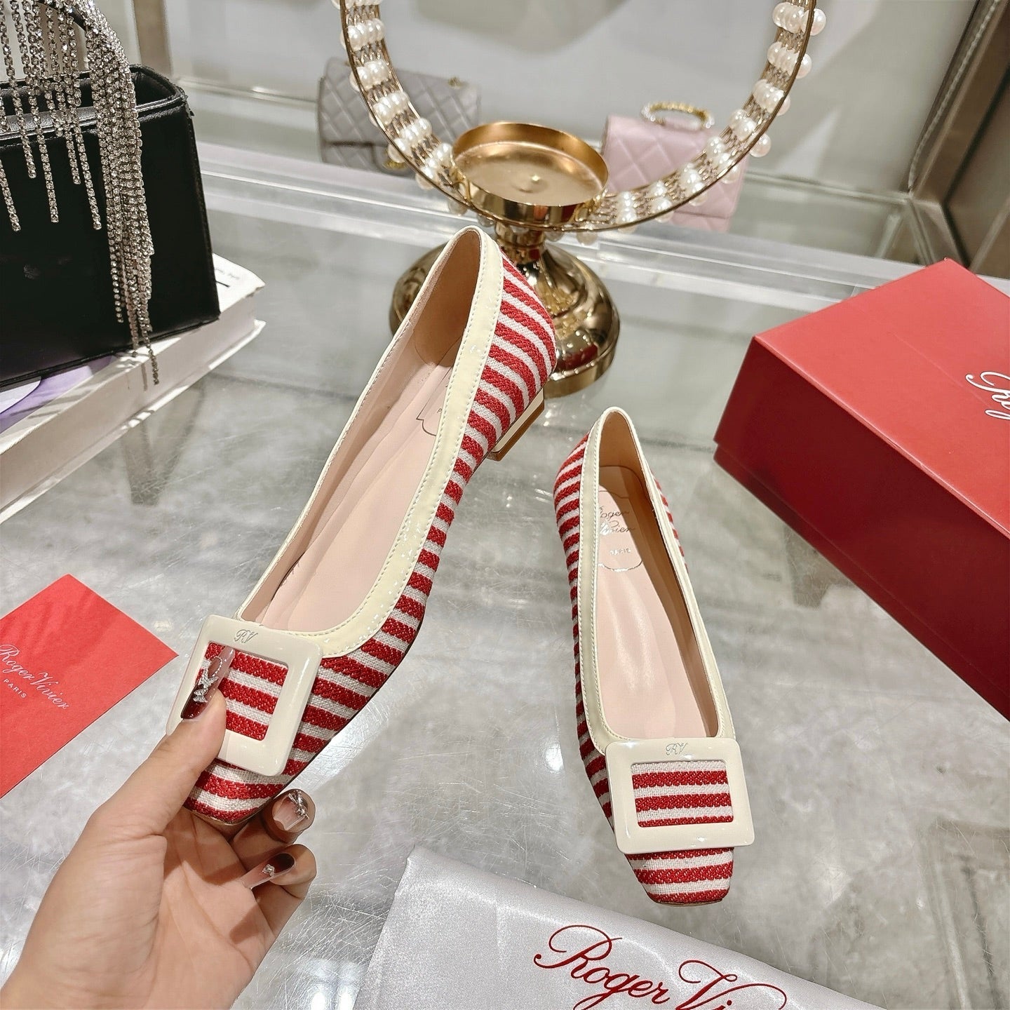 ROGER VIVIER 25S TROMPETTE BALLERINAS 25MM IN RED PLAID PATTERN CANVAS