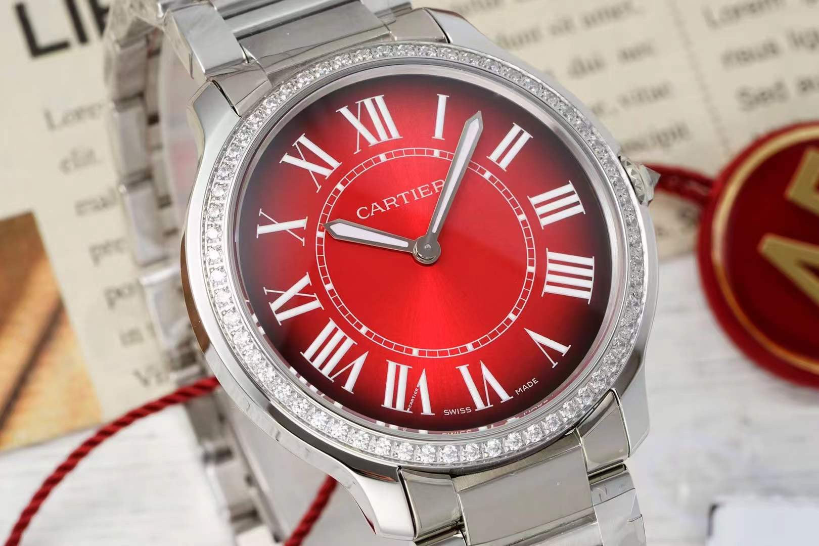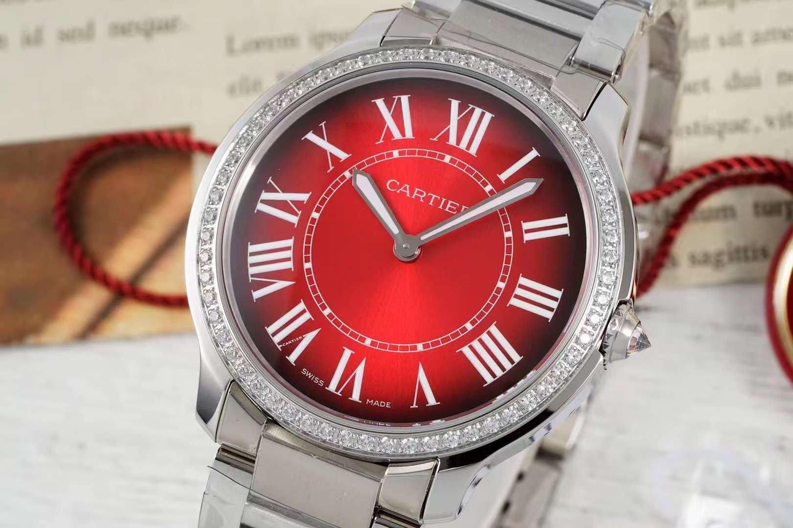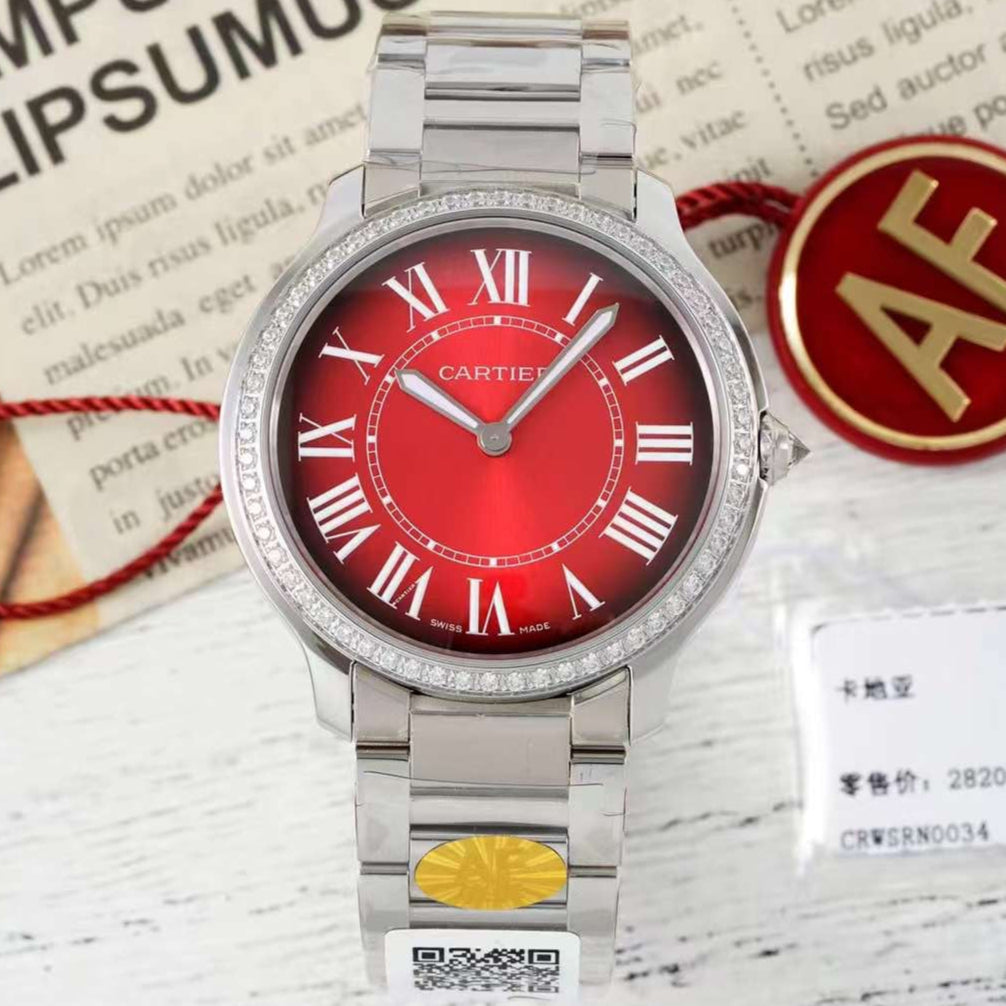 RONDE MUST DE CARTIER WATCH SILVER CASE AND CHERRY RED DIAL WITH CRYSTALS