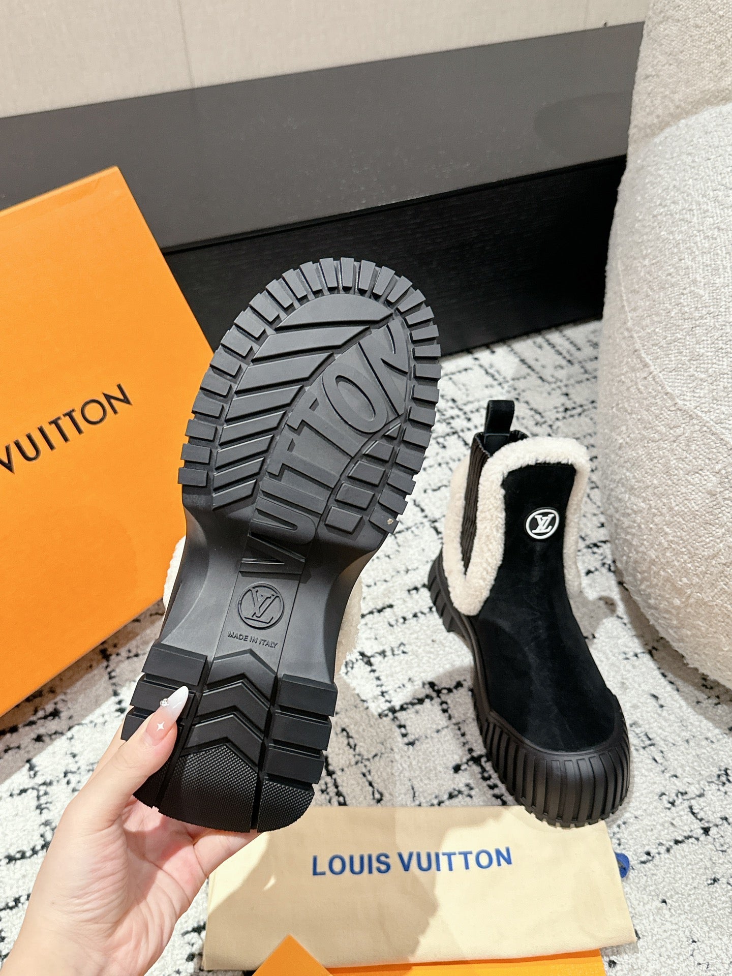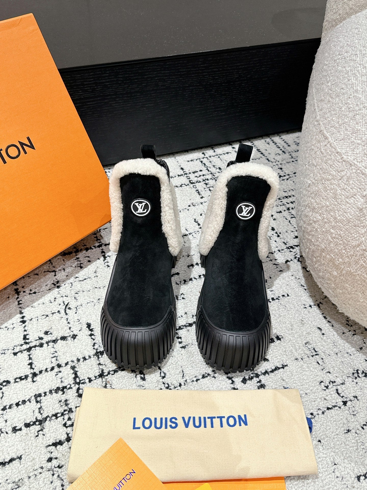 RUBY FLAT ANKLE BOOT IN BLACK SUEDE WITH WHITE SHEARLING