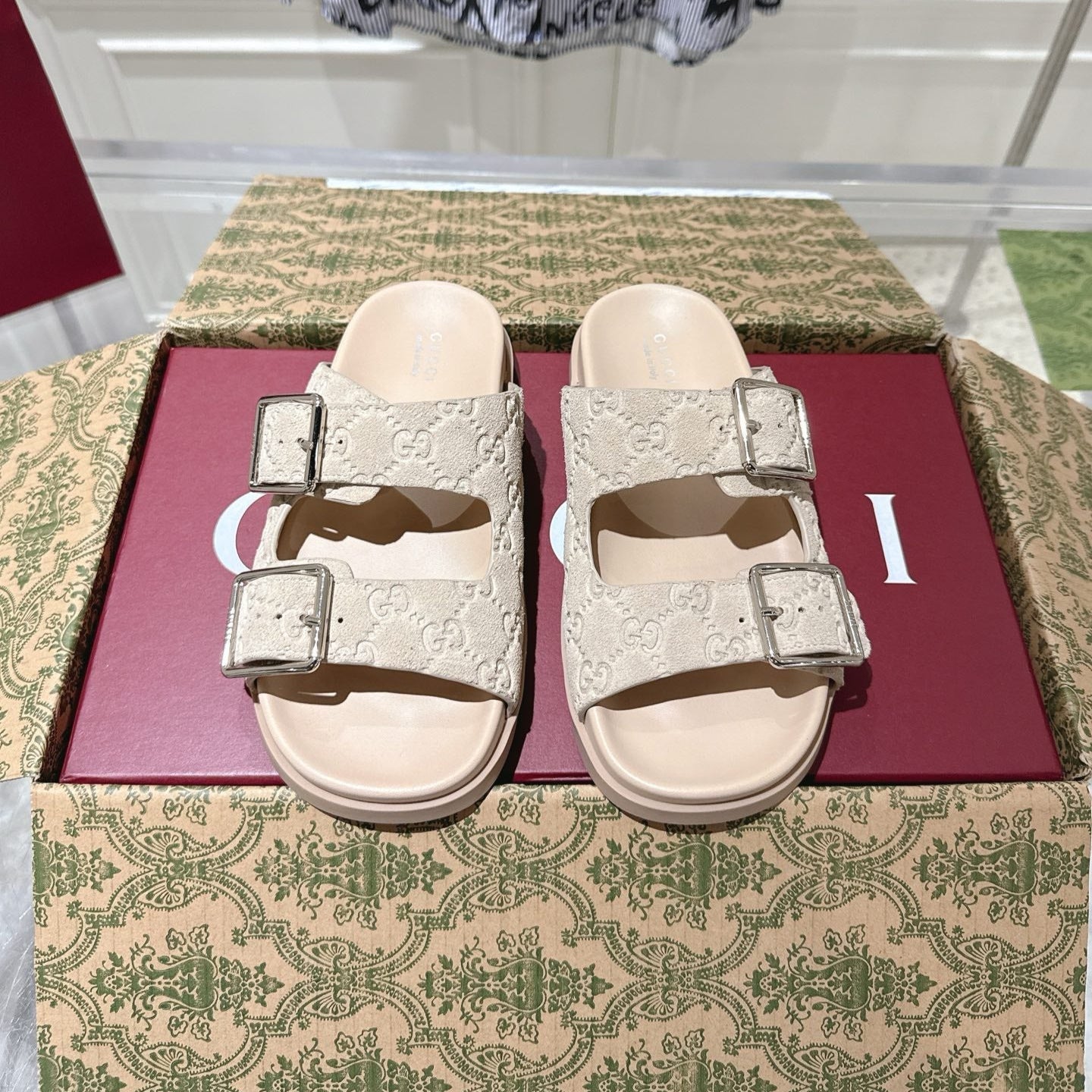SANDALS IN NUDE BEIGE SUEDE EMBOSSED LOGO SILVER HARDWARE