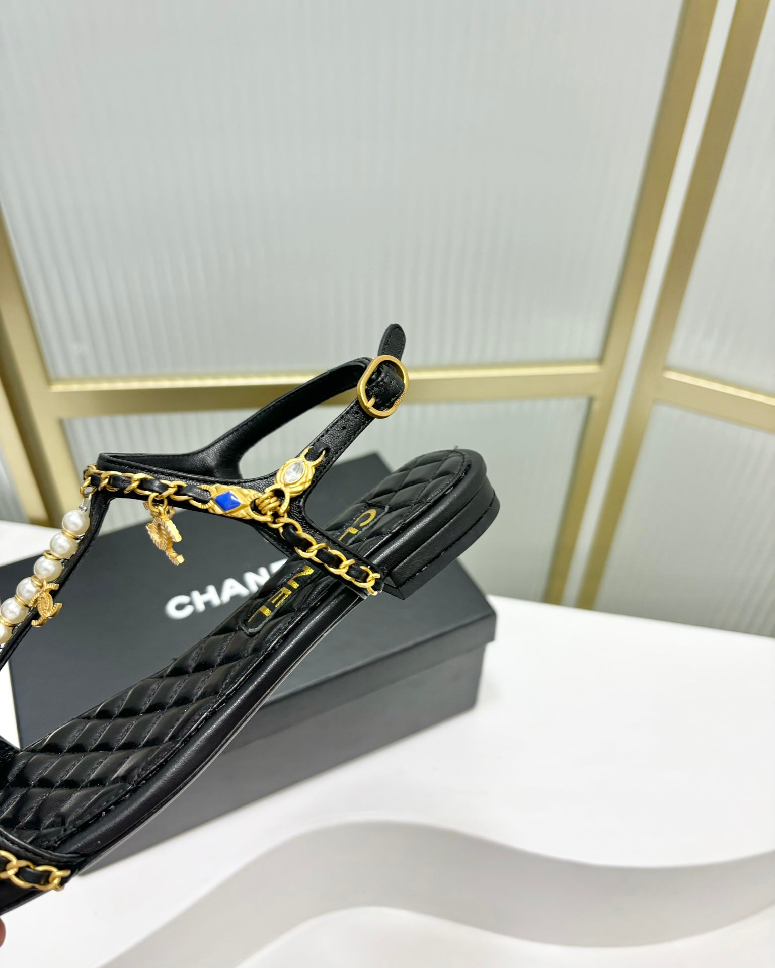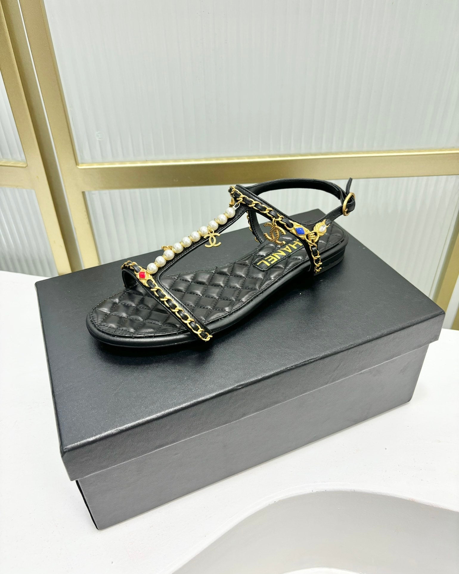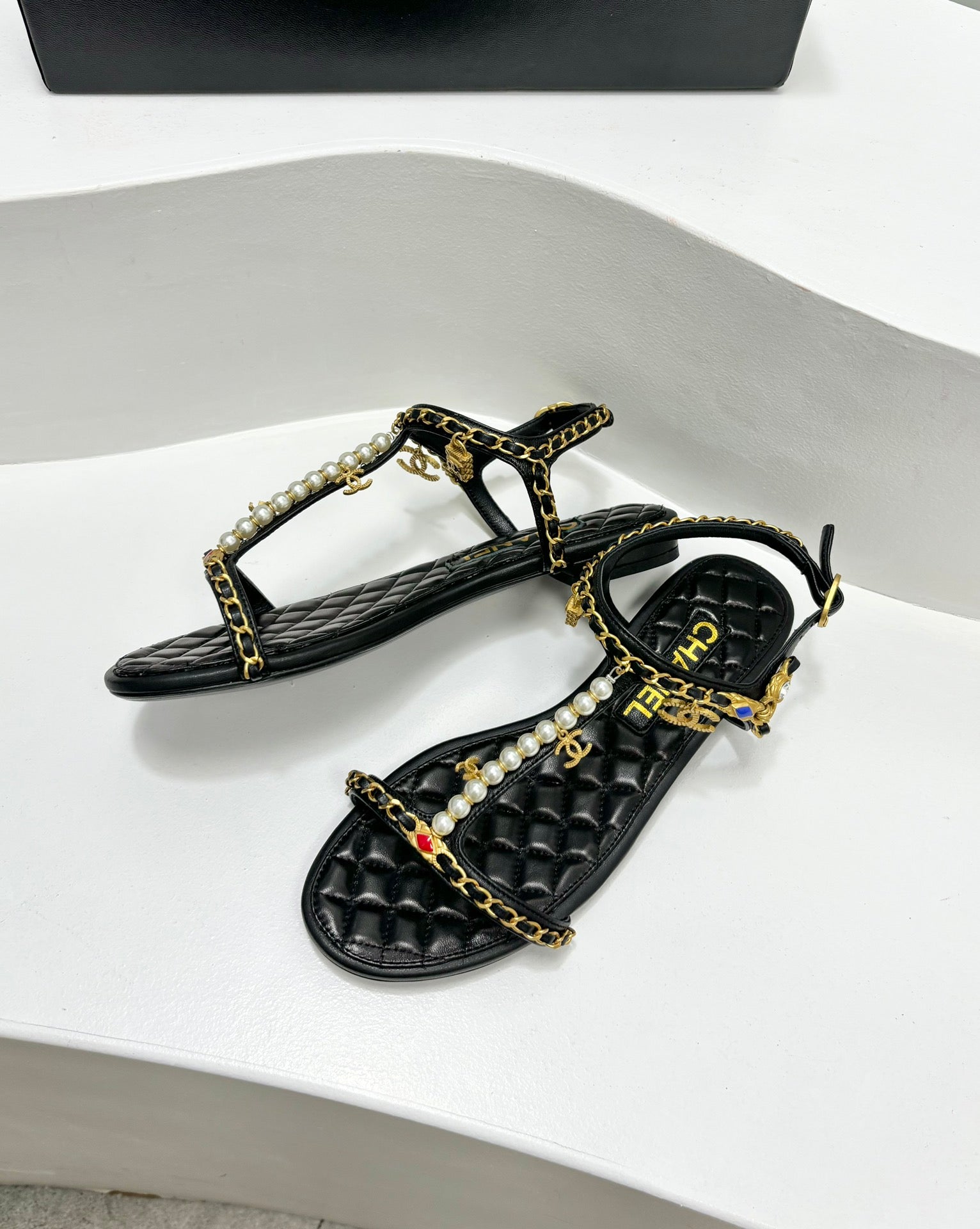 SANDALS PEARL CHAIN IN BLACK COWHIDE