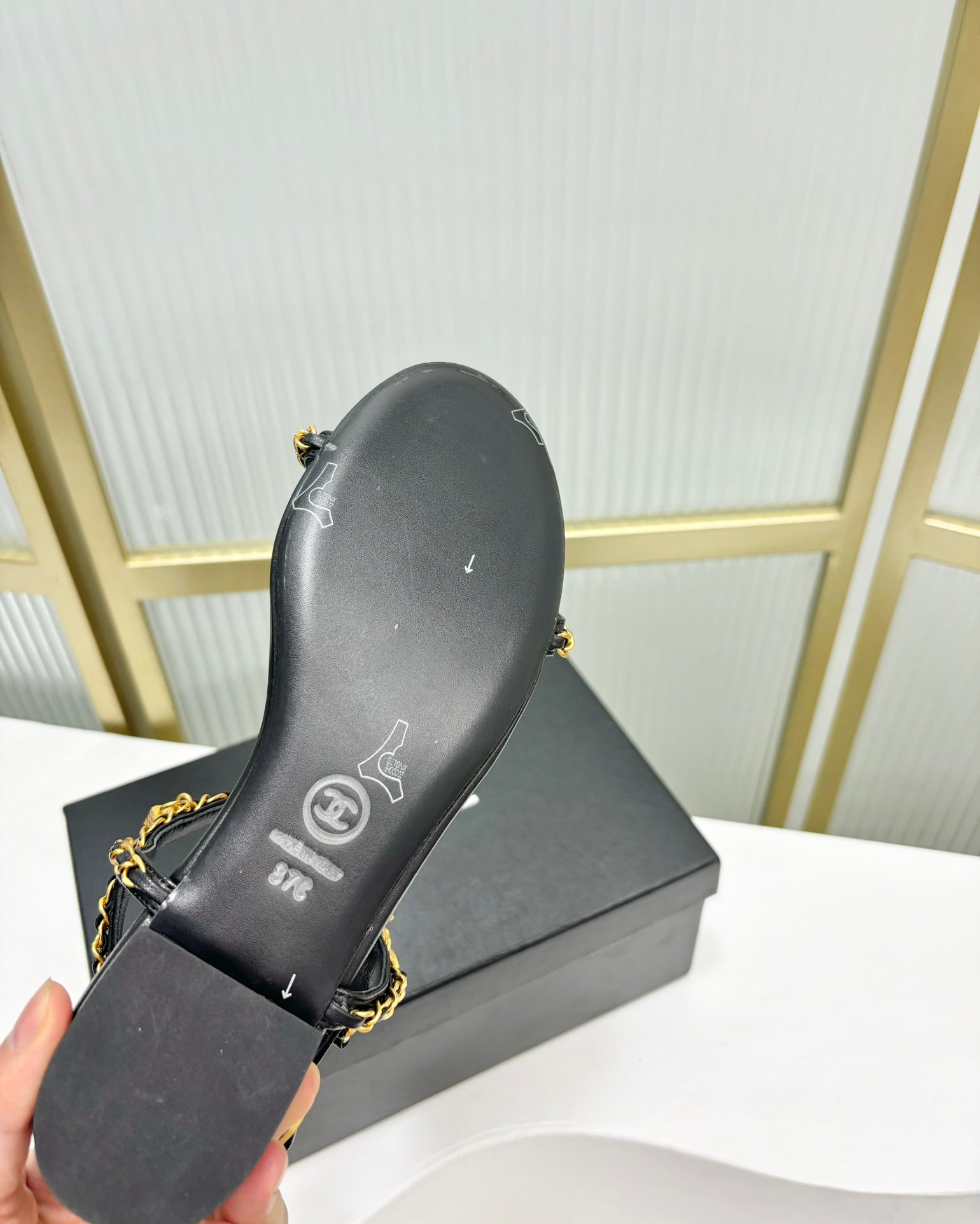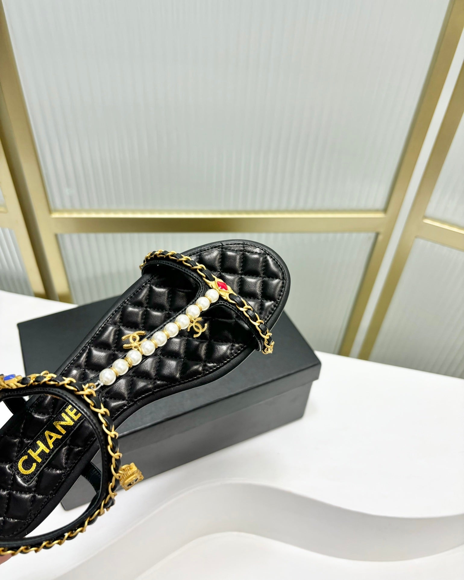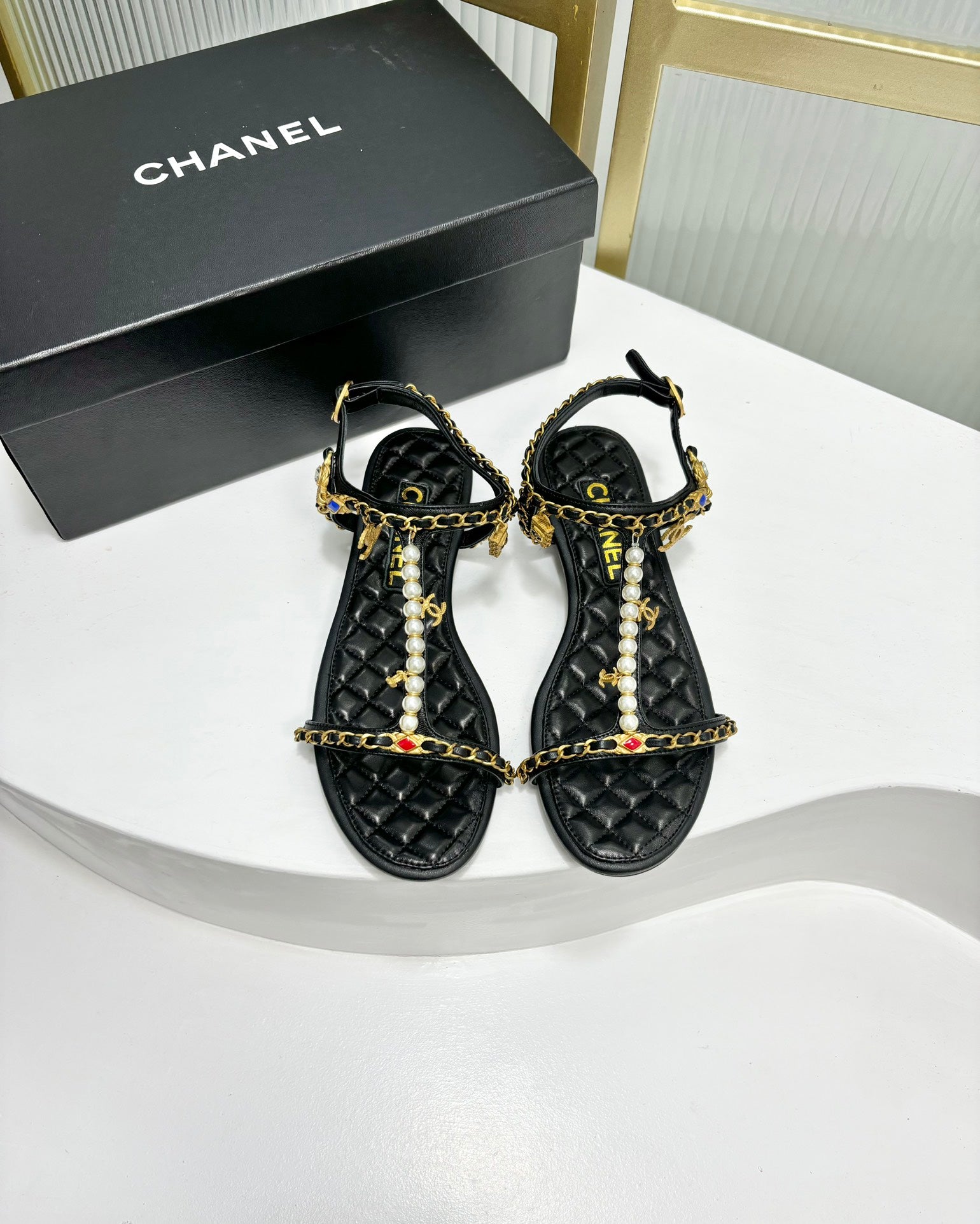 SANDALS PEARL CHAIN IN BLACK COWHIDE