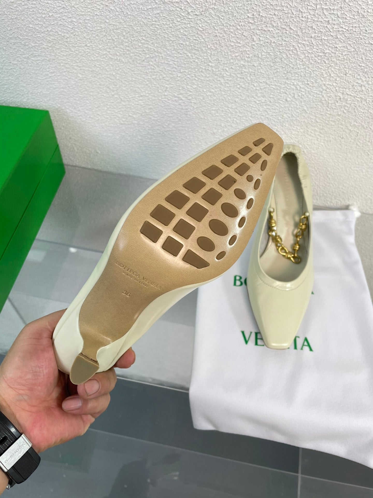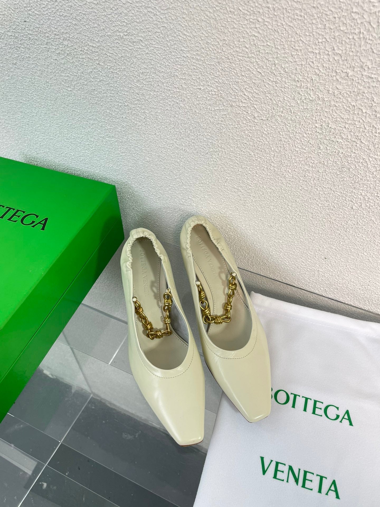SHARP CHAIN PUMP 6 CM IN BONE WHITE CALFSKIN