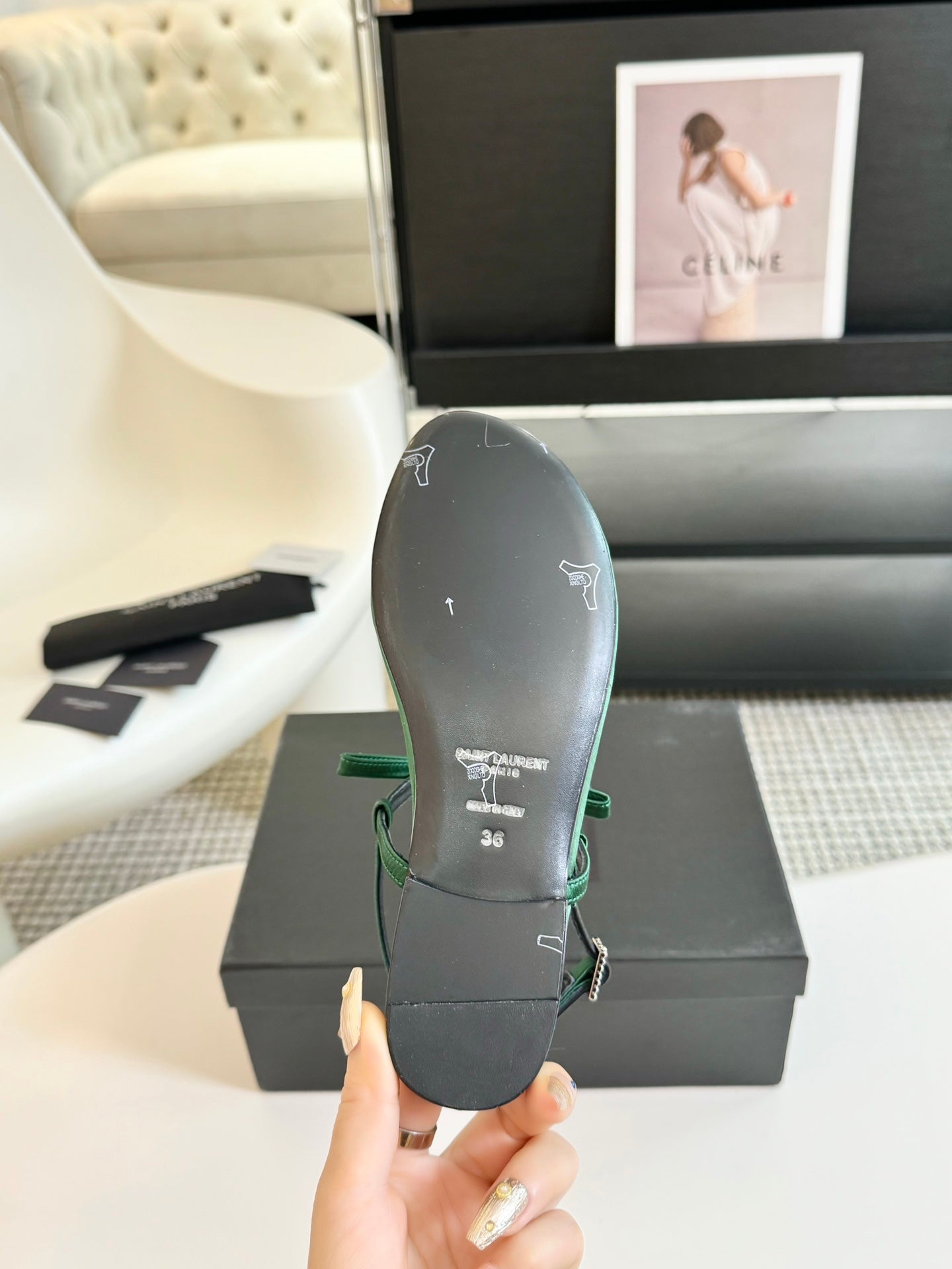 SL CRYSTAL T-STRAP FLAT SANDAL DARK GREEN SATIN