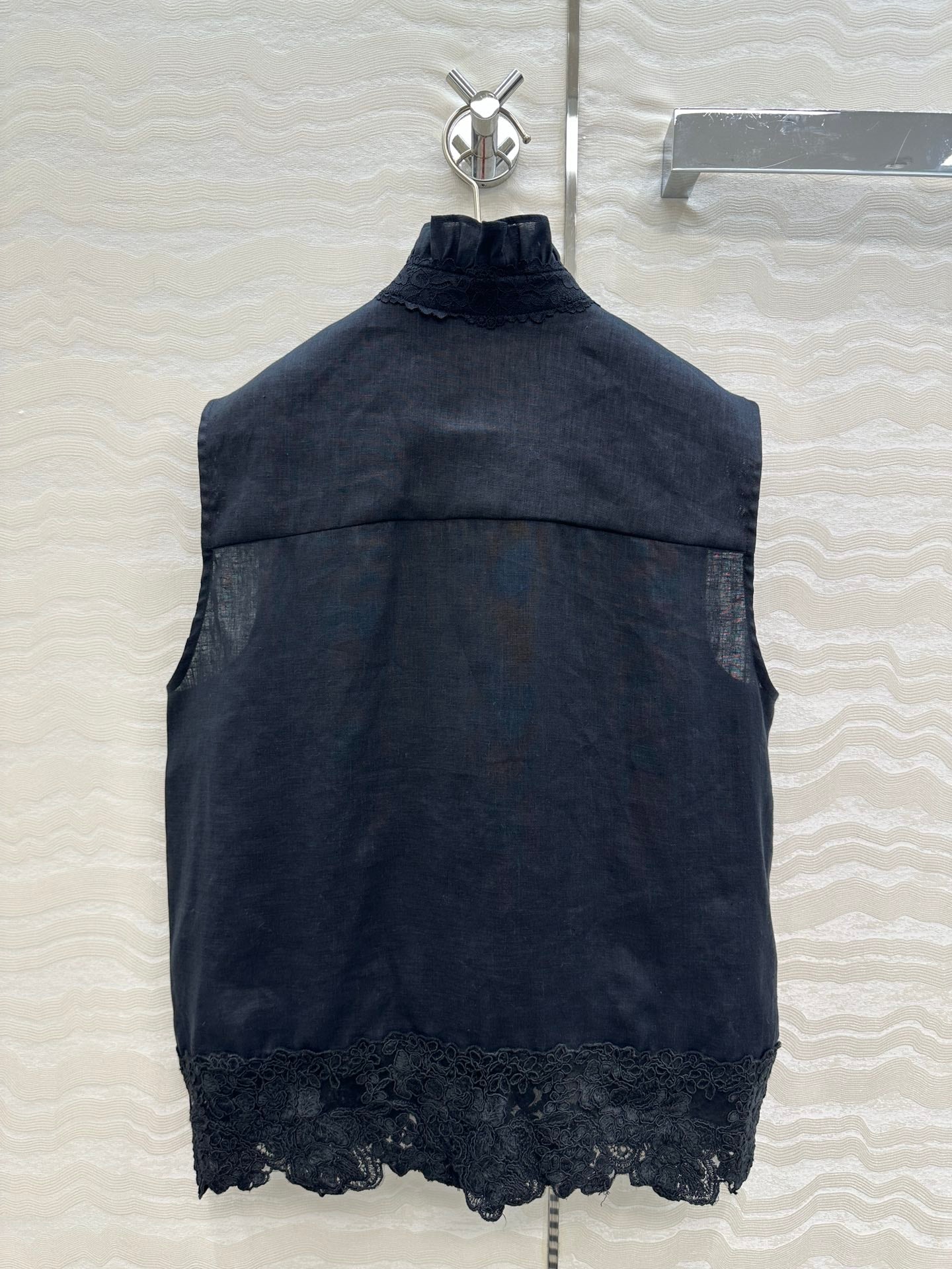 SLEEVELESS BLOUSE IN BLACK LINEN LACE TRIM AND NECK TIE