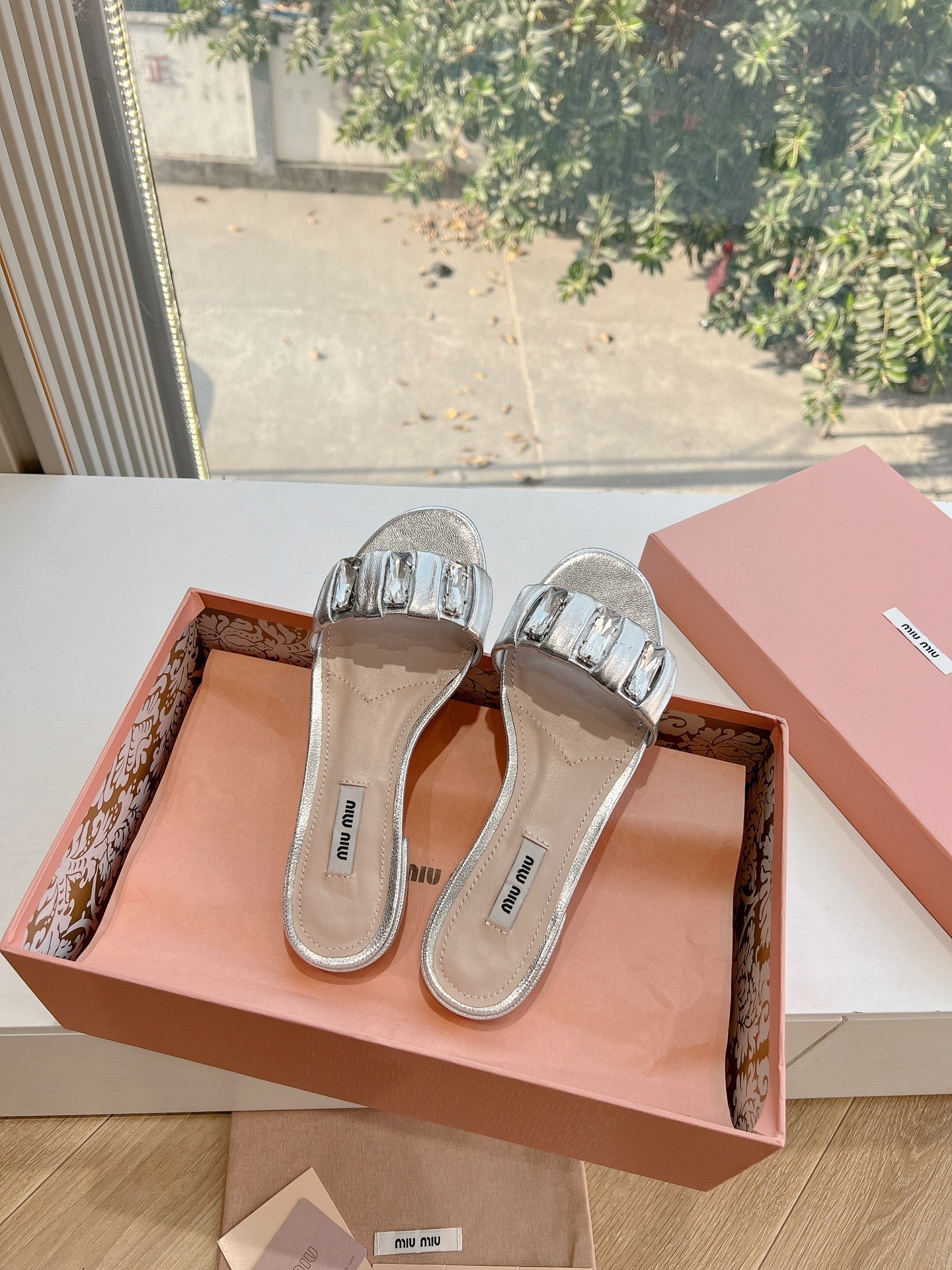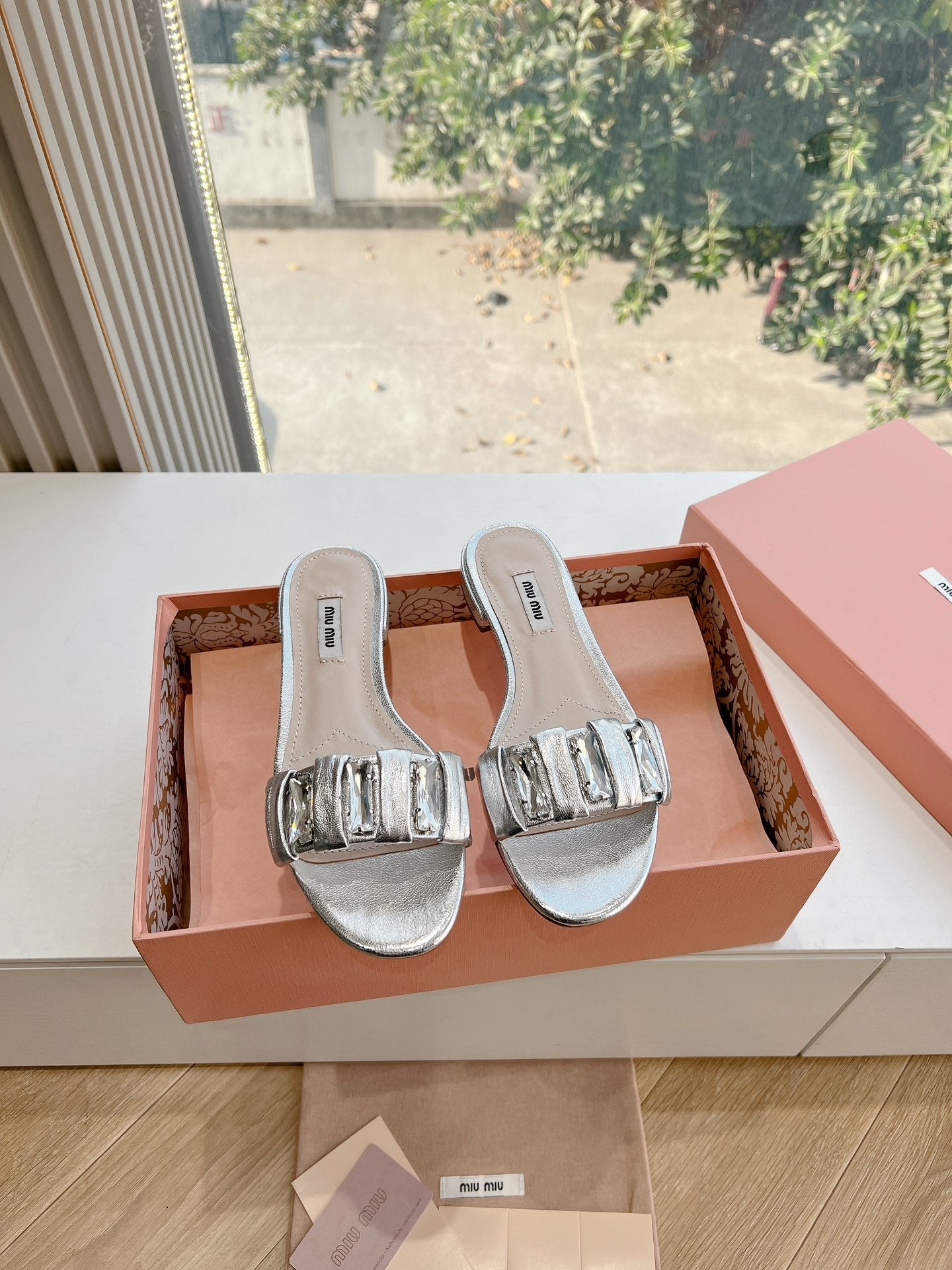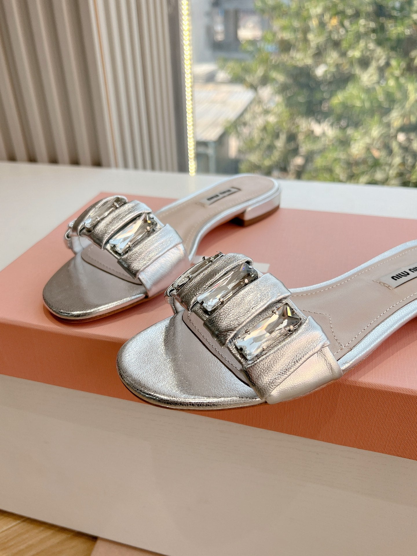 SLIDE SANDALS ATTACHED DIAMOND IN SILVER METALLIC LAMBSKIN