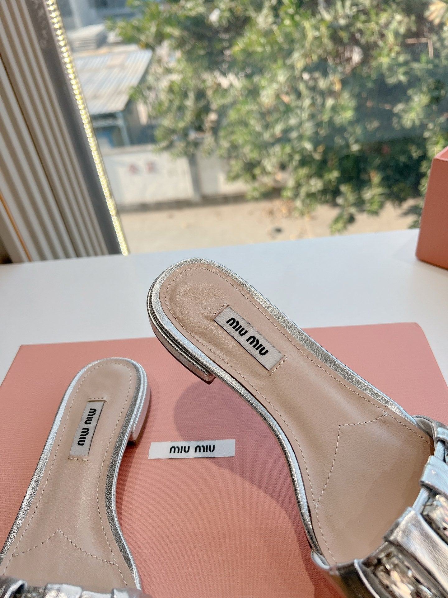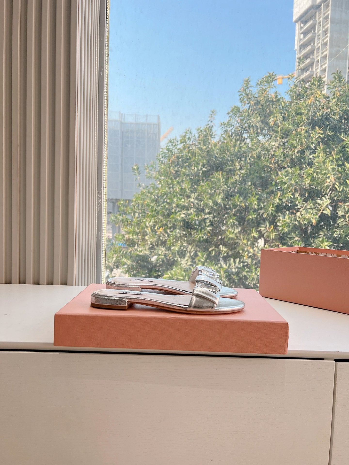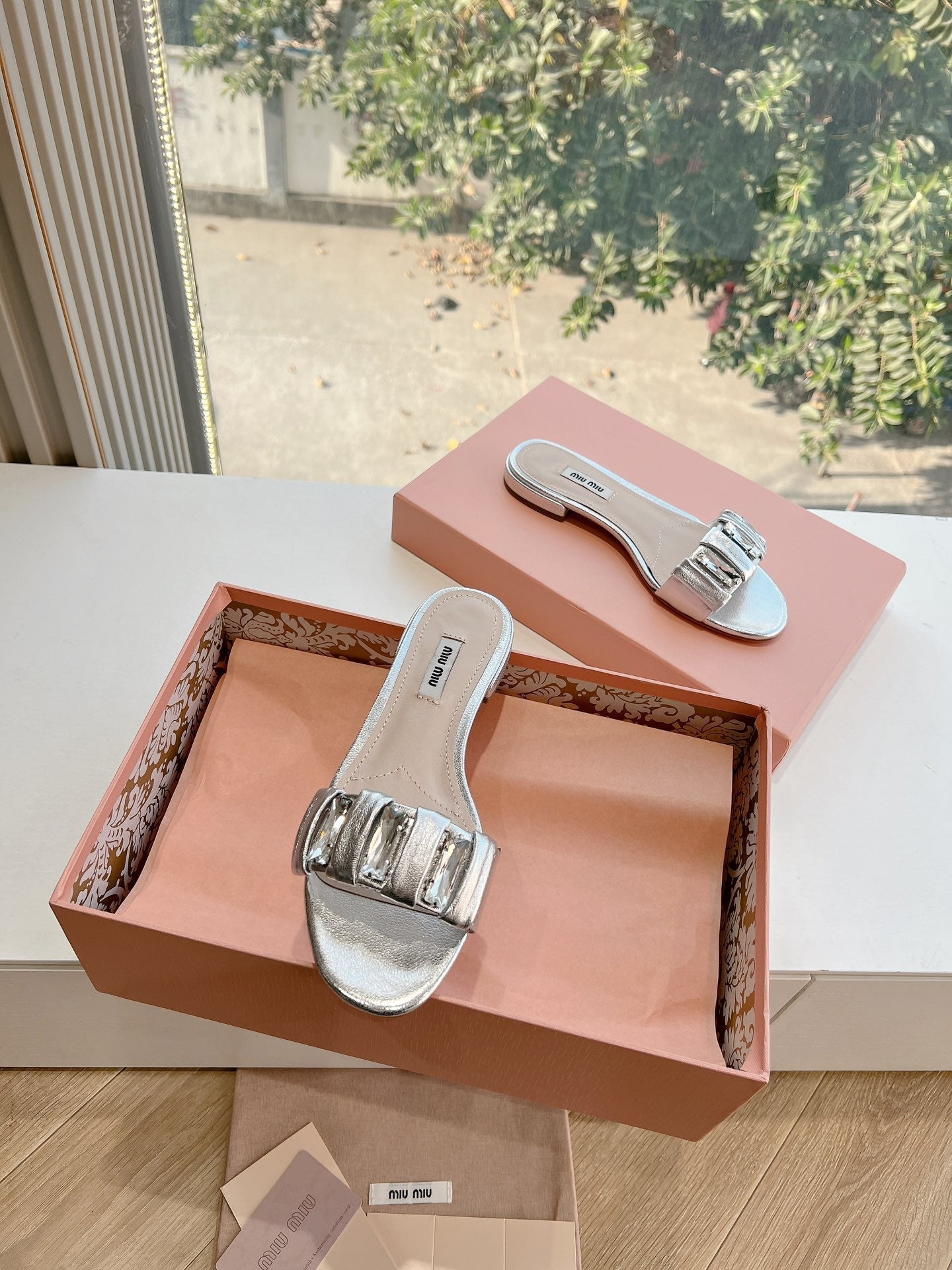 SLIDE SANDALS ATTACHED DIAMOND IN SILVER METALLIC LAMBSKIN