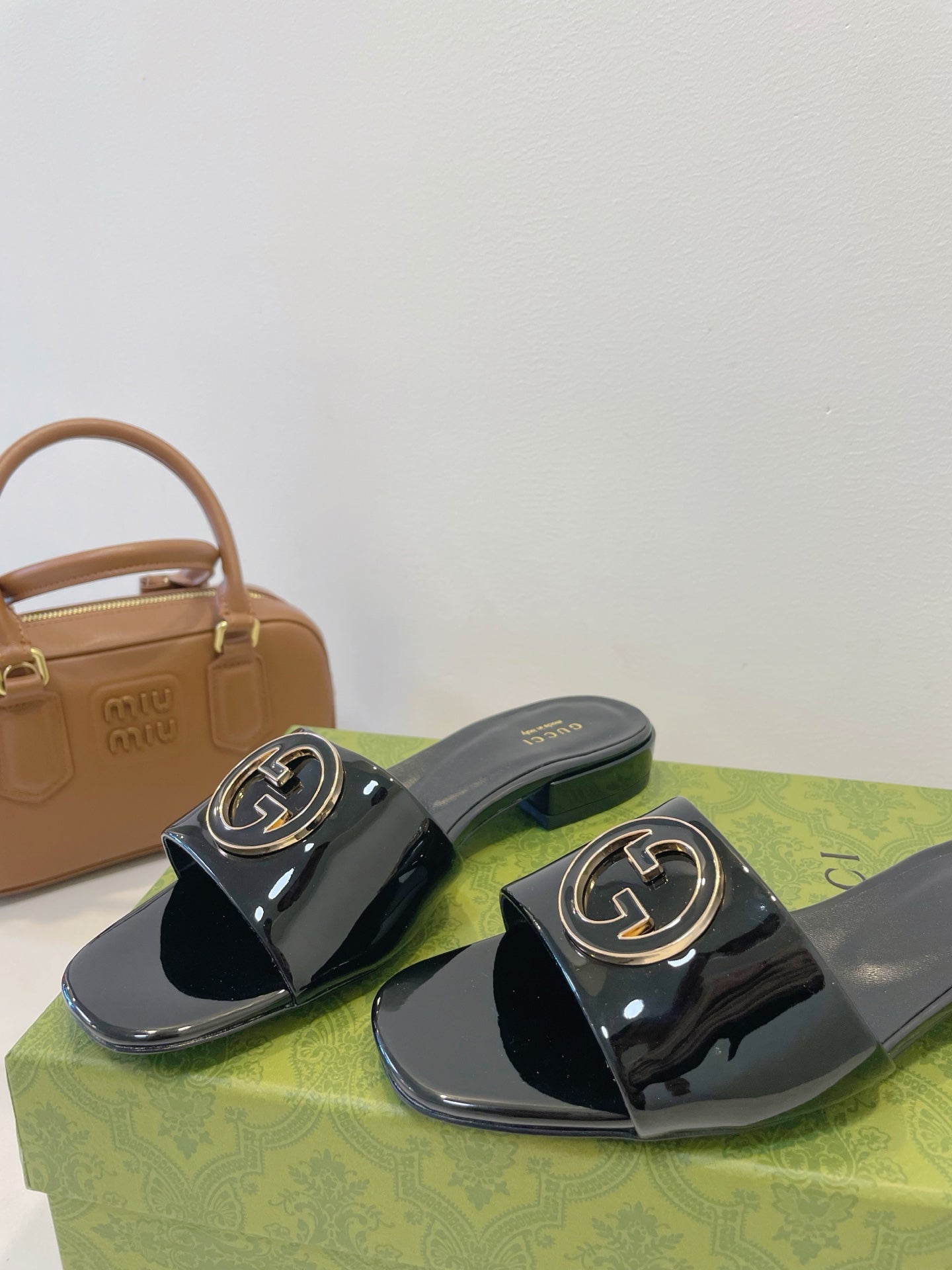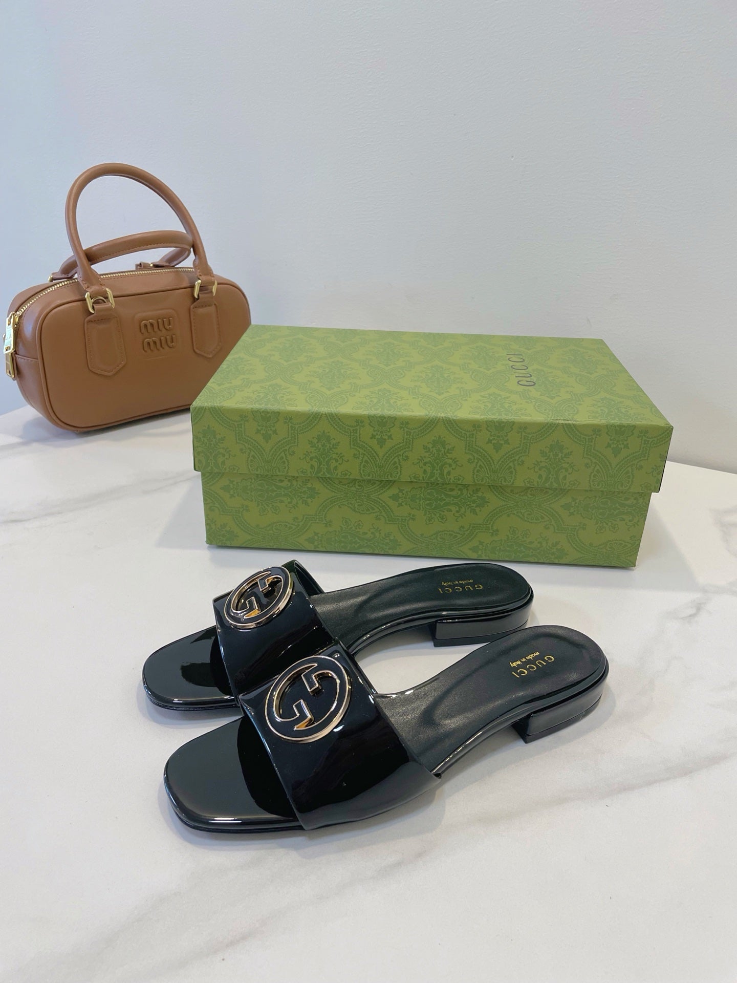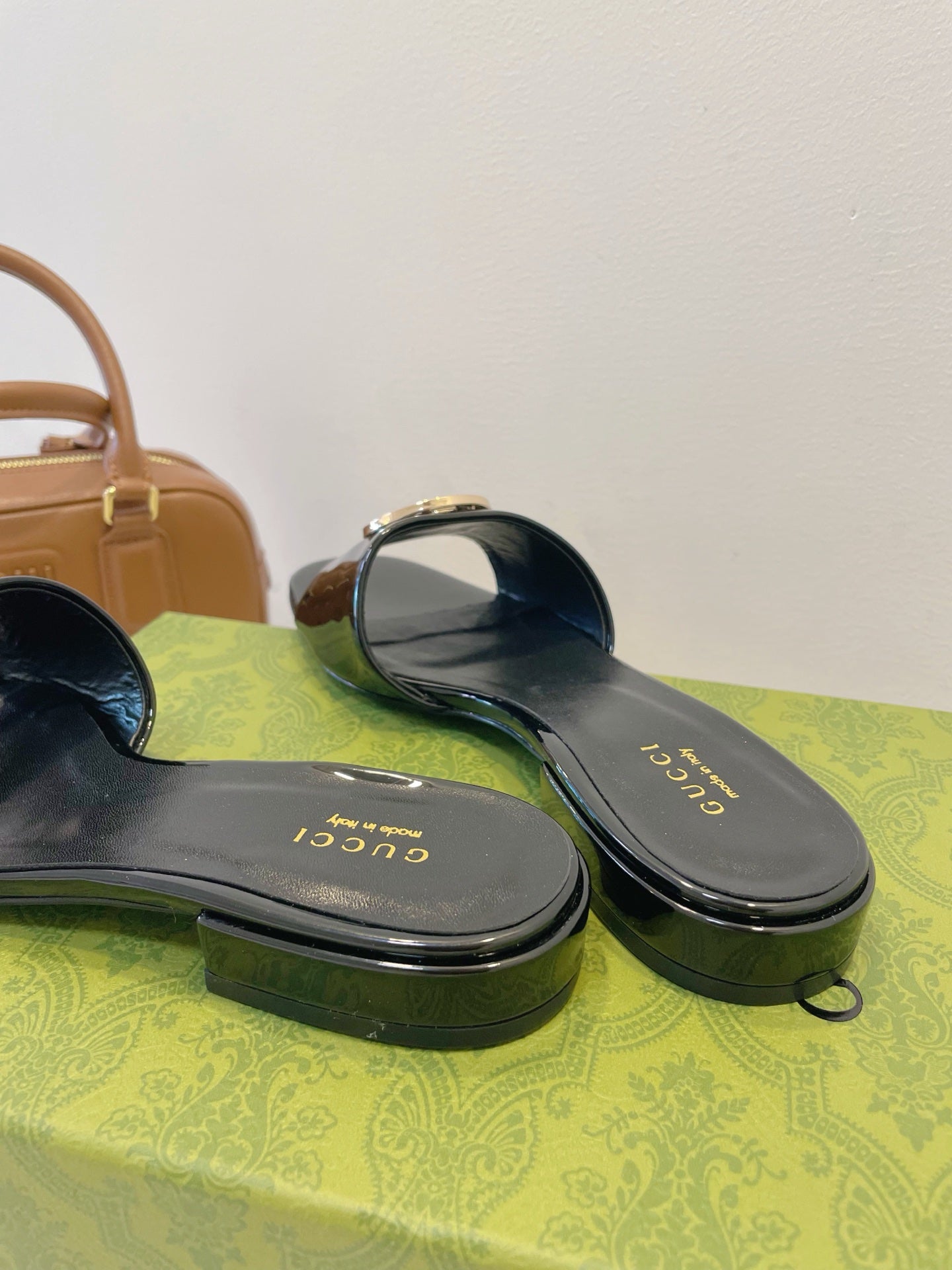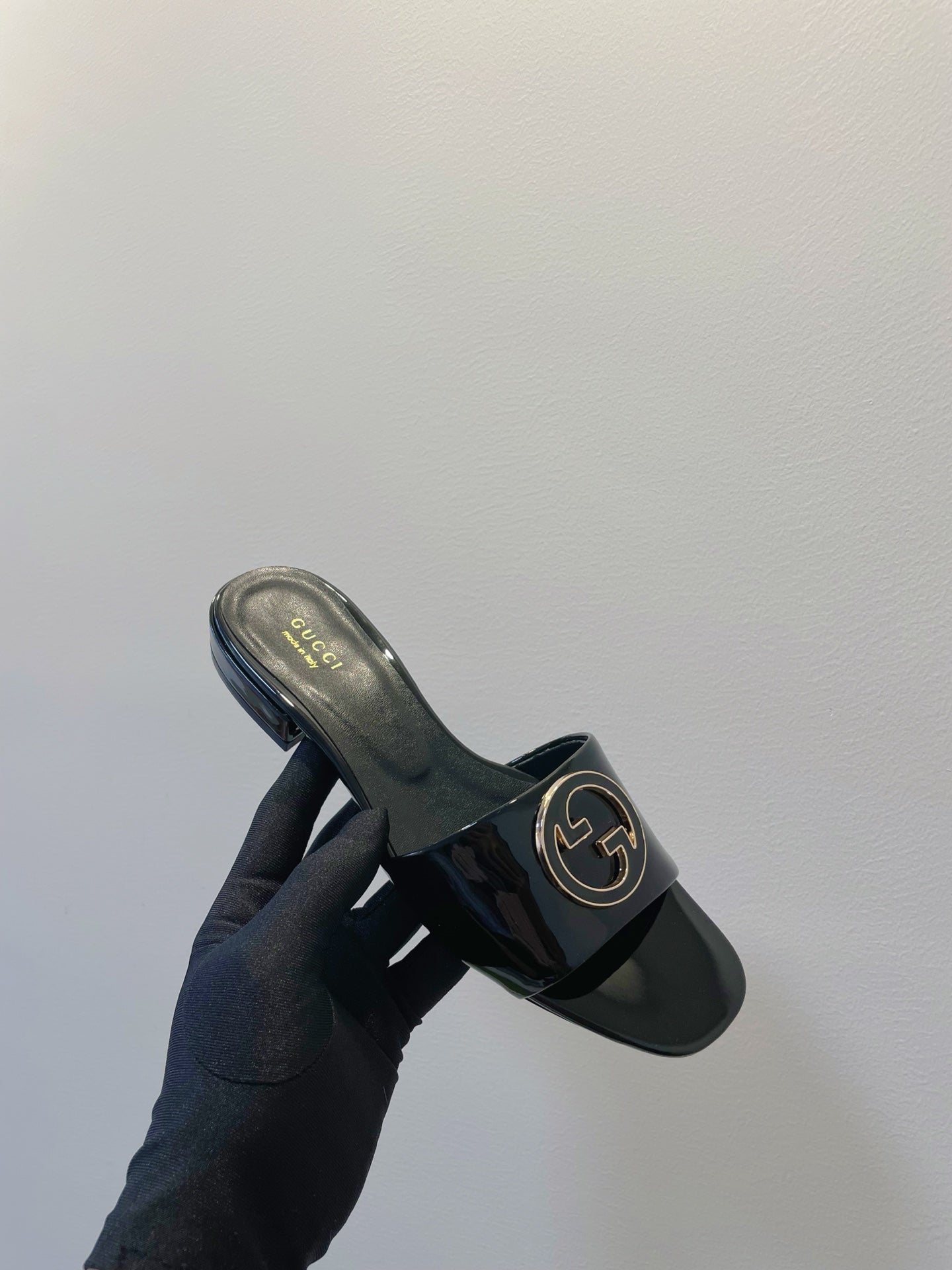 SLIDE SANDALS IN BLACK GLOSSY SHEEPSKIN ENAMELLED ROUND INTERLOCKING G