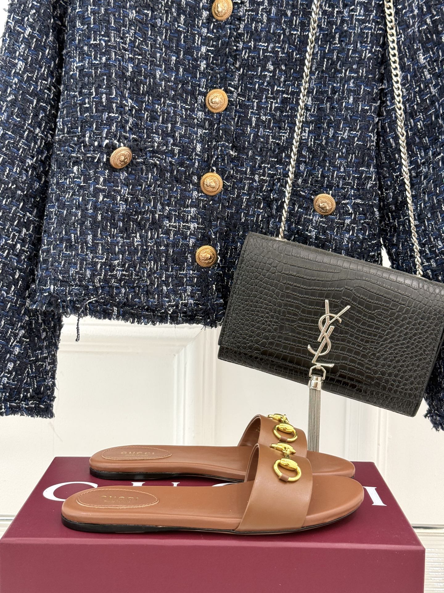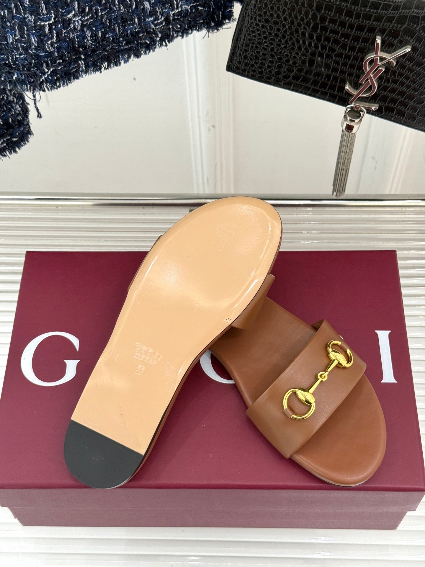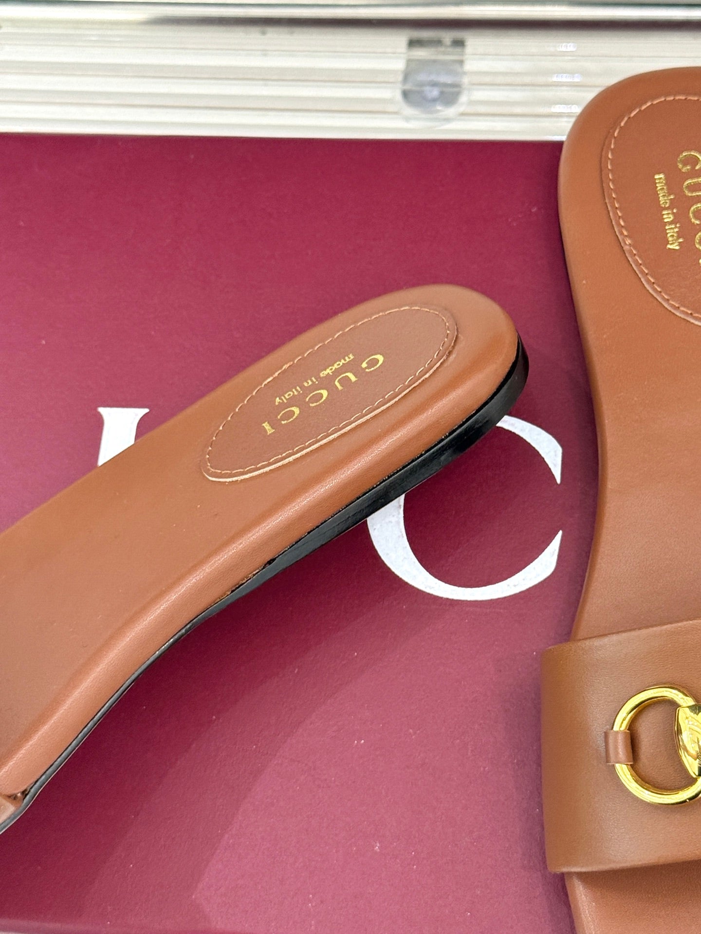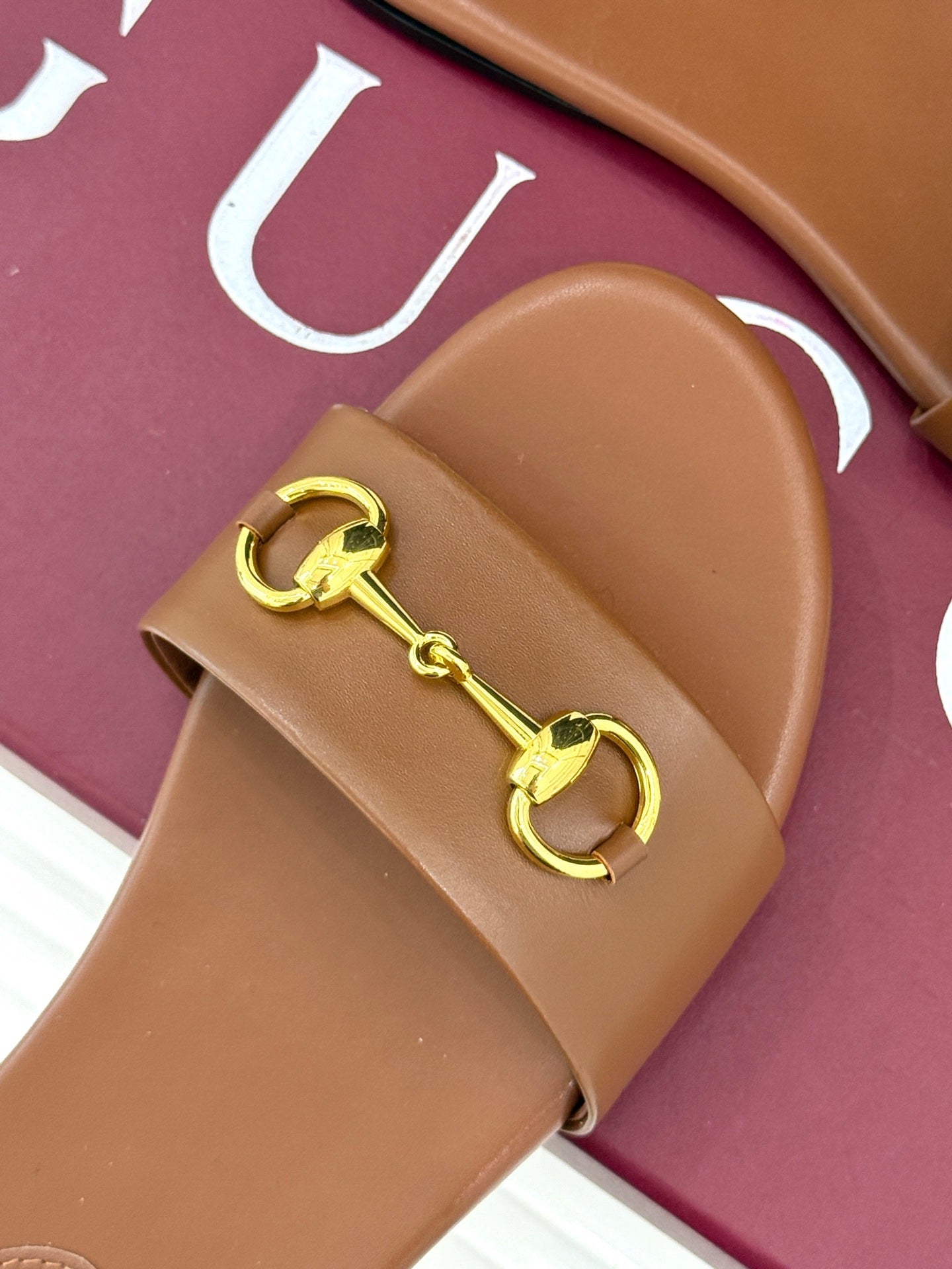 SLIDE SANDALS IN BROWN CALFSKIN WITH GOLD HARDWARE