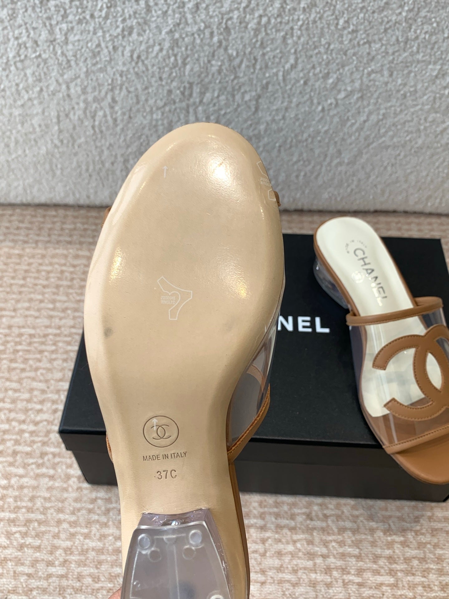 SLIDE SANDALS IN CINNAMON BROWN LAMBSKIN WITH TRANSPARENT PVC