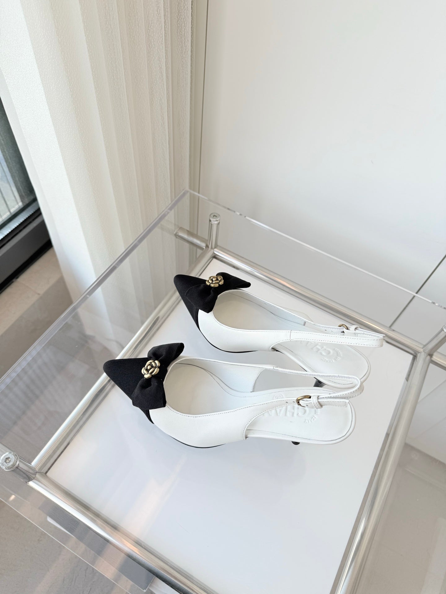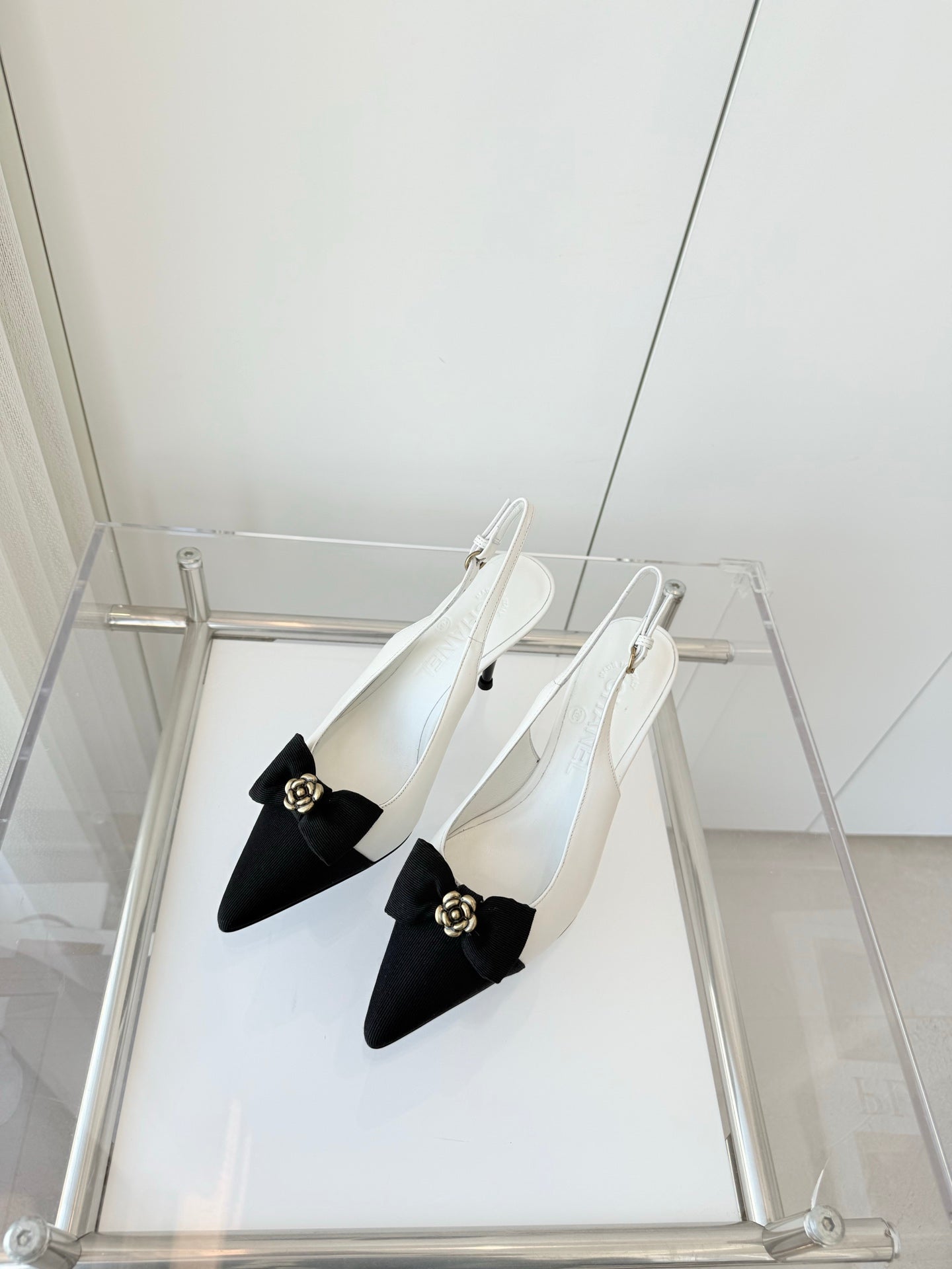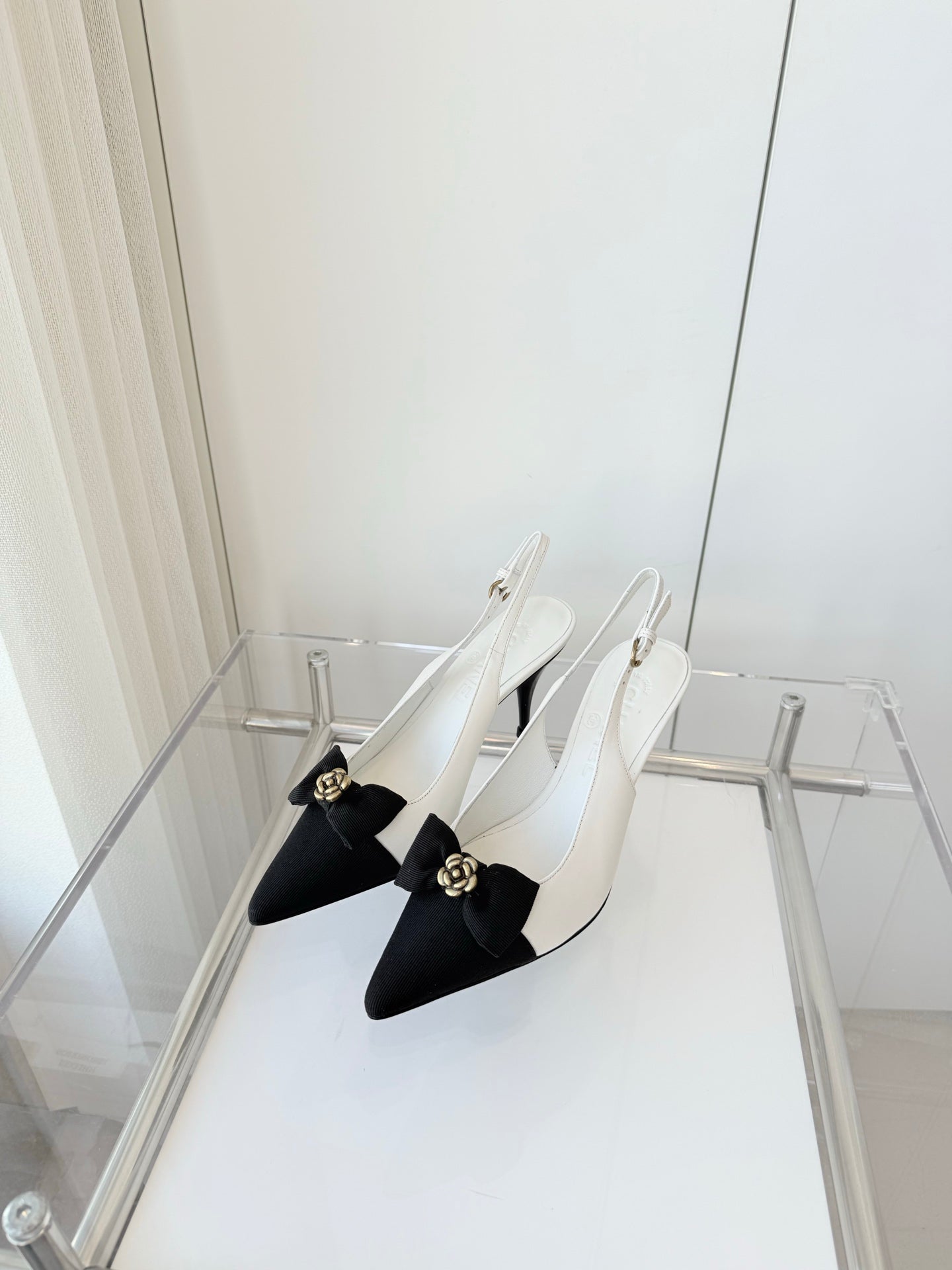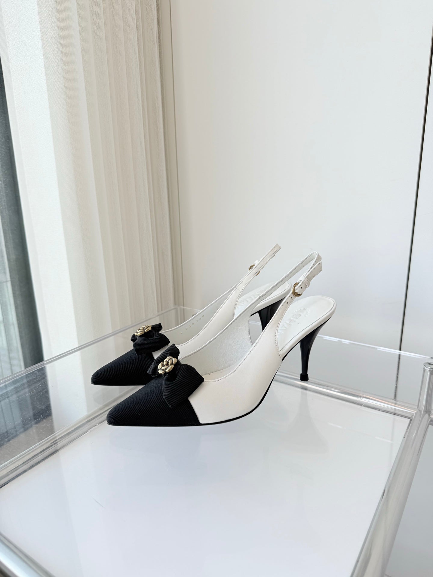 SLINGBACKS 80 MM IN WHITE CALFSKIN AND BLACK CANVAS