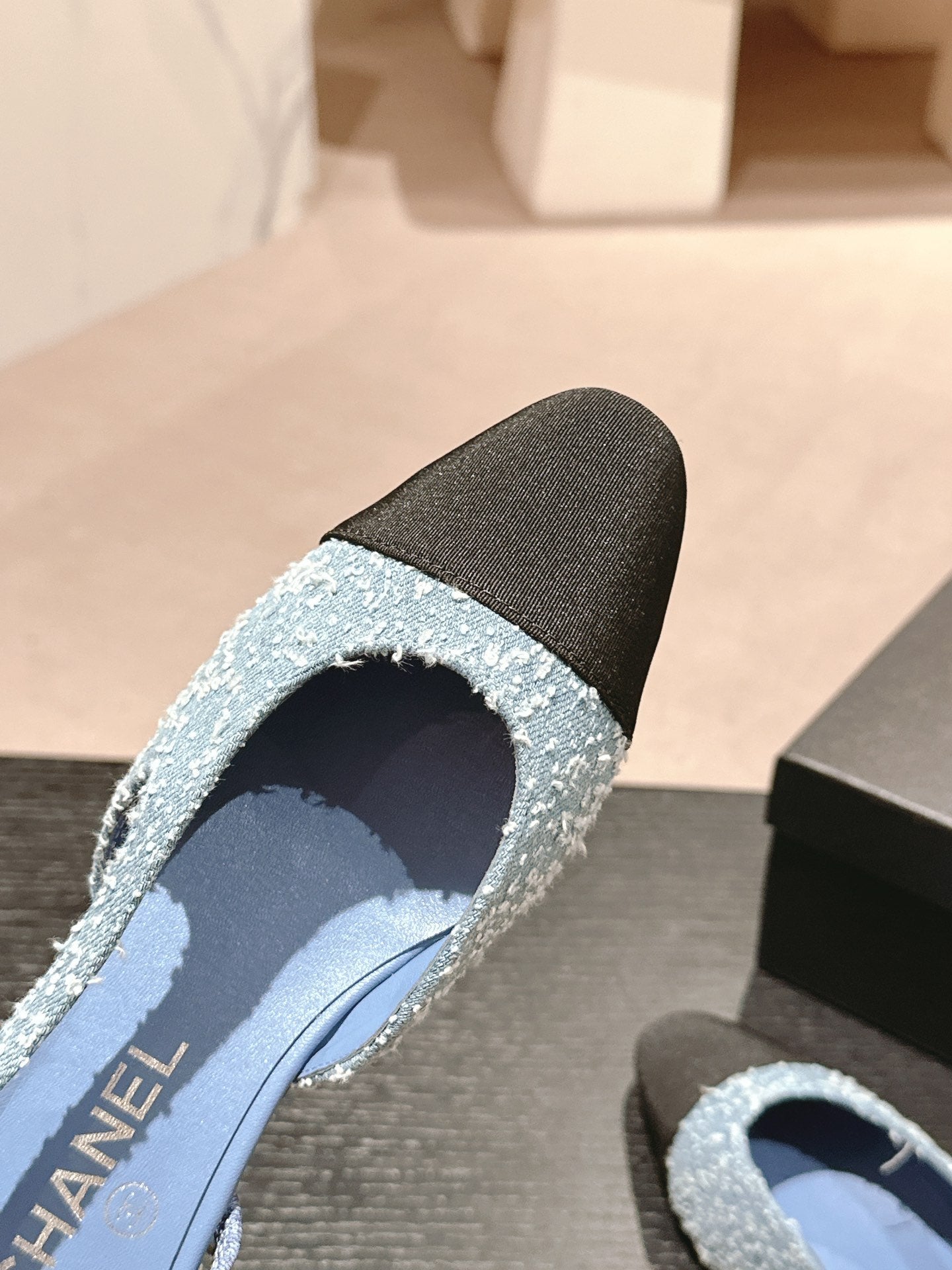 SLINGBACKS IN LIGHT BLUE DENIM AND BLACK SATIN