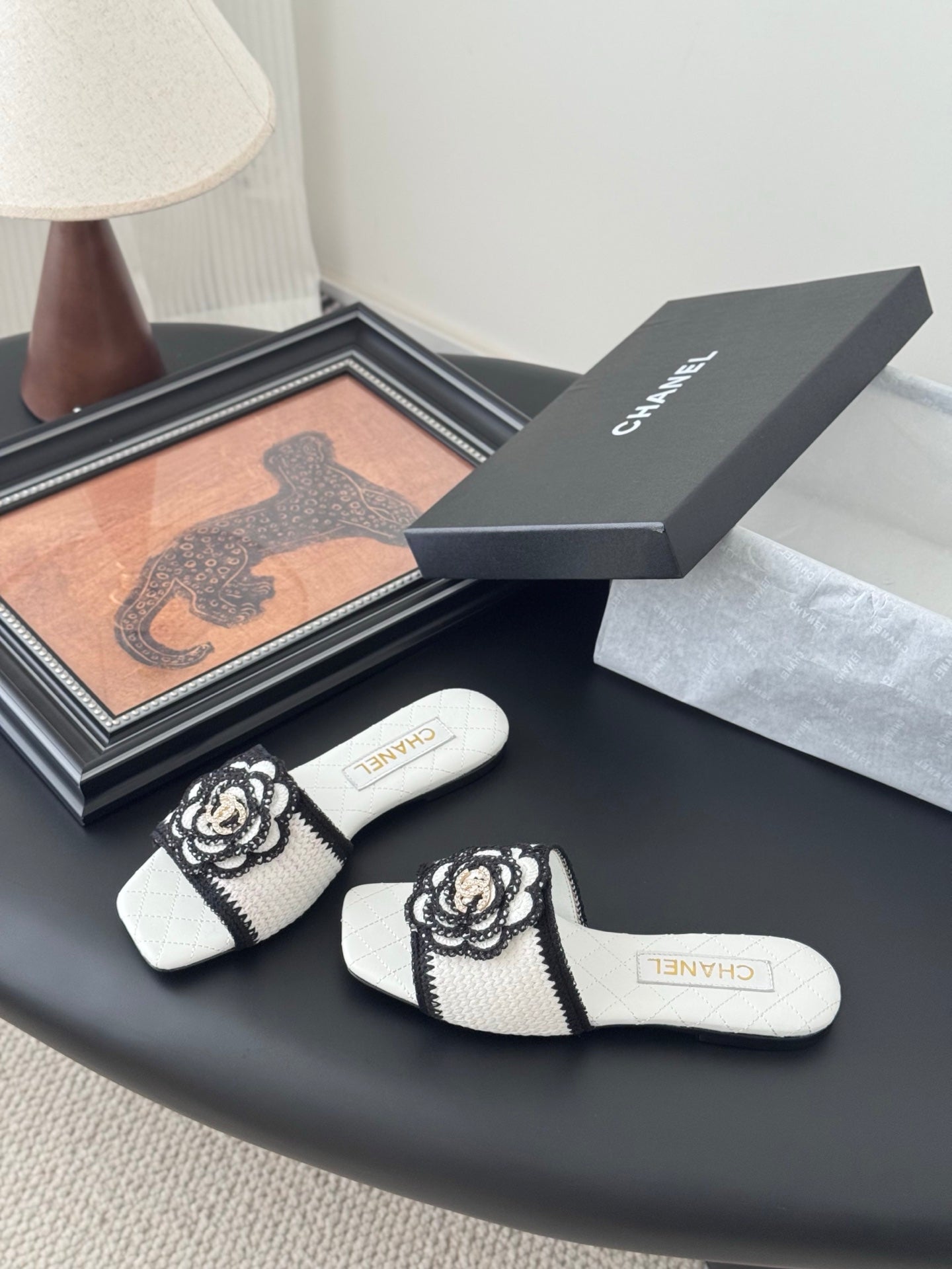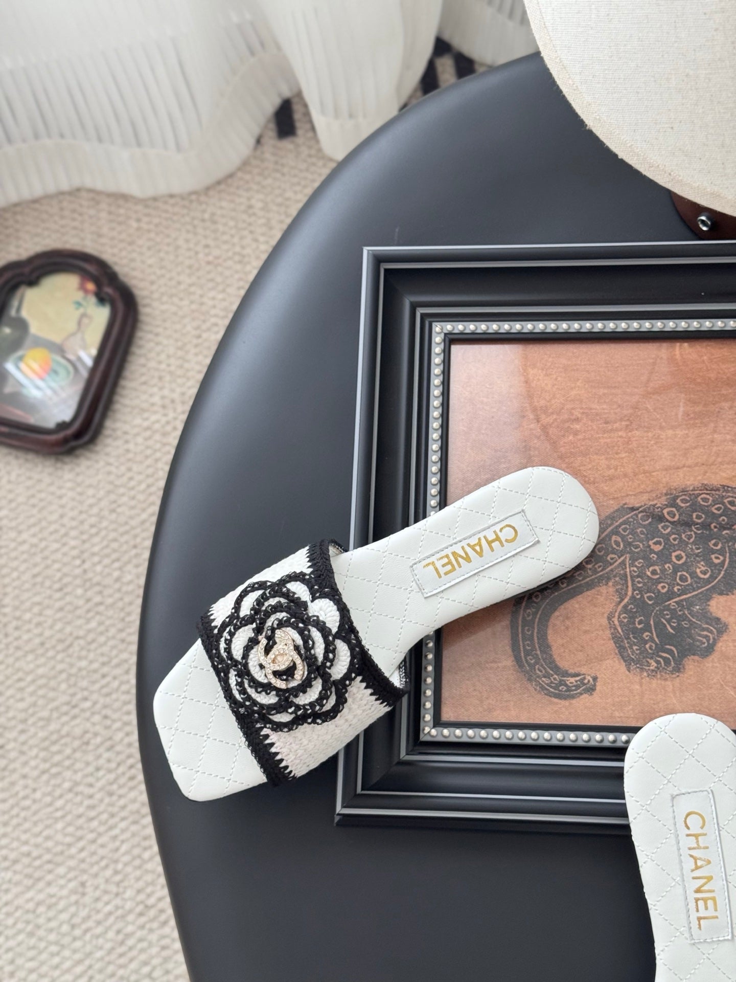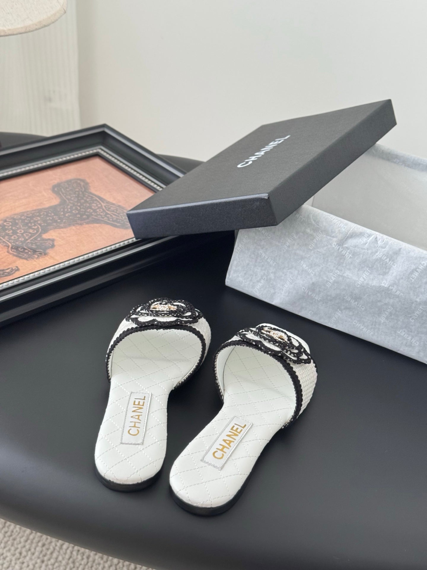 SLIPPER IN WHITE AND BLACK CALFSKIN MIX WOOL